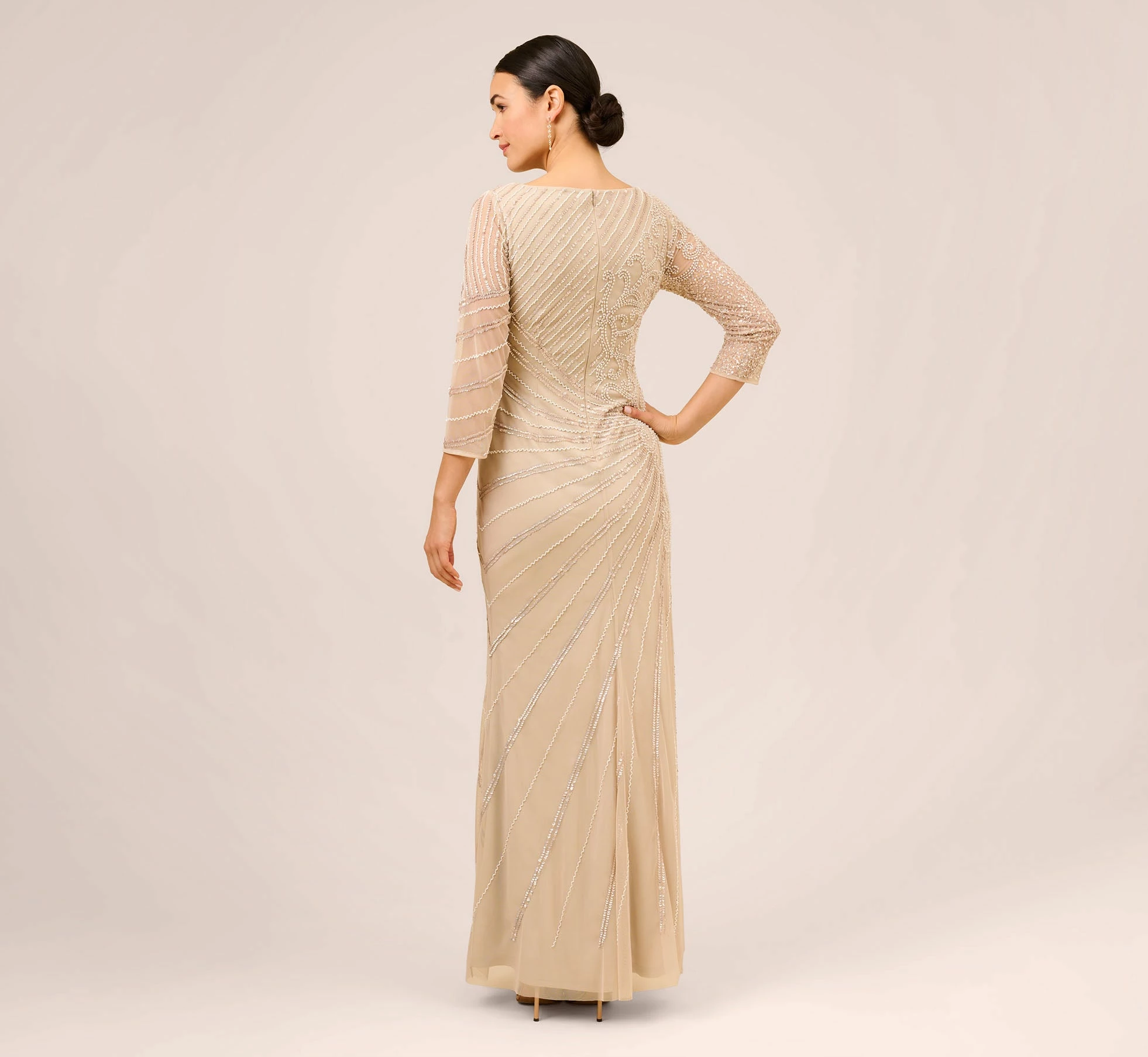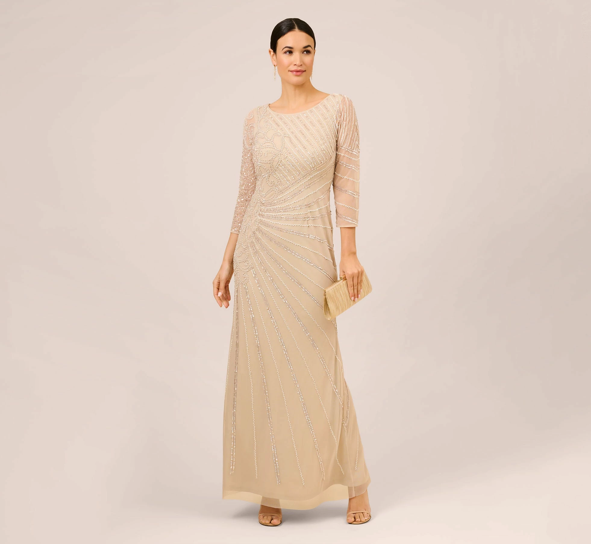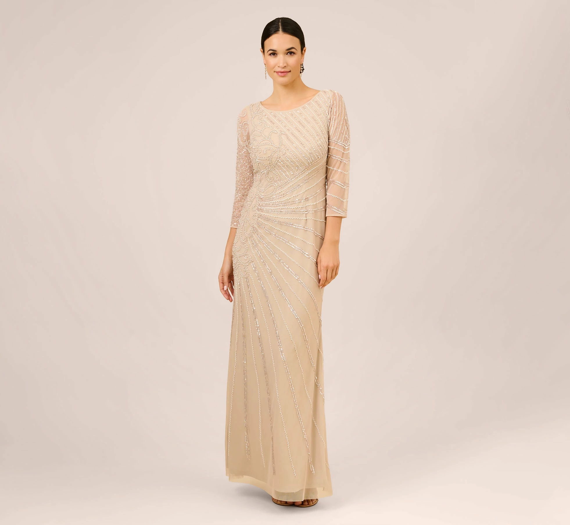 Stunning and glamorous and fit for the mother-of-the-bride or groom, our floor-sweeping gown grazes your figure and is finished with sparkling sequins and pearl embellishments. Details: modern bateau neckline and three-quarter sleeves.