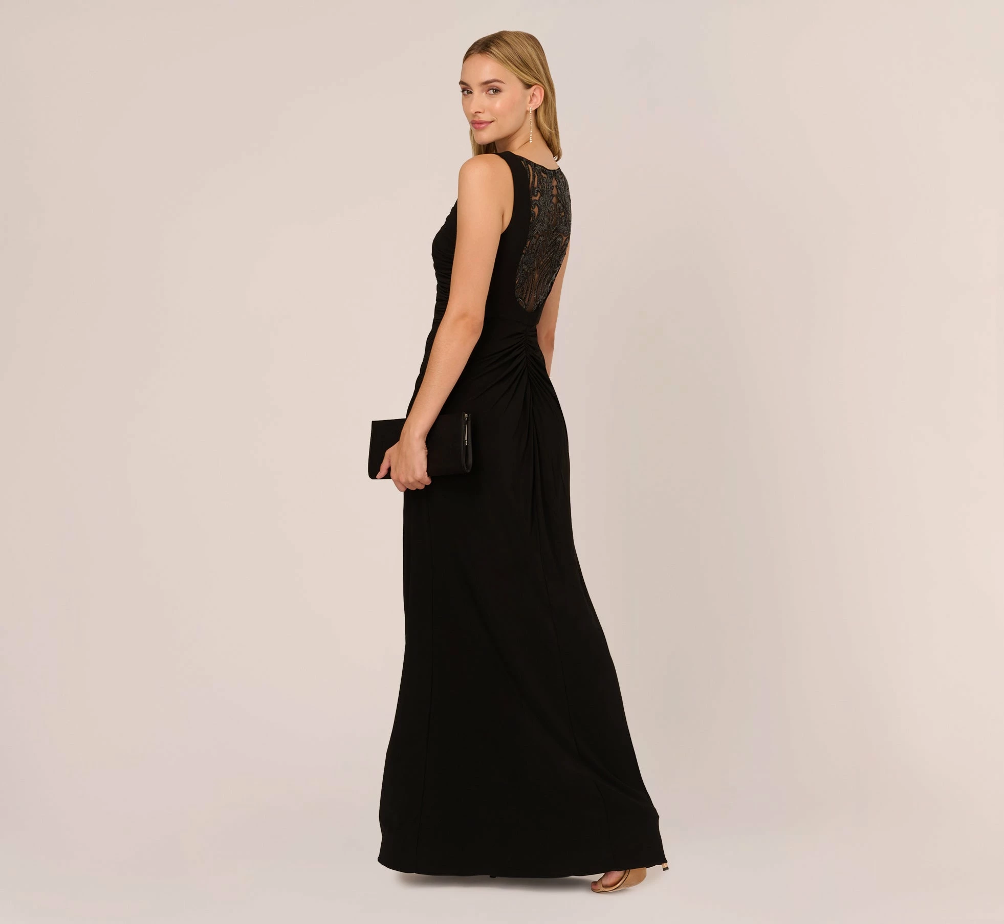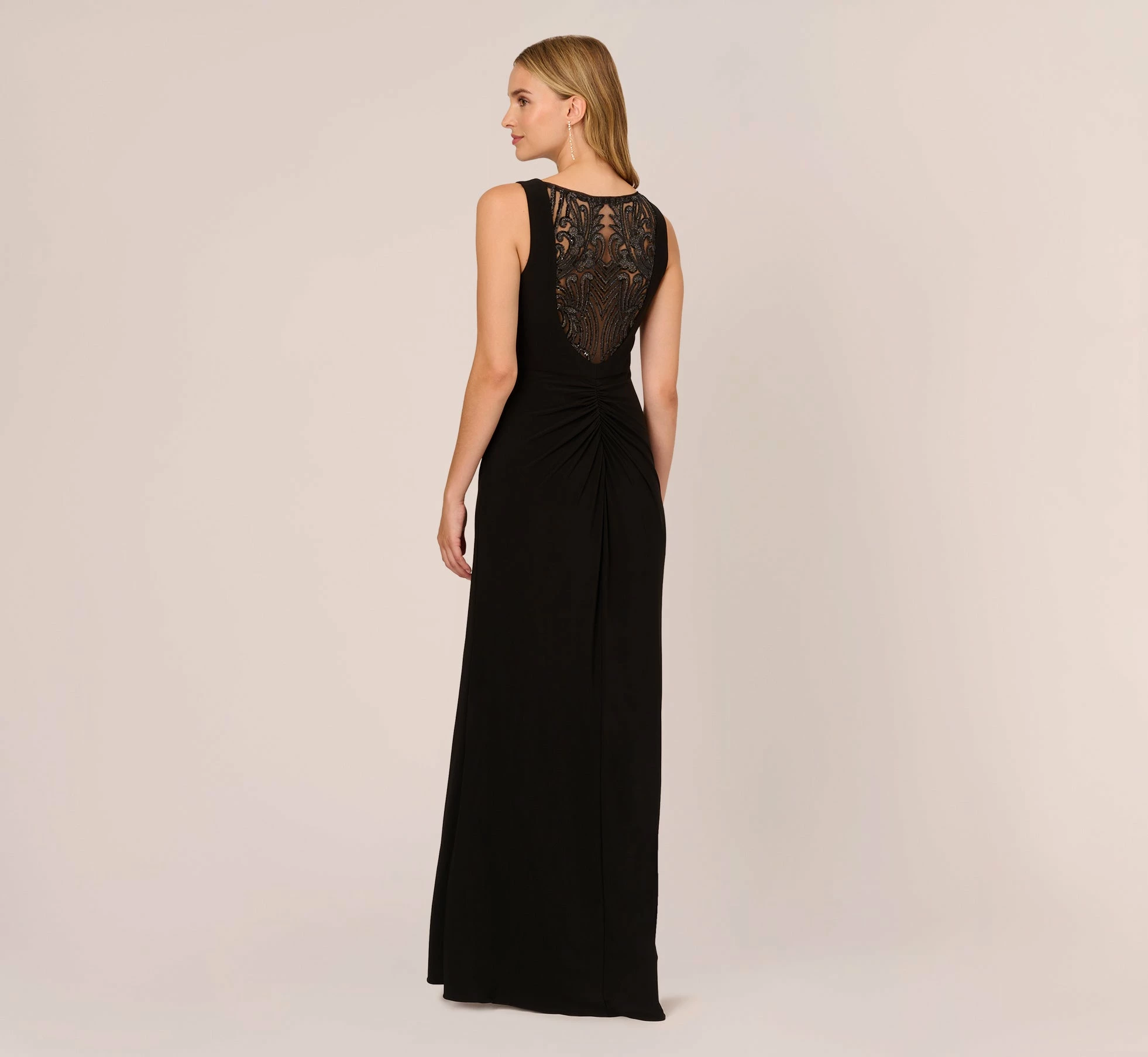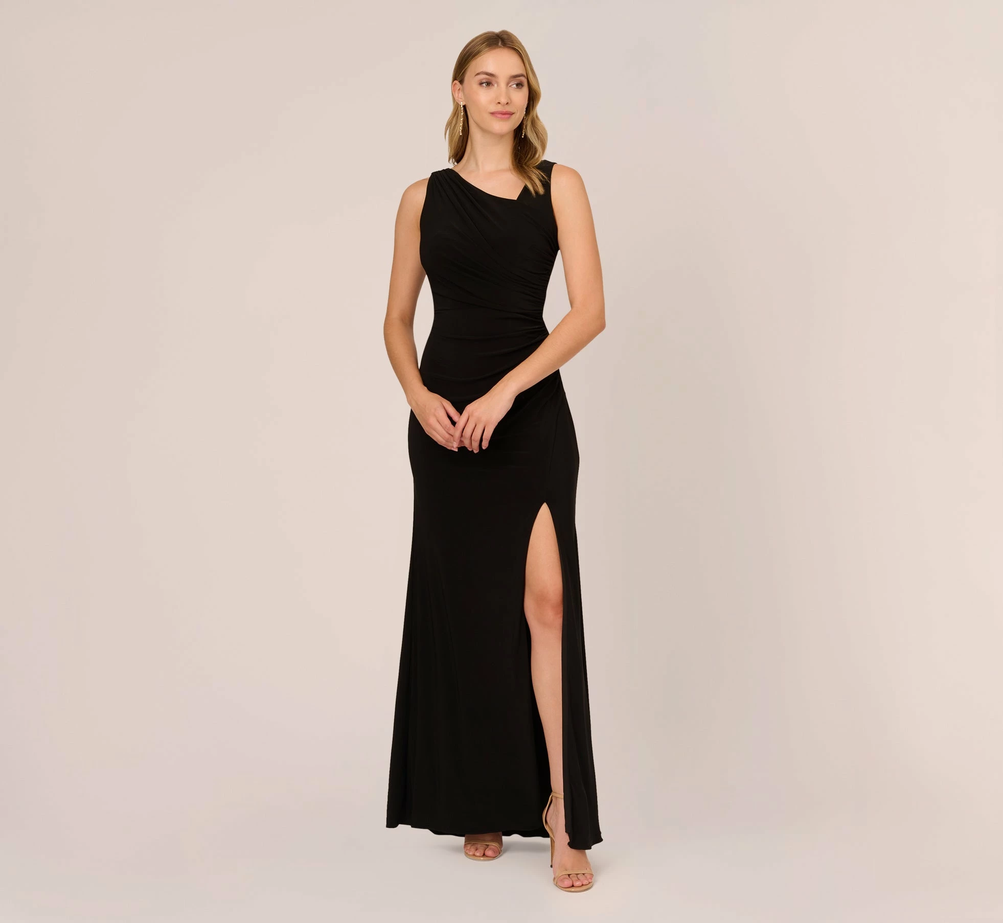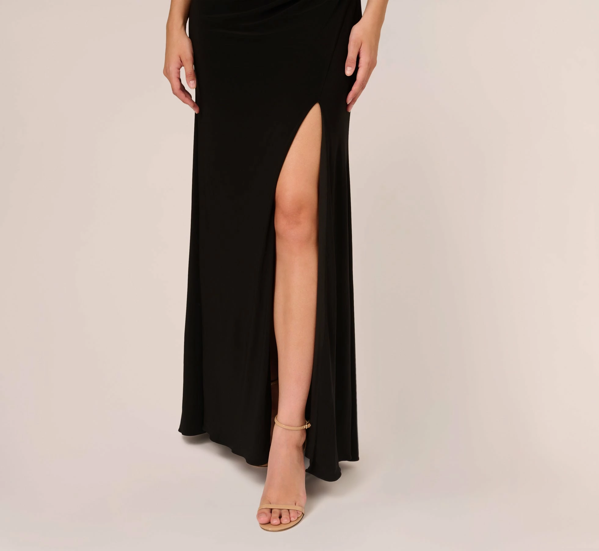 Beautiful coming and going, our sleek and chic floor-grazing gown in a comfortable stretch jersey knit is designed to turn heads at all your social events. We’re obsessed with the flattering asymmetrical neckline, deep side slit for ease of movement and the elaborate illusion embroidery with hand-sequined accents on the back. We’ve made this dress with ruched details for added dimension and texture. An easy pick for all your special occasions.