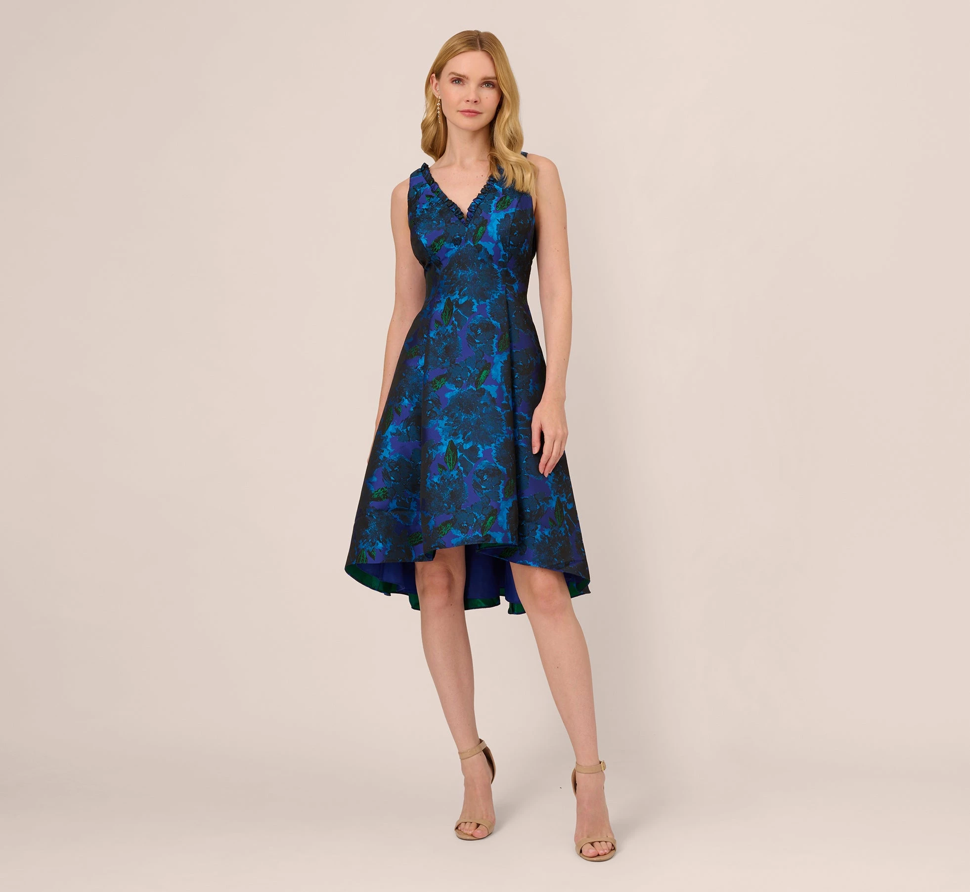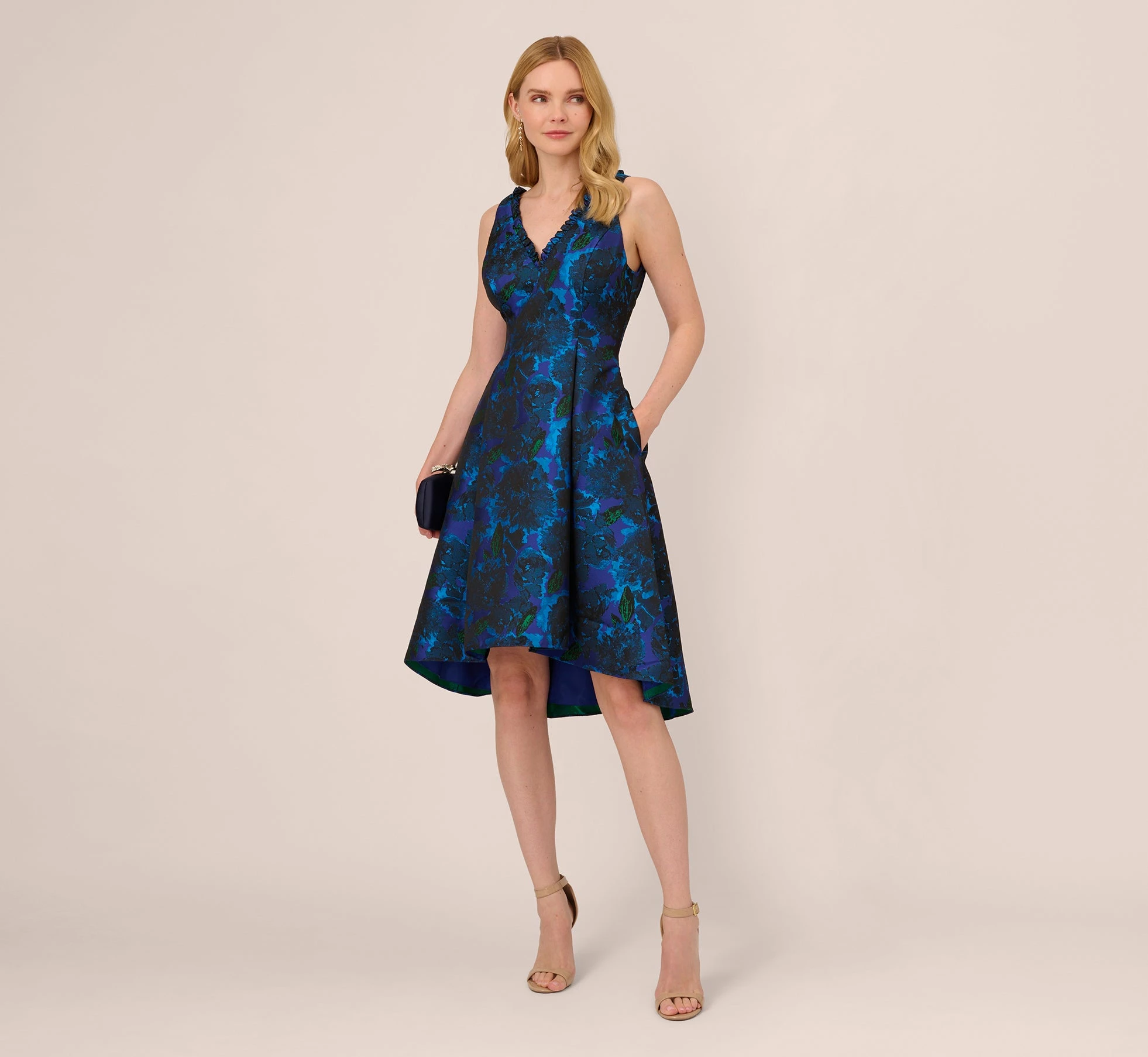 Timeless details and luxurious fabric make this sleeveless jacquard dress a classy styling. This party dress features a sleeveless surplice bodice with deep v-neckline, a high-low pleated skirt, and ruffled details at the neck. Crafted from a metallic floral jacquard, this high low dress is a luxurious look and has convenient pockets. A zipper back closure and v-back complete this cocktail dress. Styled for a shower with nude heels or for a semi-formal wedding with metallic accessories, this jacquard dress is a versatile look.