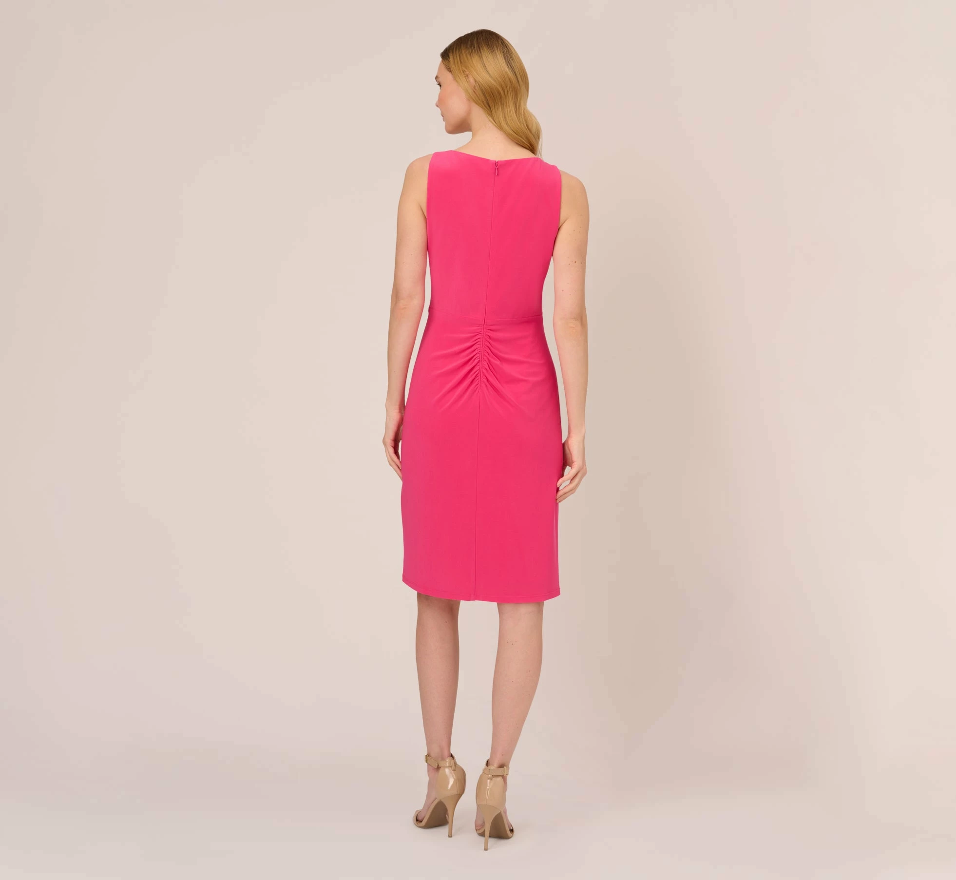 Start your day on an effortless note when you have this sheath dress in your closet. This short dress features a sleeveless bodice with v-neckline and figure-flattering draped details throughout. A surplice styling gives this sleeveless dress a faux-wrap look. Crafted from stretch-knit jersey fabric, this sleeveless dress is a comfortable style. A zipper closure and shirred details at the back complete this dress.