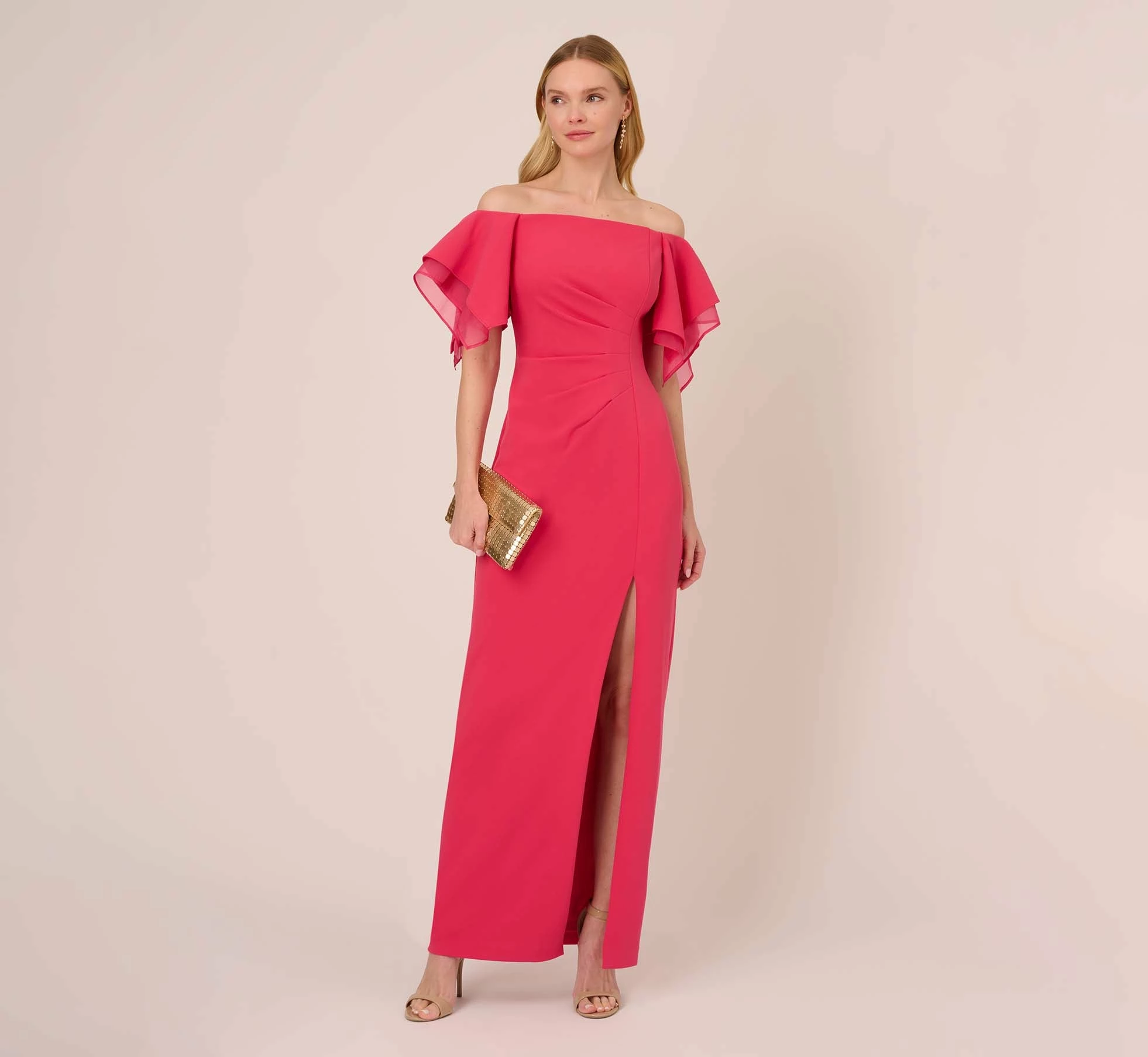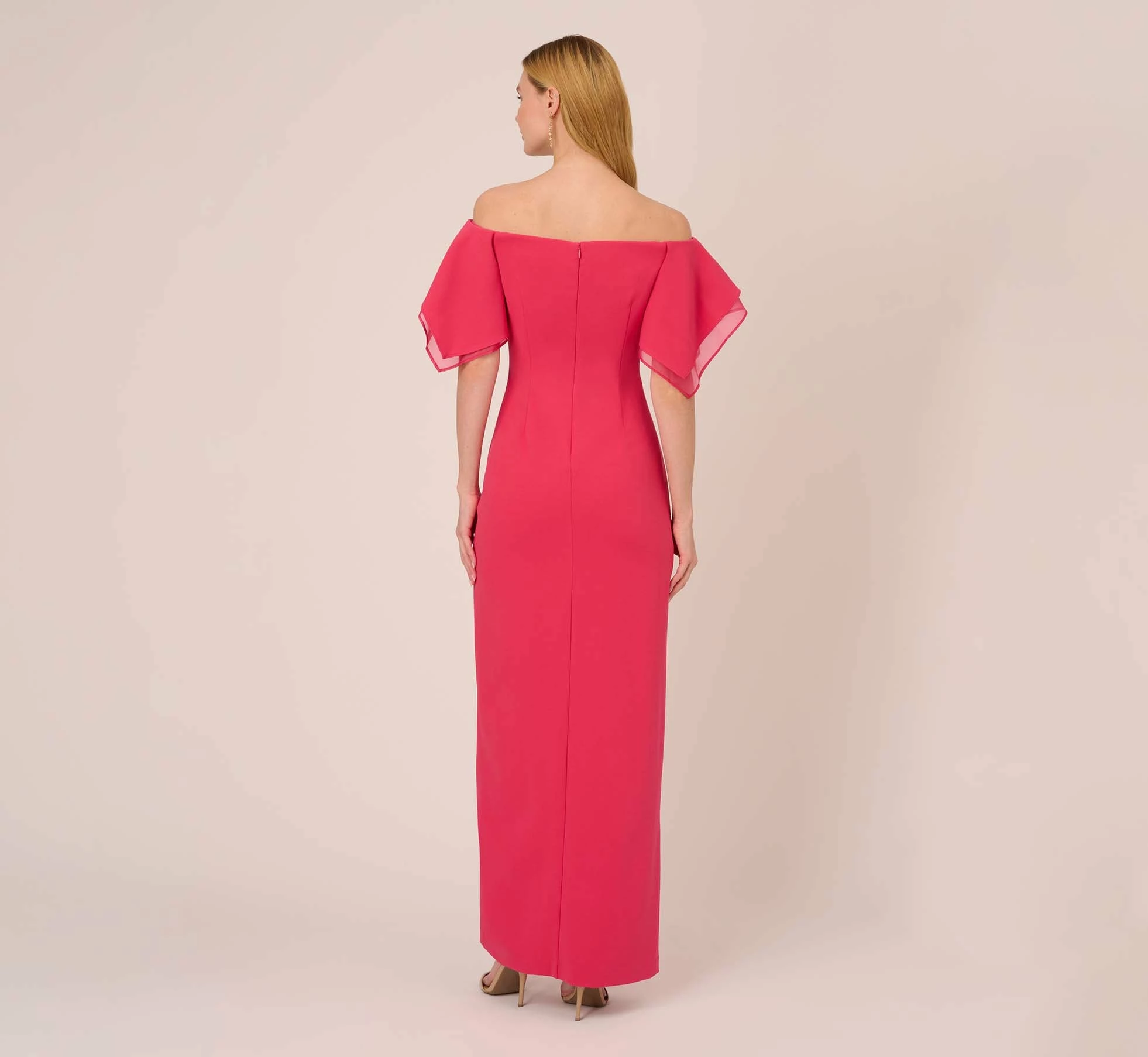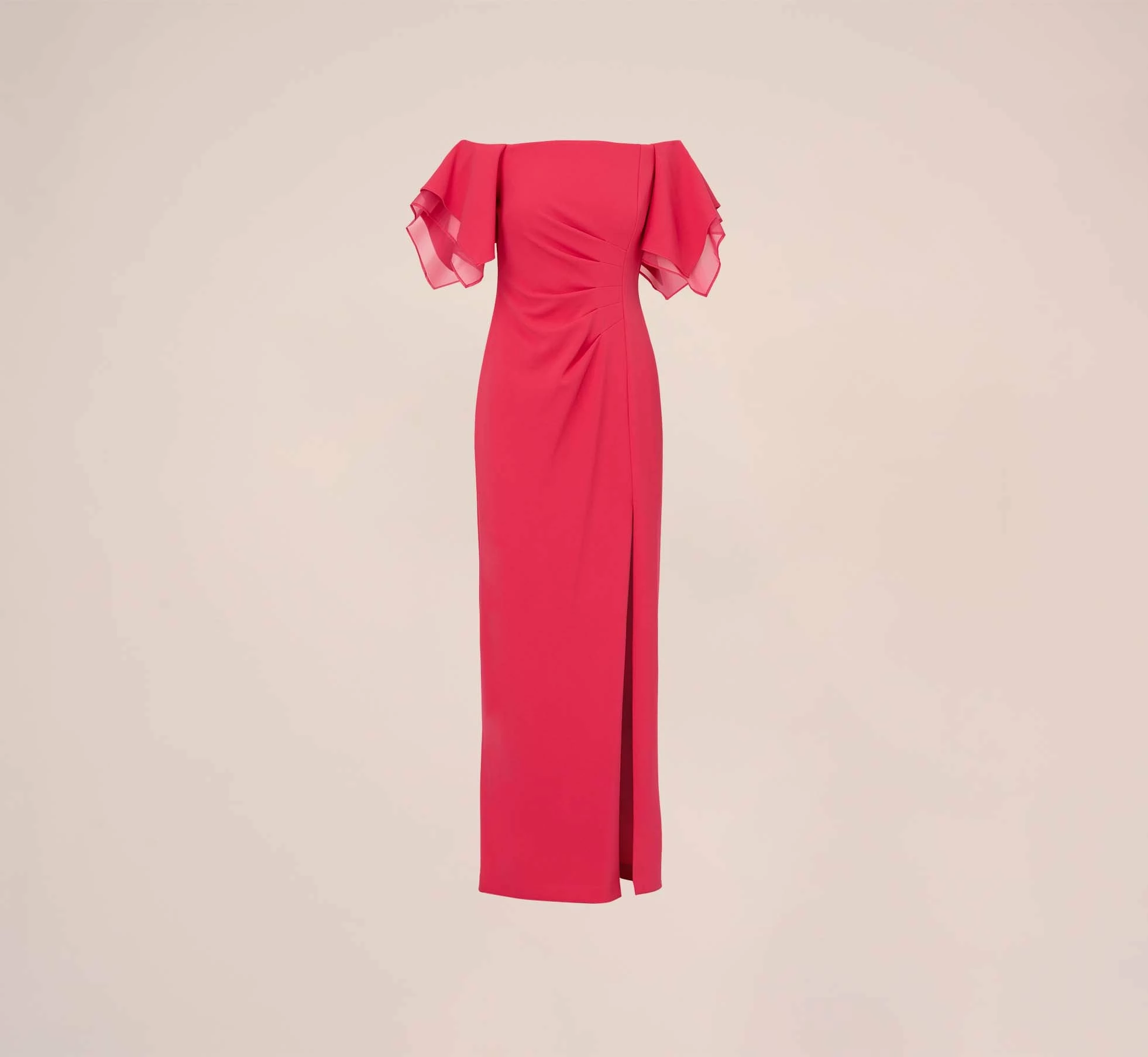 Dramatic tiered crepe and organza sleeves add feminine flair to this striking off the shoulder gown. Our column gown is crafted of knit crepe fabric with a touch of stretch to give you a curve-hugging fit with a beautiful drape. Designed with side seaming and pleated detailing for added structure. Finishing with slit for ease of movement. Back zipper with hook and eye closure. An elegant choice for mothers-of-the-bride or groom, bridesmaids and black-tie gala attendees.