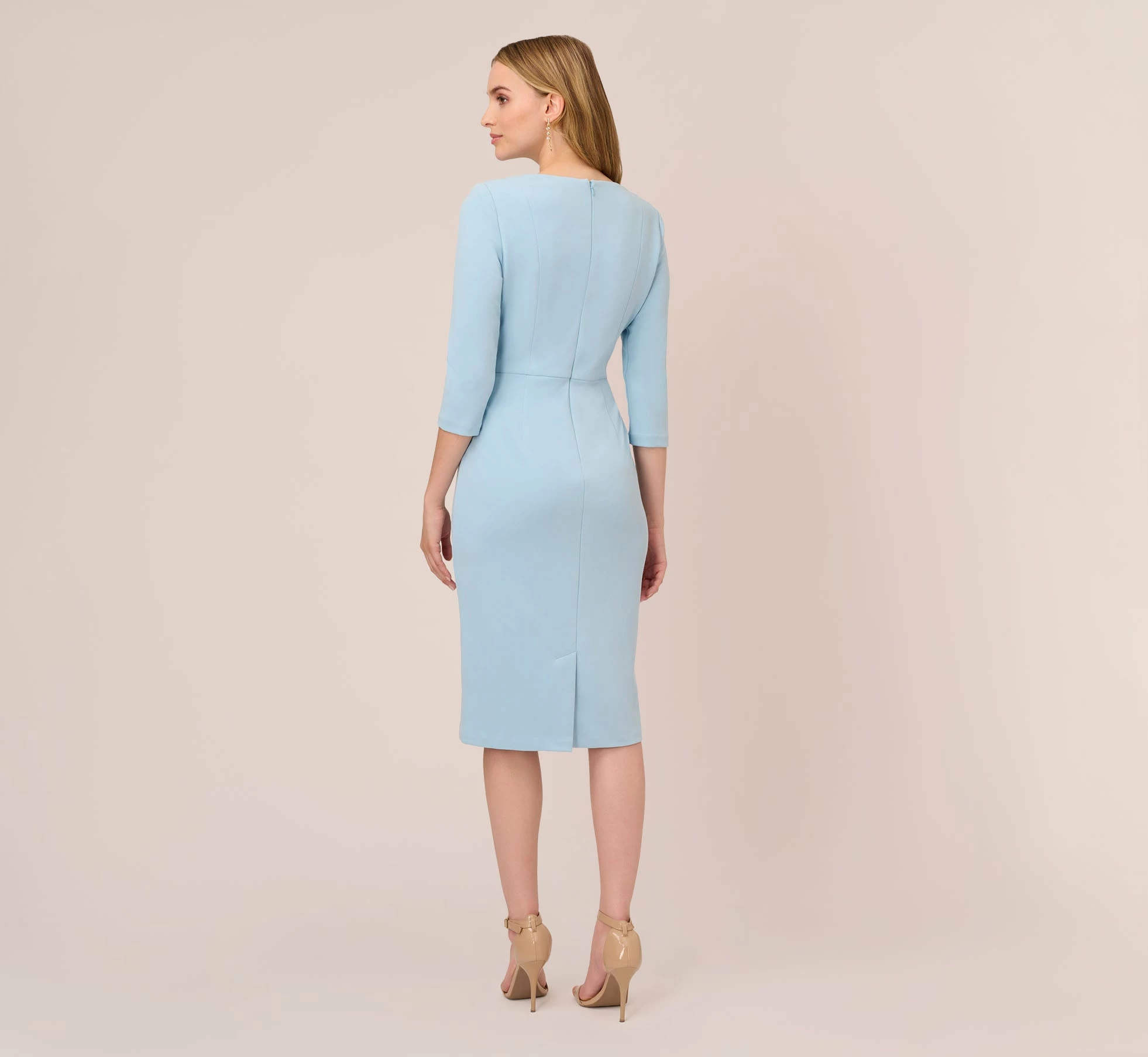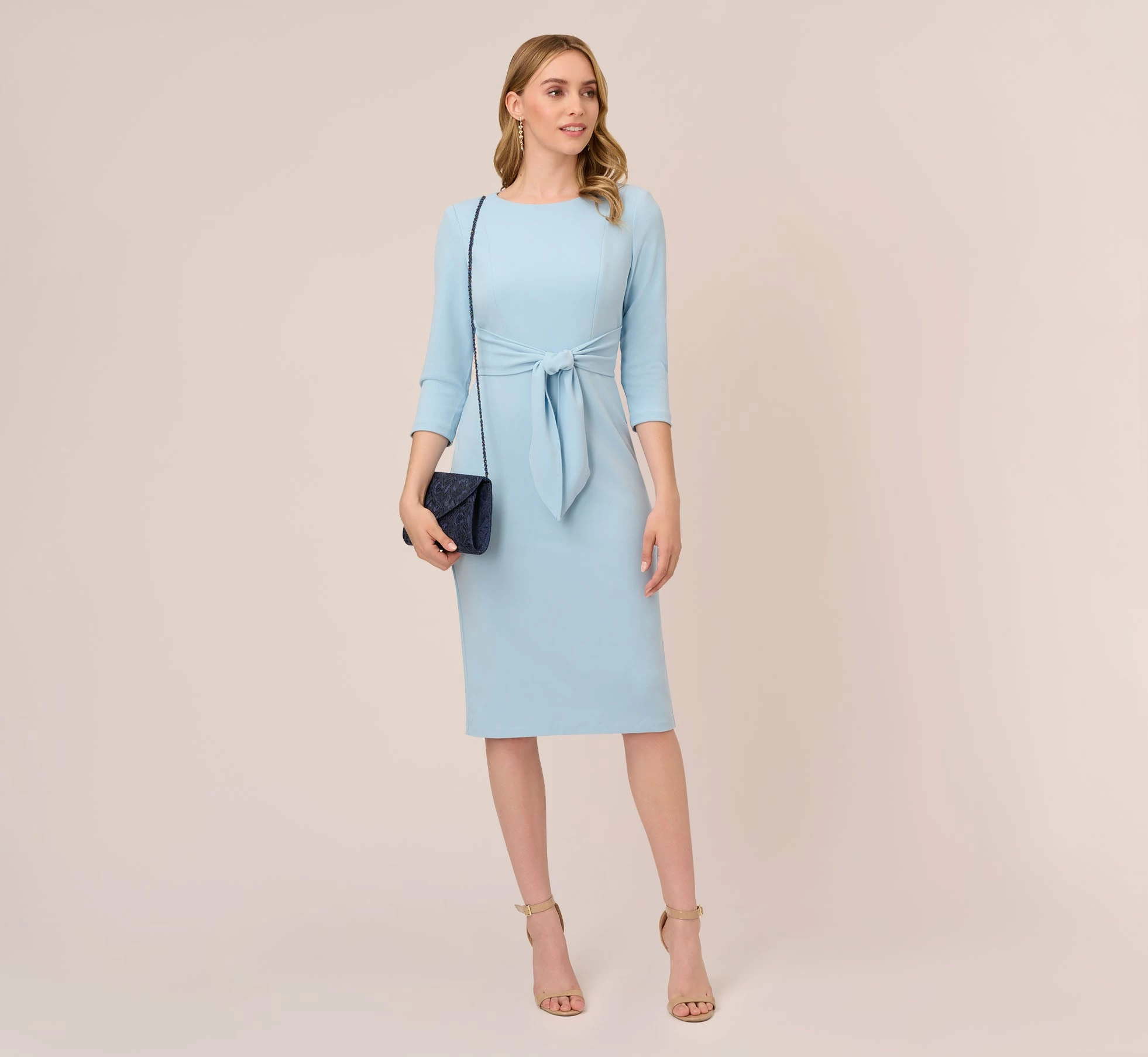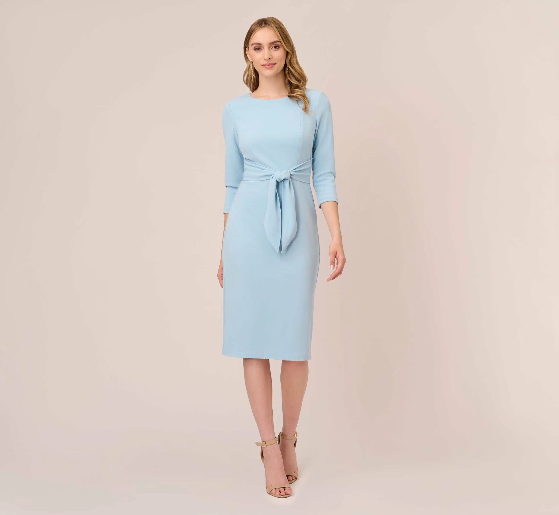 Modern yet sophisticated, this dress will make your day. This day dress features a boat neckline, three quarter sleeves, and a fitted sheath skirt. A self-tie bow at the waist accentuates the figure and is adjustable to the figure Perfect from the office to bridal showers to brunch, this sweet midi dress is the picture of elegance for any event. Crafted from crepe fabric, this dress has some stretch and offers a zipper closure at the back. Add a clutch and stud earrings to complete this effortless dress.