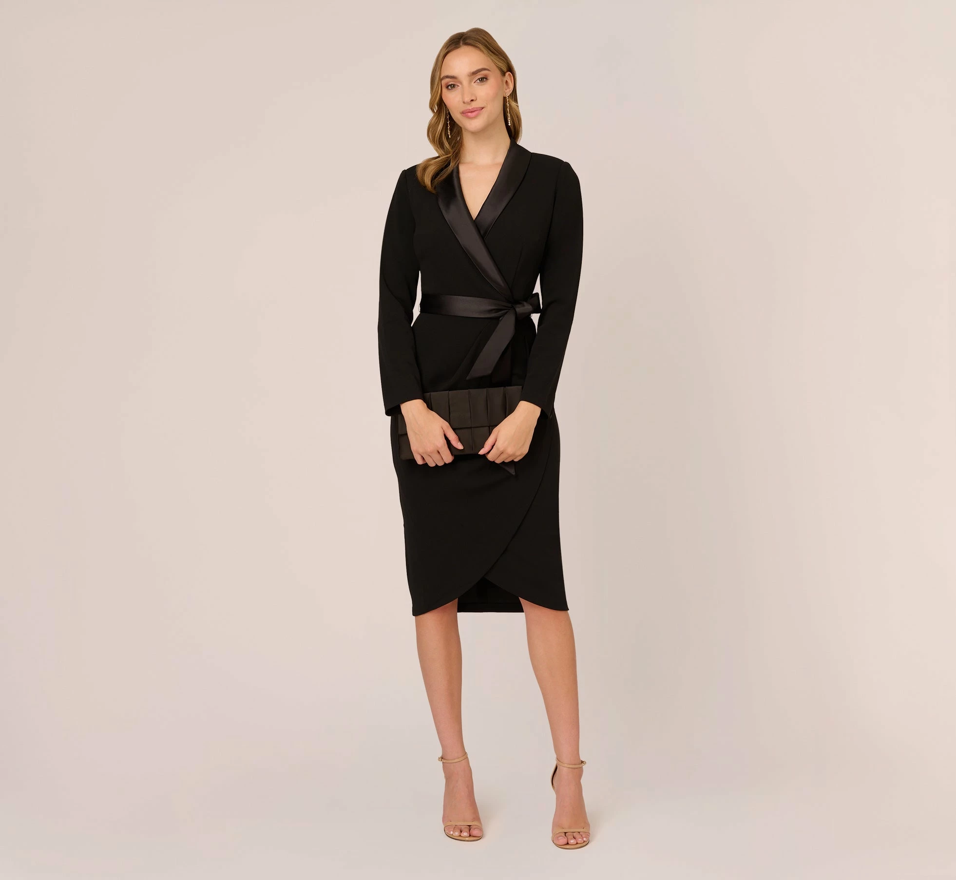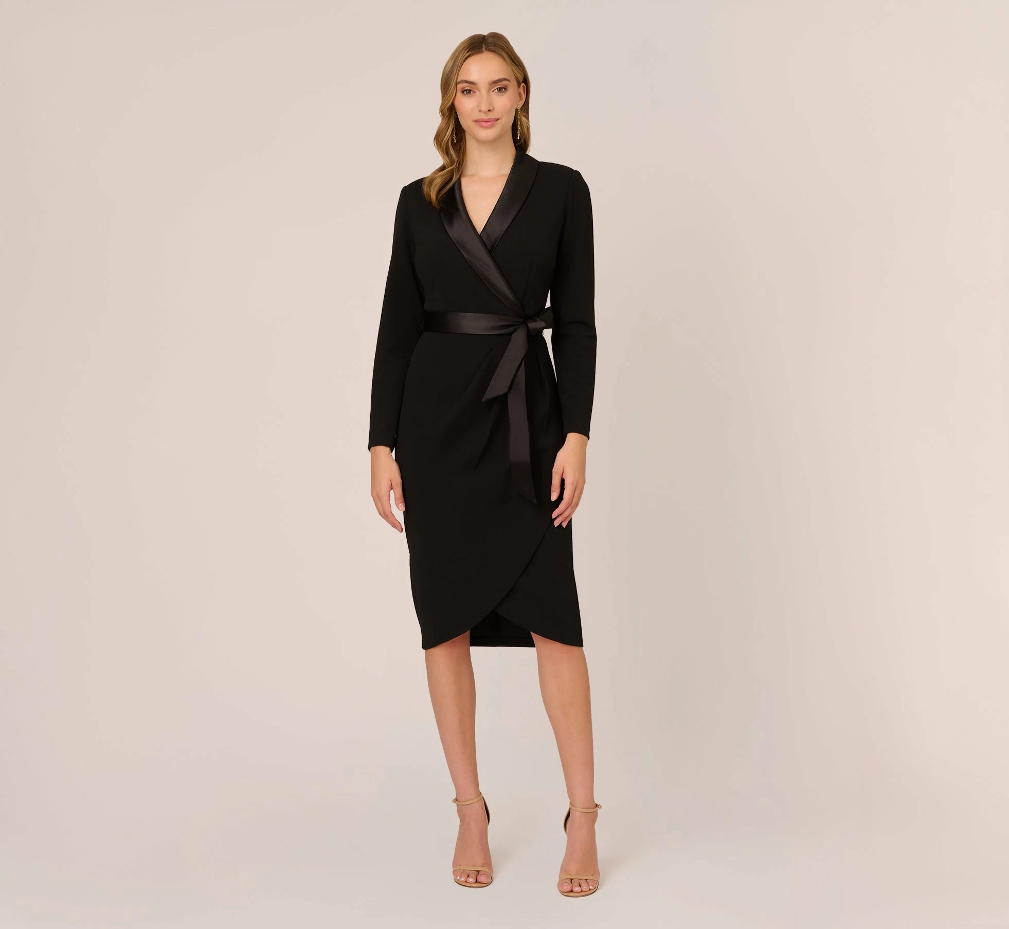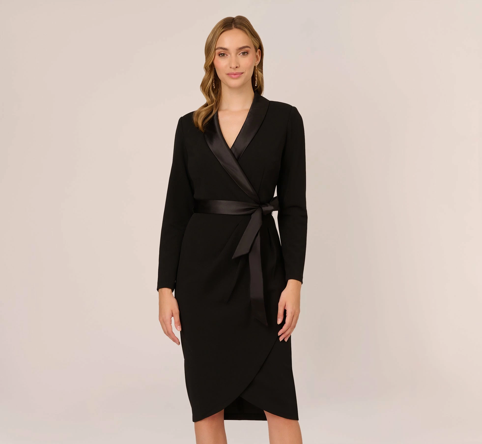 A new take on the tuxedo dress, designed in effortless knit crepe, with so many details to love: satin shawl collar, chic surplice neckline, elegant long sleeves and subtle pleating on the wrap skirt. The soft crepe tie at the waist makes it perfect.