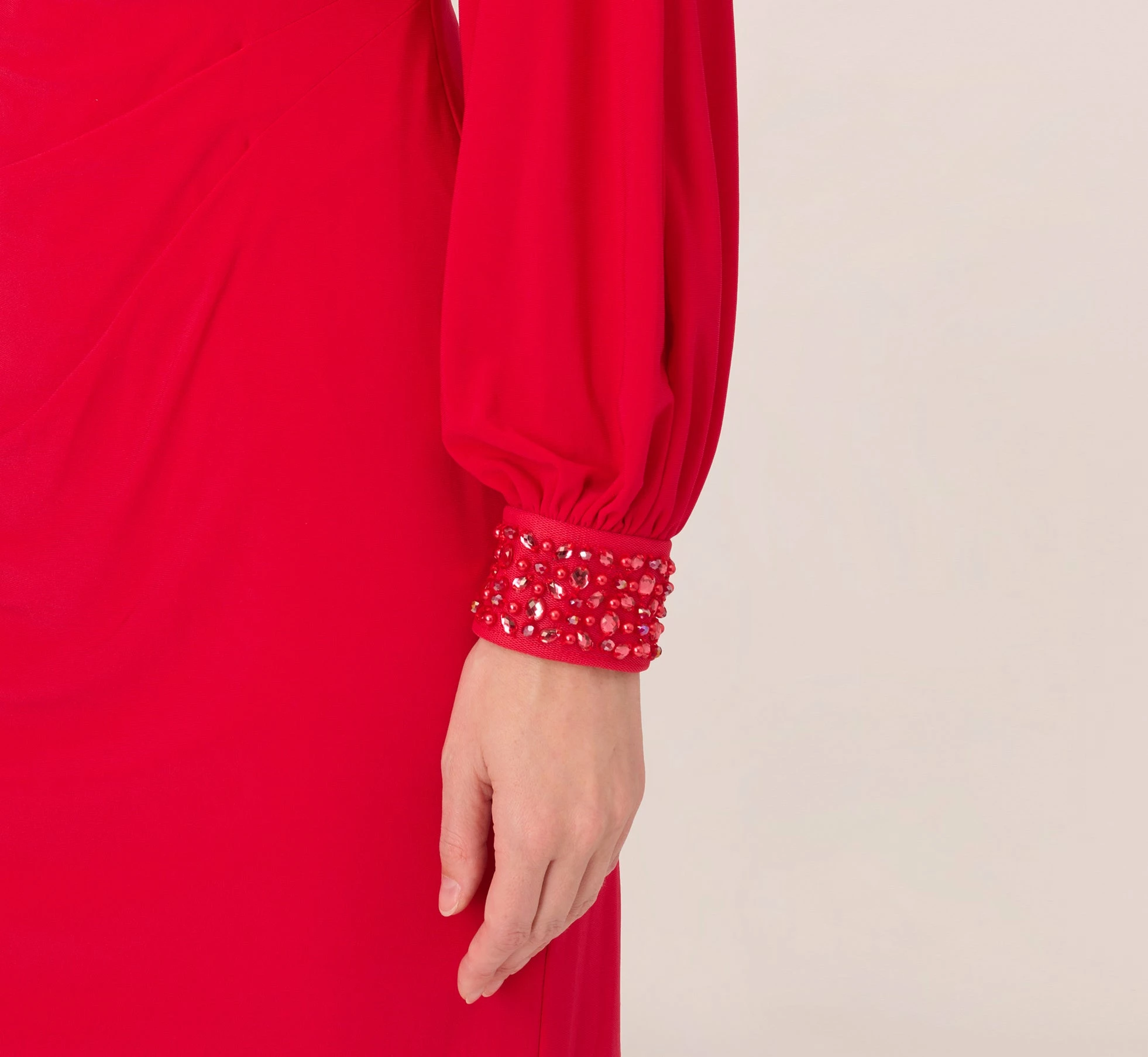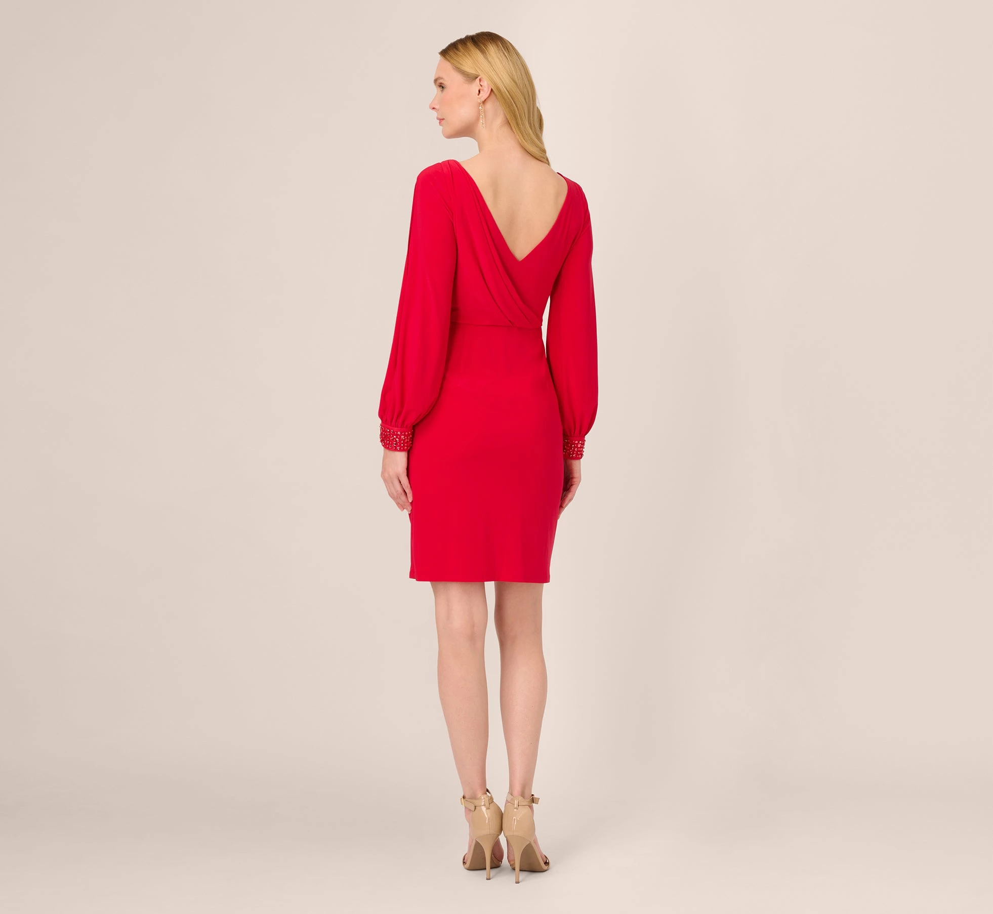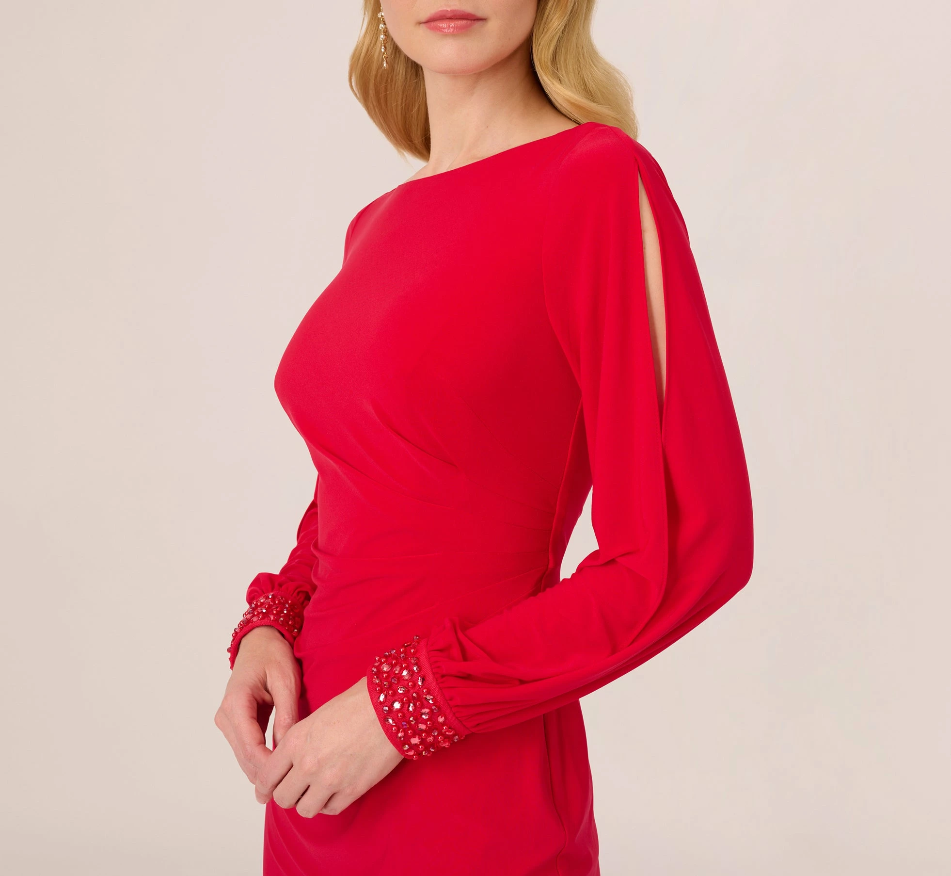 Bring the heat from date night to a cocktail attire event when you have this long sleeve dress at the ready. This dress features a sheath fit, boat neckline, and long sleeves with gem-adorned cuffs. Crafted from soft, stretch jersey fabric with no waist seam, this dress is comfortable and flattering. Draped details through the body accentuate and flatter the figure. A draped v-back and beaded cuffs with small zippers complete this cocktail dress. Pair this party dress with nude heels and a beaded clutch for a polished look.