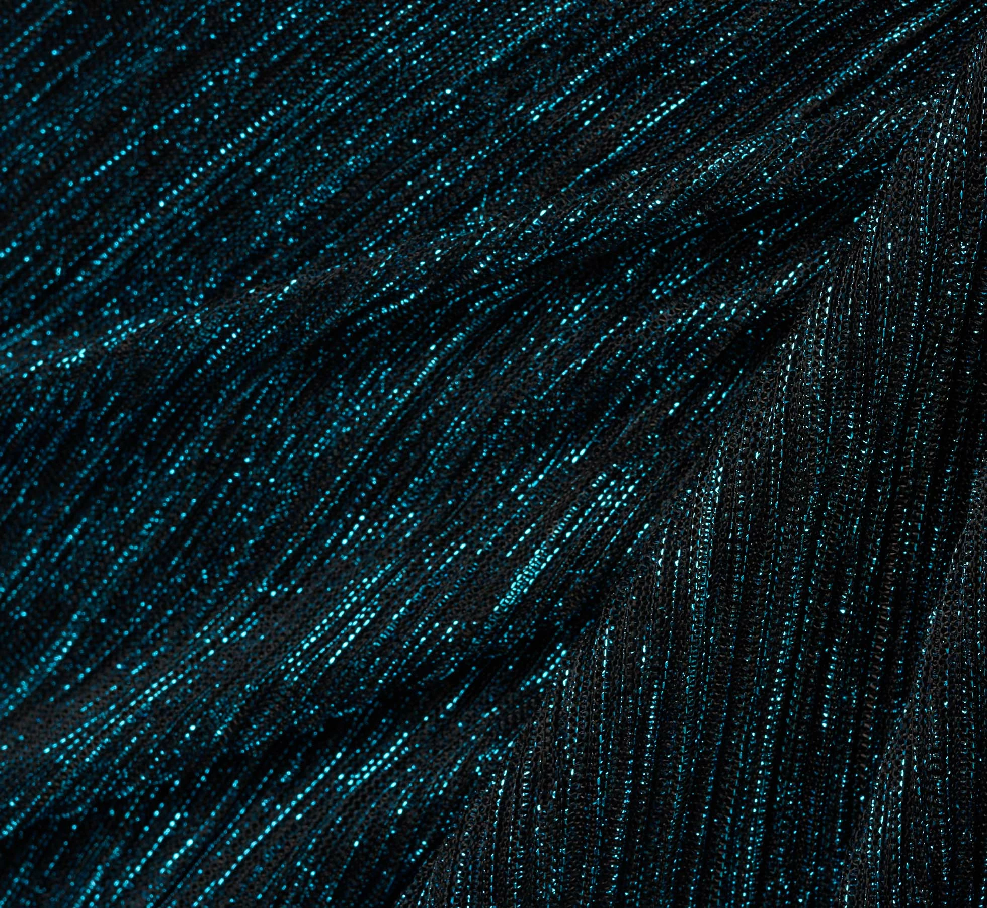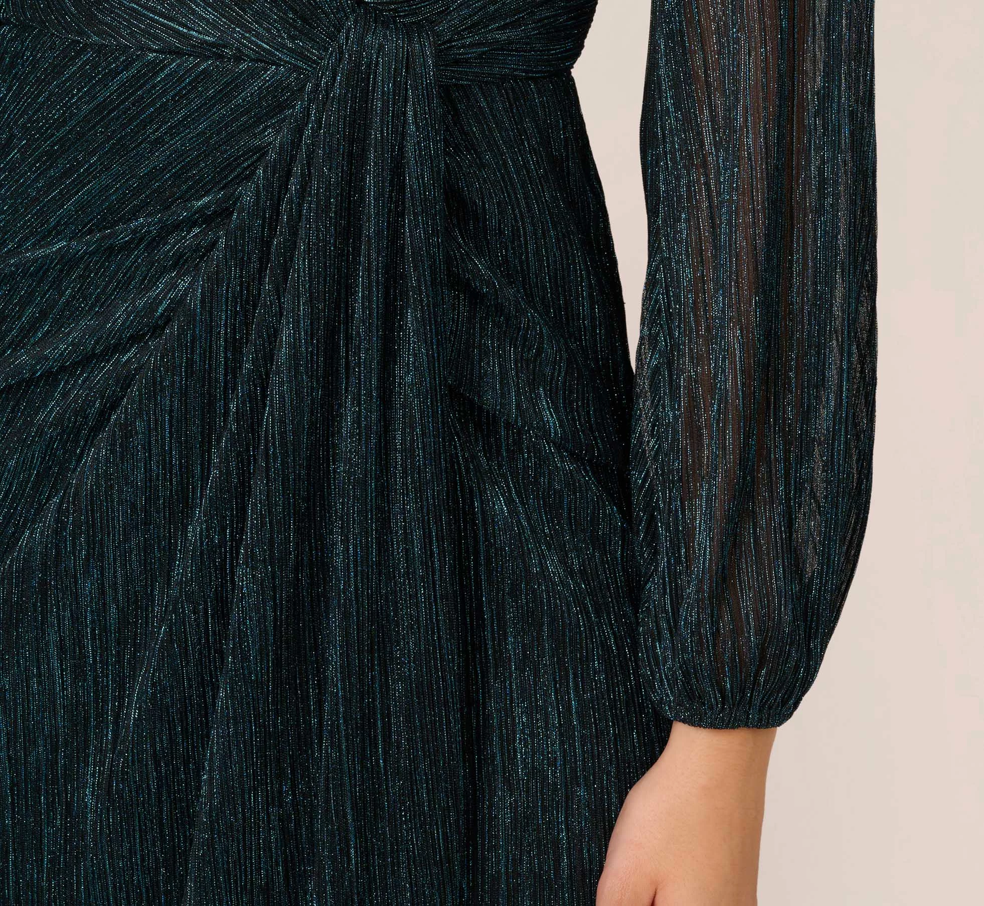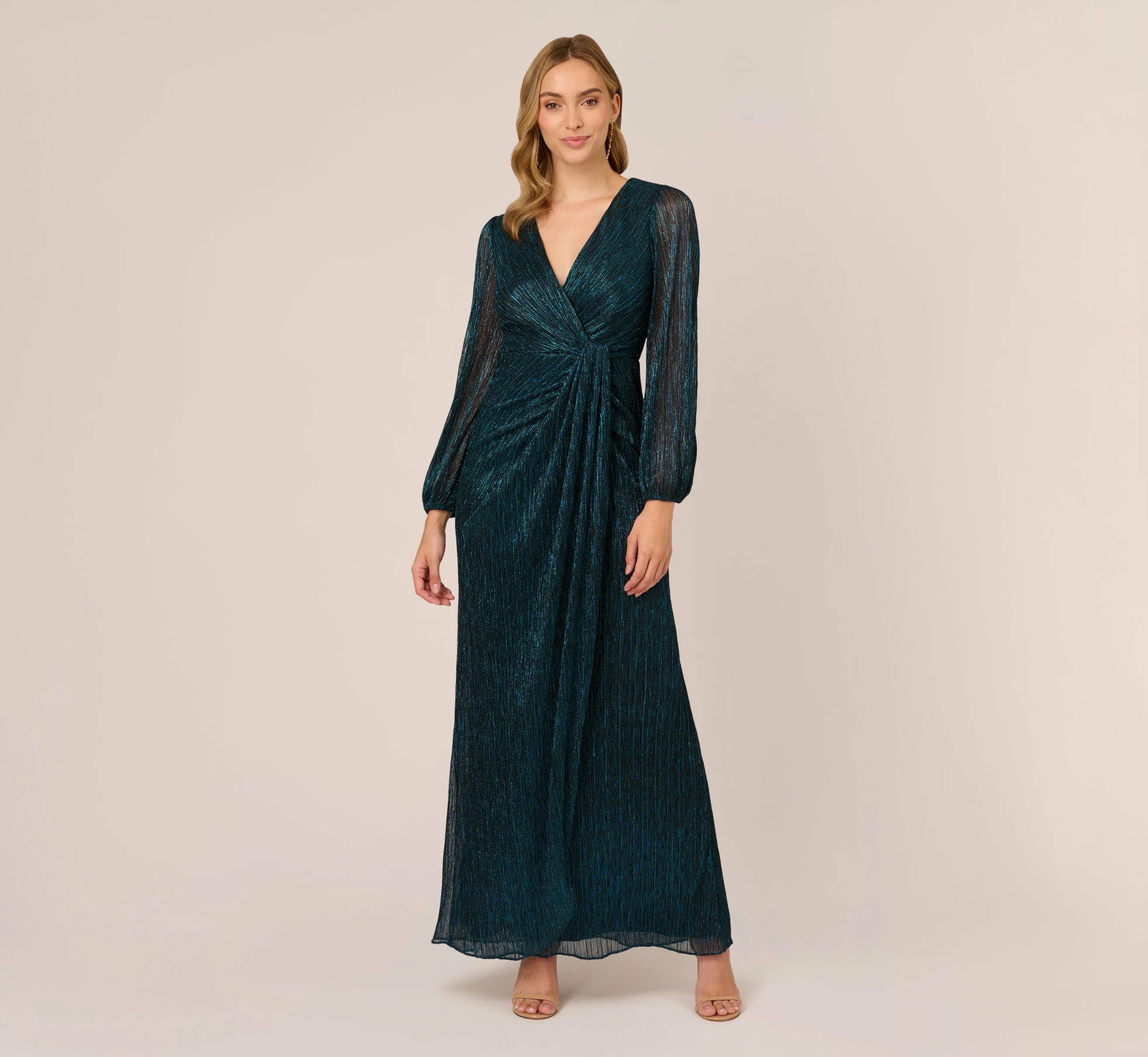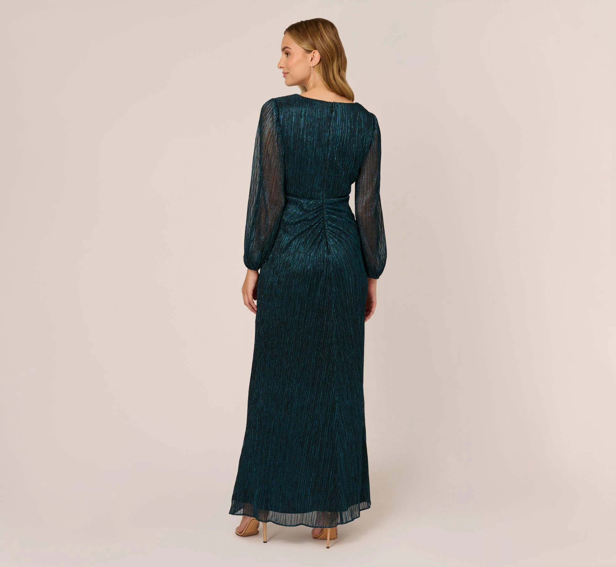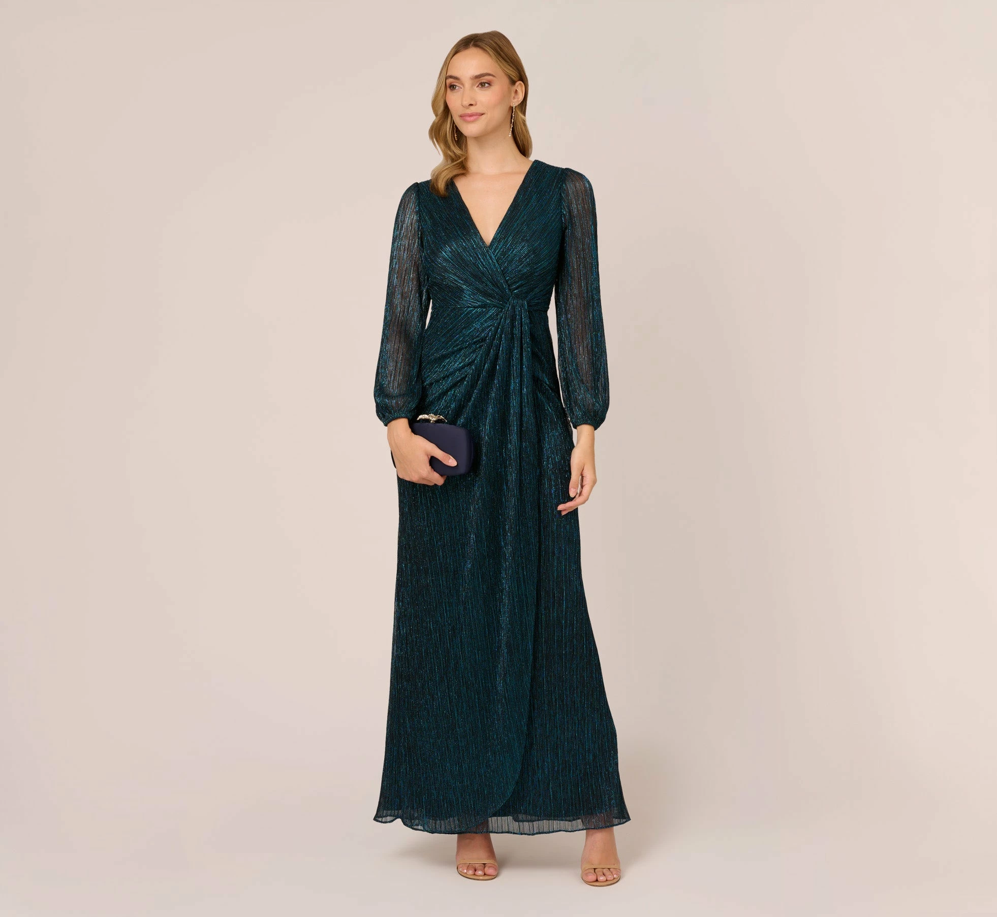 Adrianna Papell Metallic Crinkled Mesh Draped Long Gown In Teal Sapphire