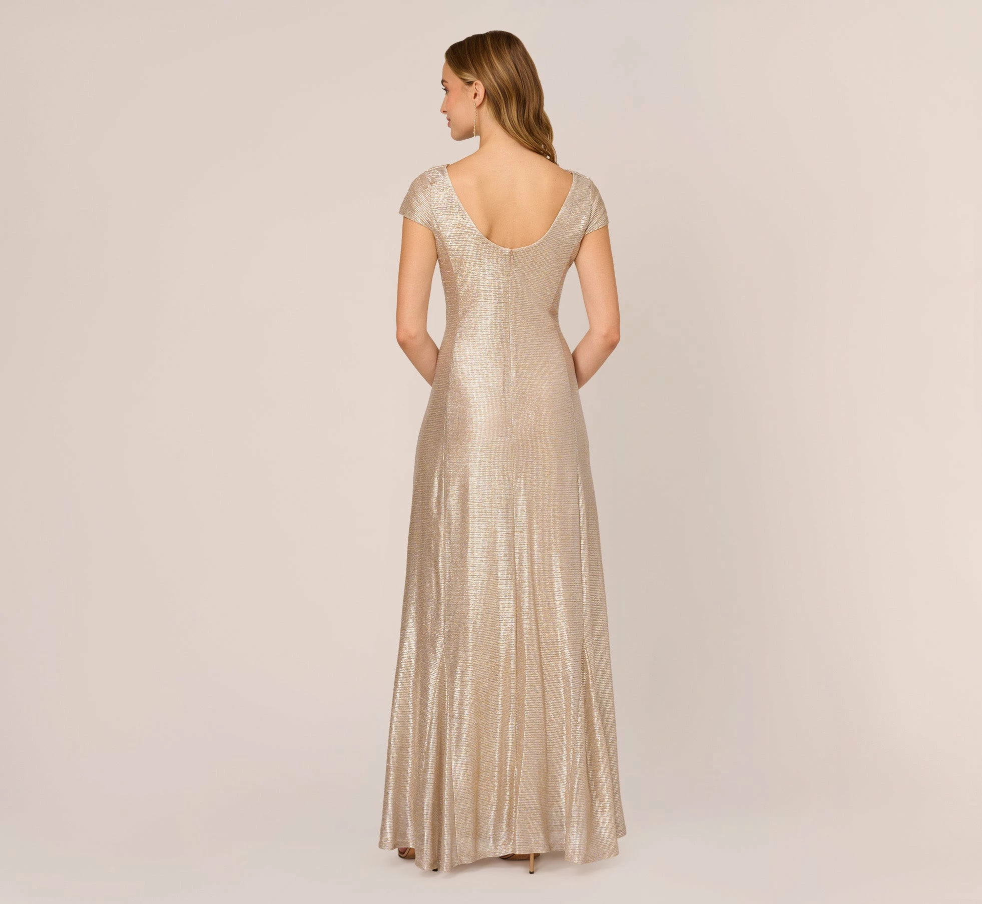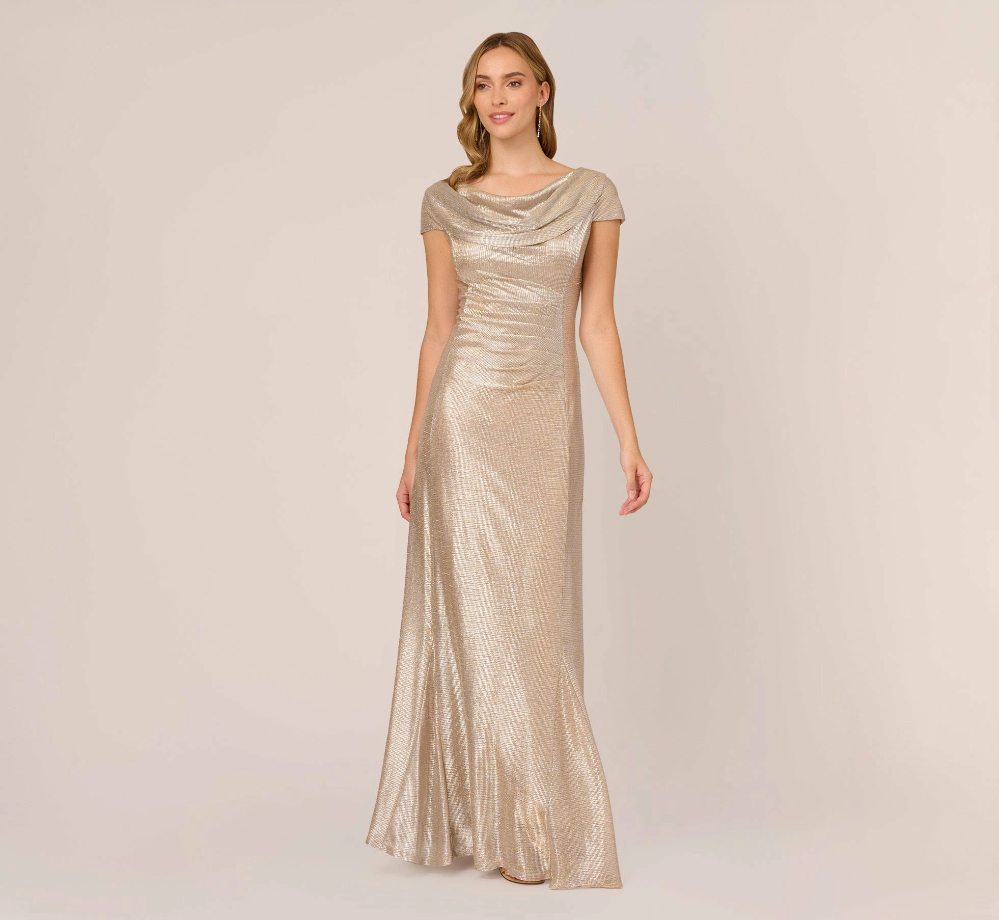 Alluring yet sophisticated, our showstopping gown is designed in a soft and shimmering metallic foil and is every bit stunning from the drapped neckline to the floor-grazing hem. We’ve added gentle ruched detailing along the waist for added texture and dimension. Perfect to add to your special occasion rotation.