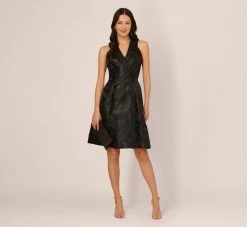 Dance the night away in style with this metallic cocktail dress. This midi dress features a halter bodice with keyhole neckline and criss-cross straps, a wrap skirt, and a square back. Crafted from metallic threaded and crinkle pleated knit fabric, this halter dress is a flirty look. A zipper closure at the center back completes this sleeveless dress. Spanning from semi-formal to formal, this metallic dress is an appropriate look for all evening occasions.