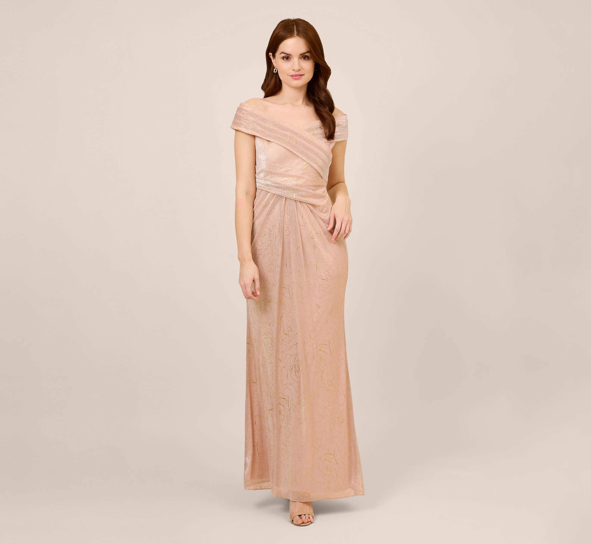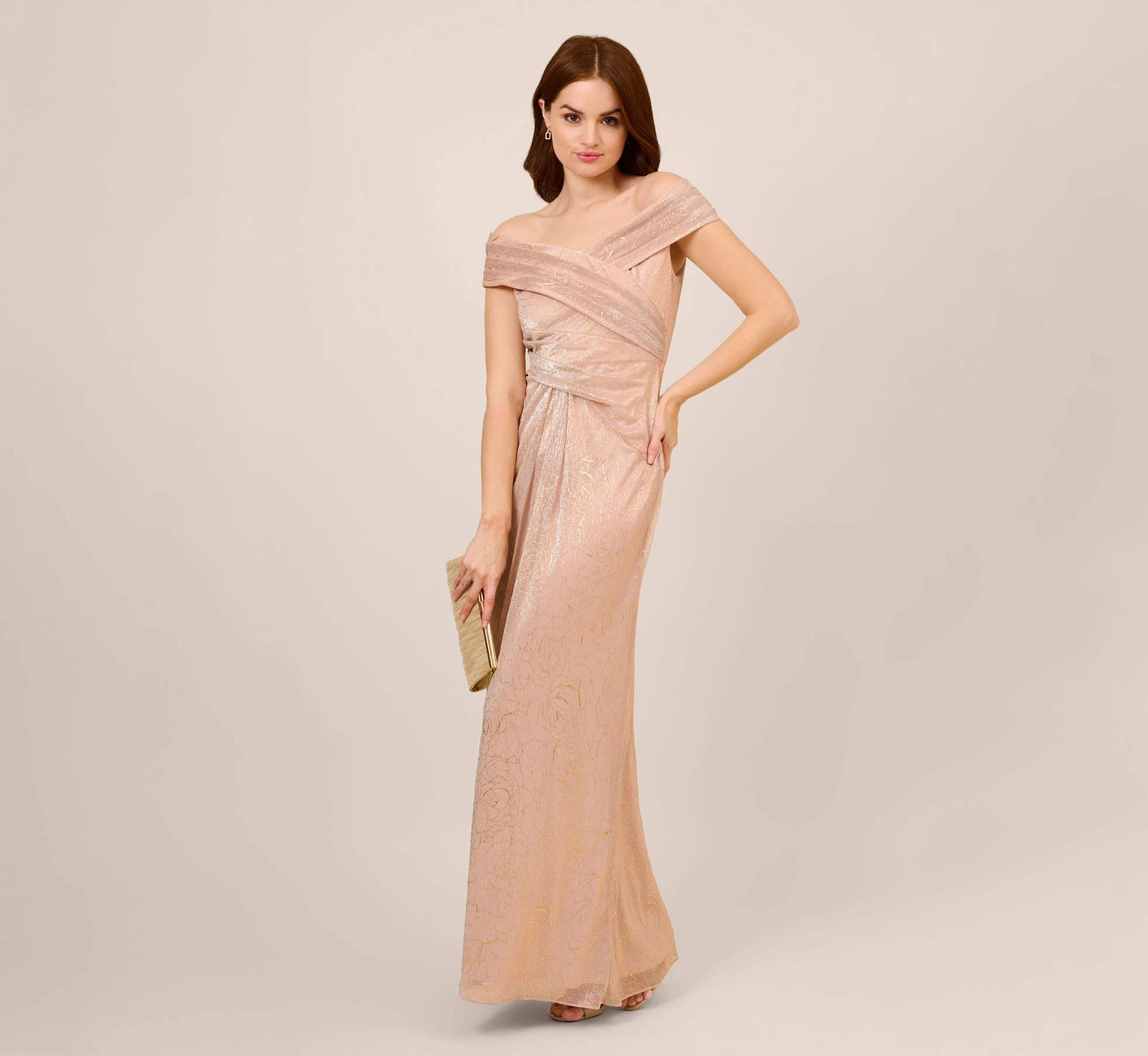 You’ll be best dressed guest at any event when wearing this classic gown, adorned with a metallic floral motif that lends romantic visuals. The pleated crisscross bodice flatters your figure while the long skirt is designed with gentle pleats that creates beautiful movement and sway. Sleek back zip closure.