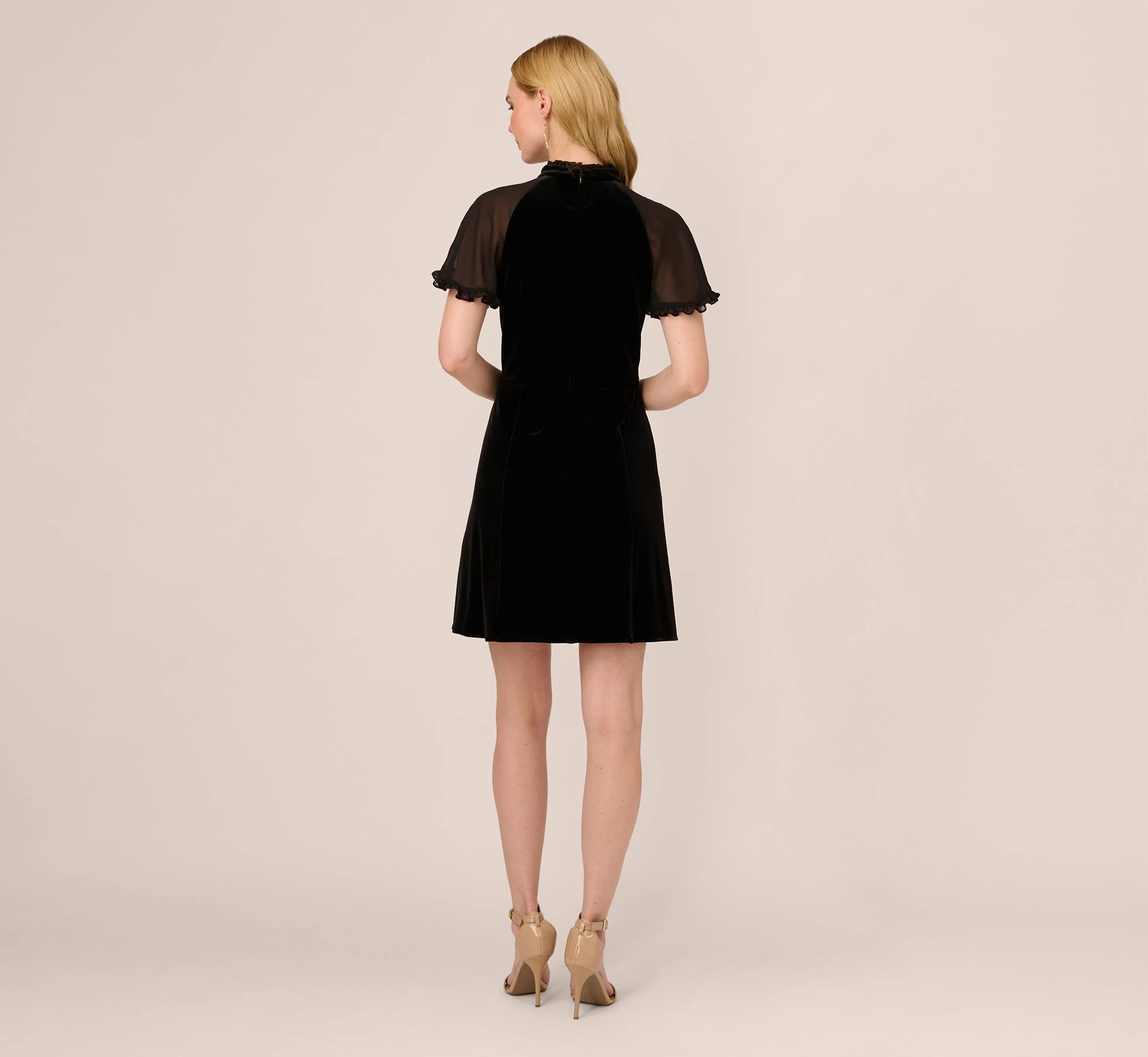 Elegant is effortless in this short sleeve velvet dress. This party dress features a mock neck collar, an A-line silhouette, and sheer short sleeves with ruffled details. Crafted from soft velvet fabric through the body and chiffon fabric at the sleeves, this cocktail dress is a classic design. A zipper closure at the center back completes the dress. Styled with high heels and a statement clutch, this velvet dress is a stunning look from date night to a semi-formal wedding.