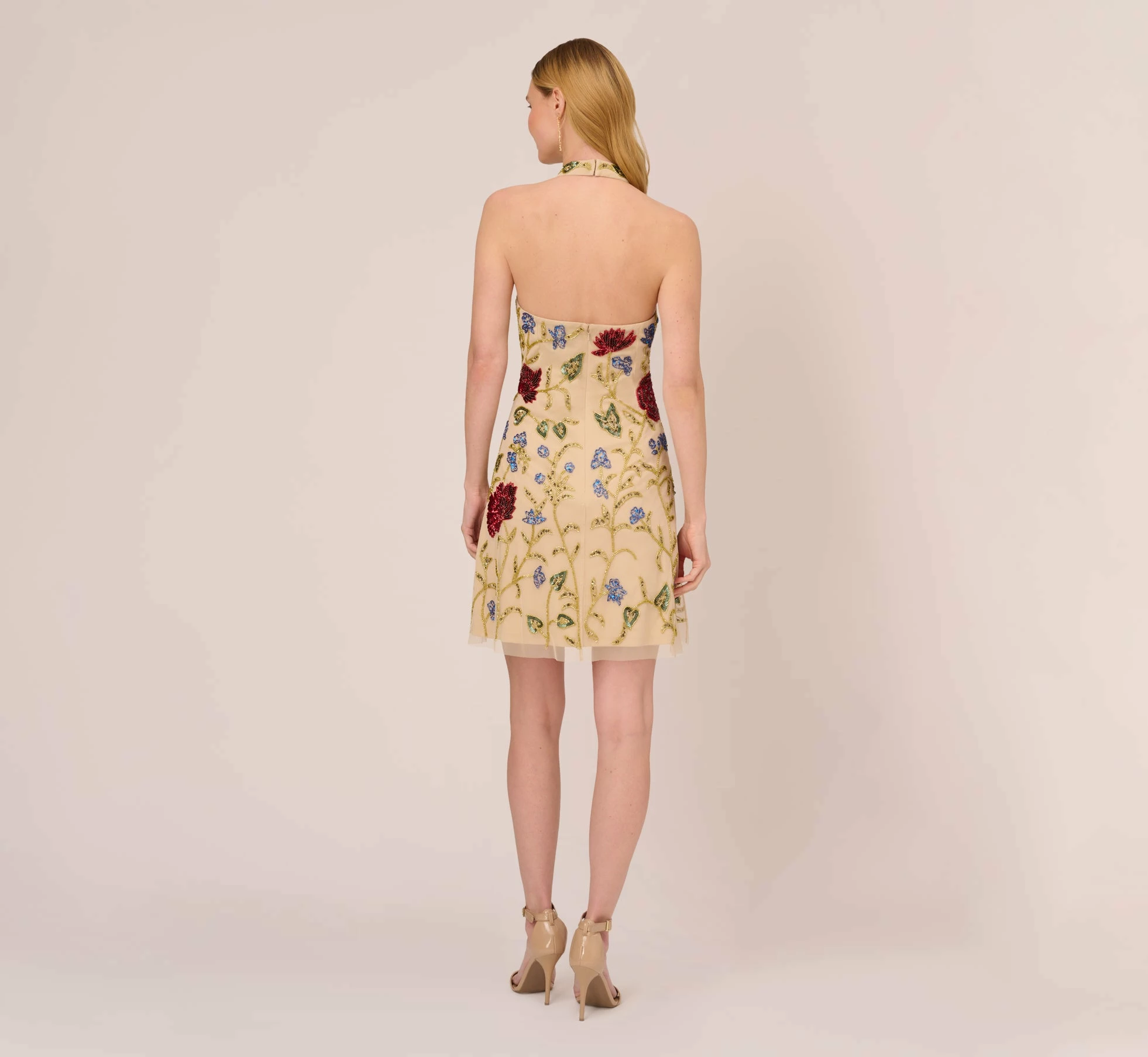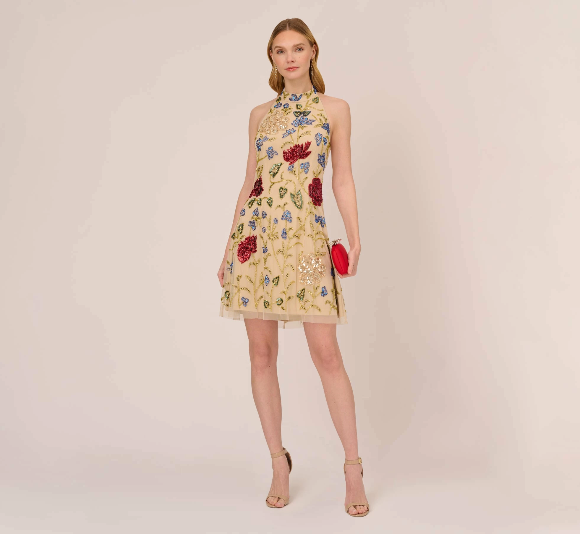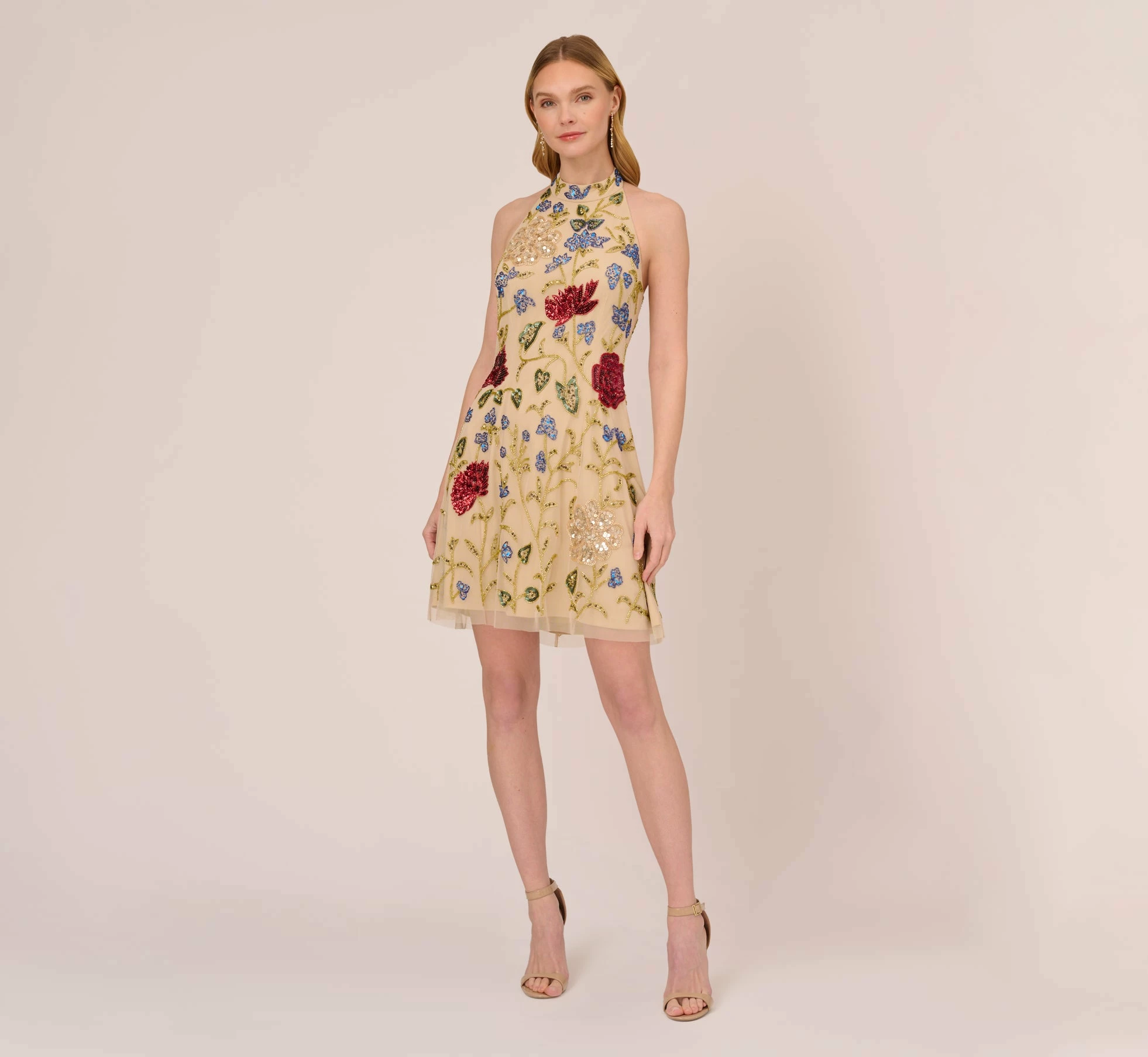 Bold multicolor beading makes this floral cocktail dress demand attention. This beaded dress features a halter neckline with mock neck, open back, and shift silhouette. Fully-lined, this playful dress has a mesh overlay that is embellished with a bright sequin and beaded floral motifthat draws the eye. A zipper closure and hook and eye at the neckline complete this trapeze dress. Add a nude heel and let this mock neck dress shine.