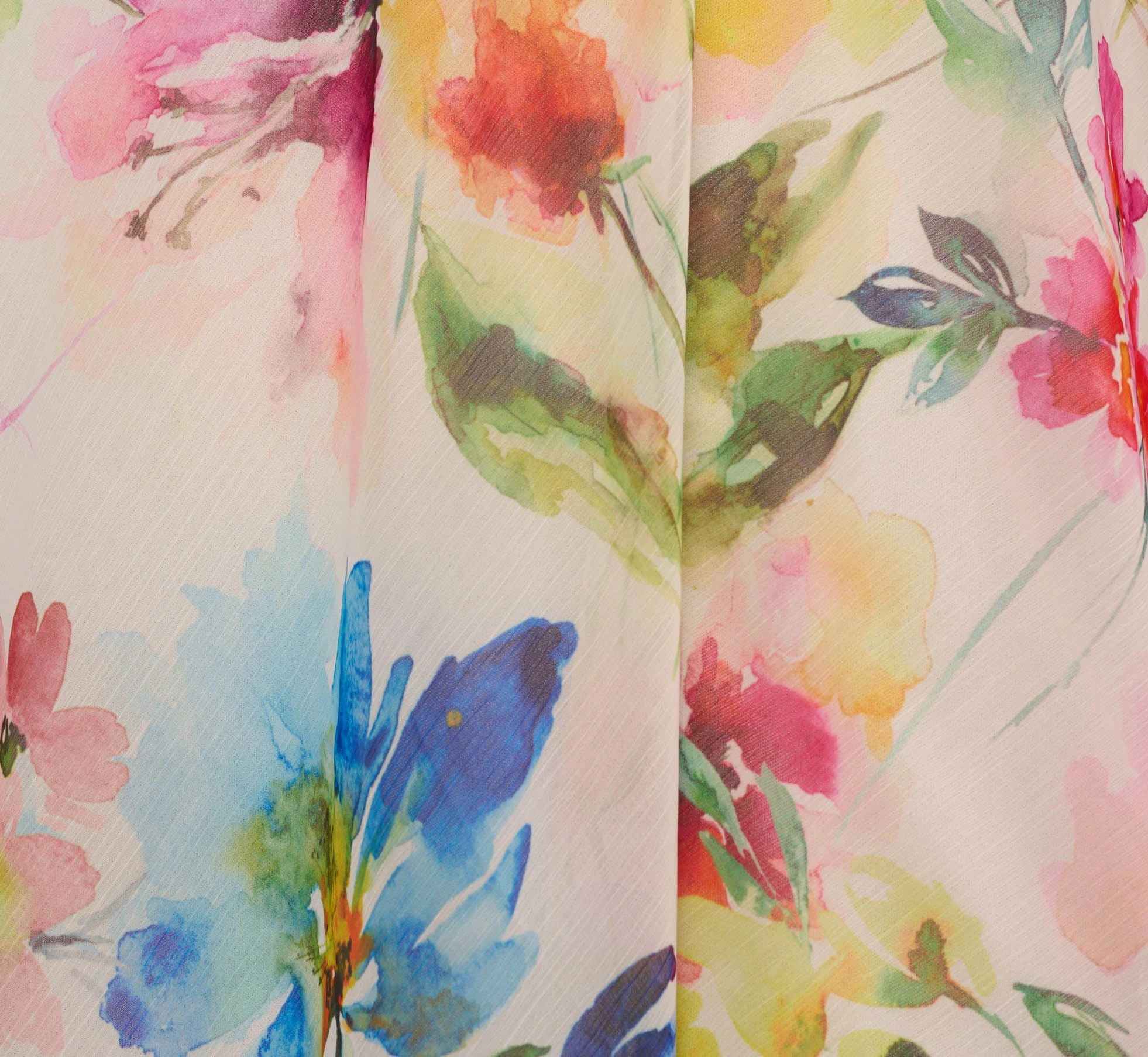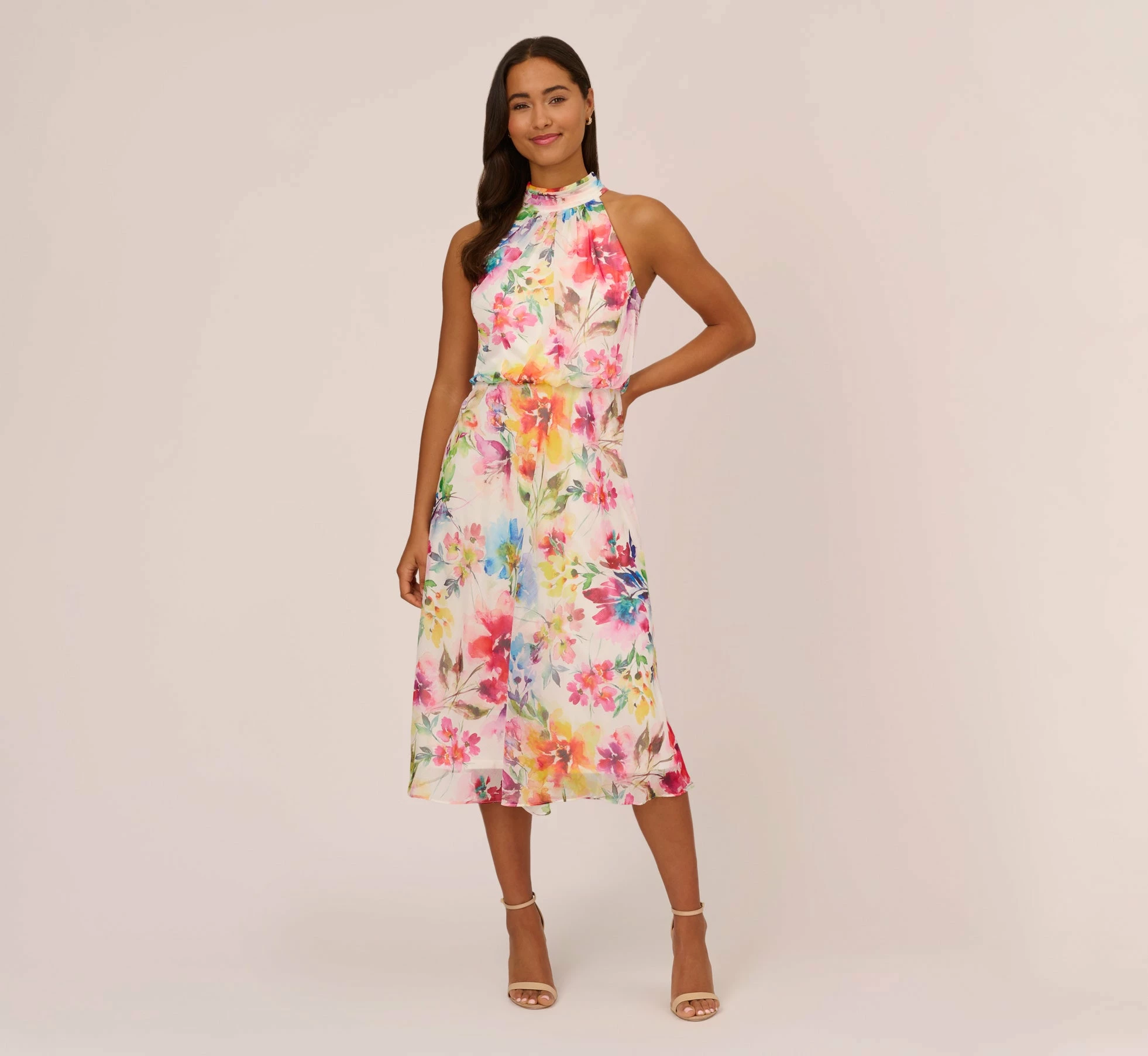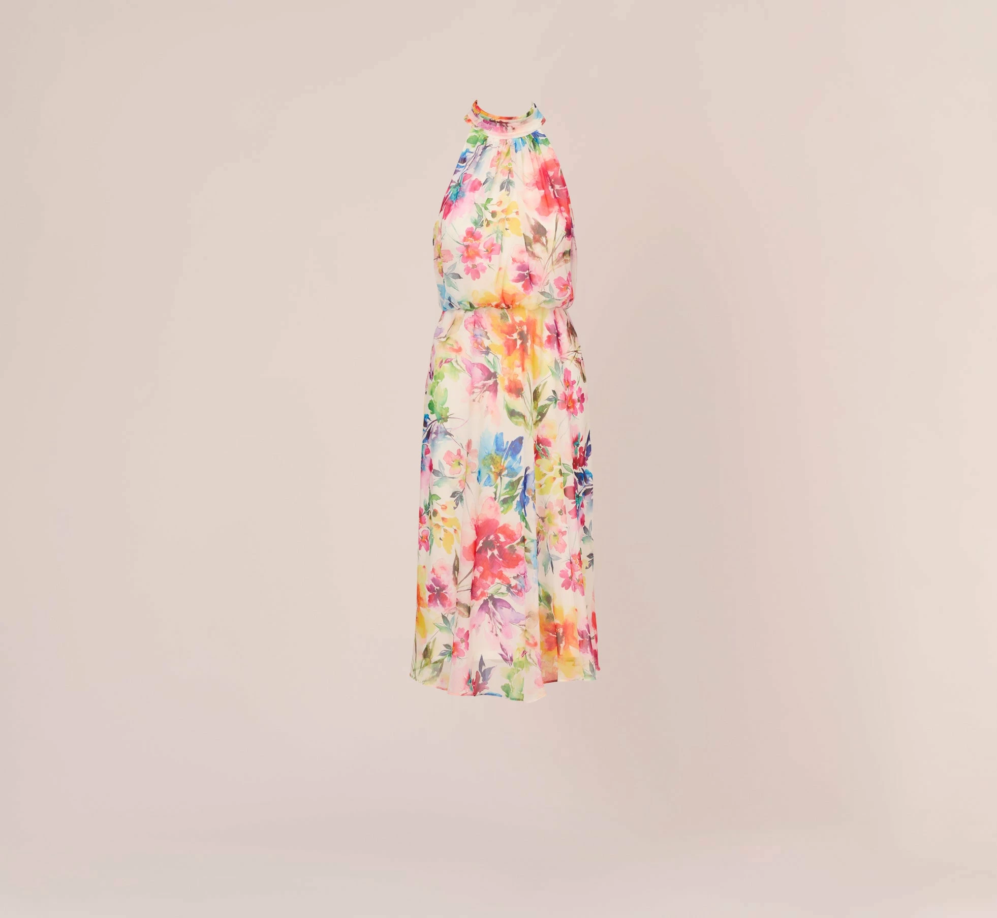 Simple yet sweet, this chiffon dress makes a statement. This floral dress features a halter neckline with mock neck collar, blouson bodice, and a midi skirt. Crafted from crinkle chiffon, this pull-on dress has a comfortable elastic waistline and a self-tie at the back of the neck. Printedwith a playful multicolor floral design, this midi dress is a stunning look. Teamed with a neutral heel for day or night, this halter dress will be a fast favorite.