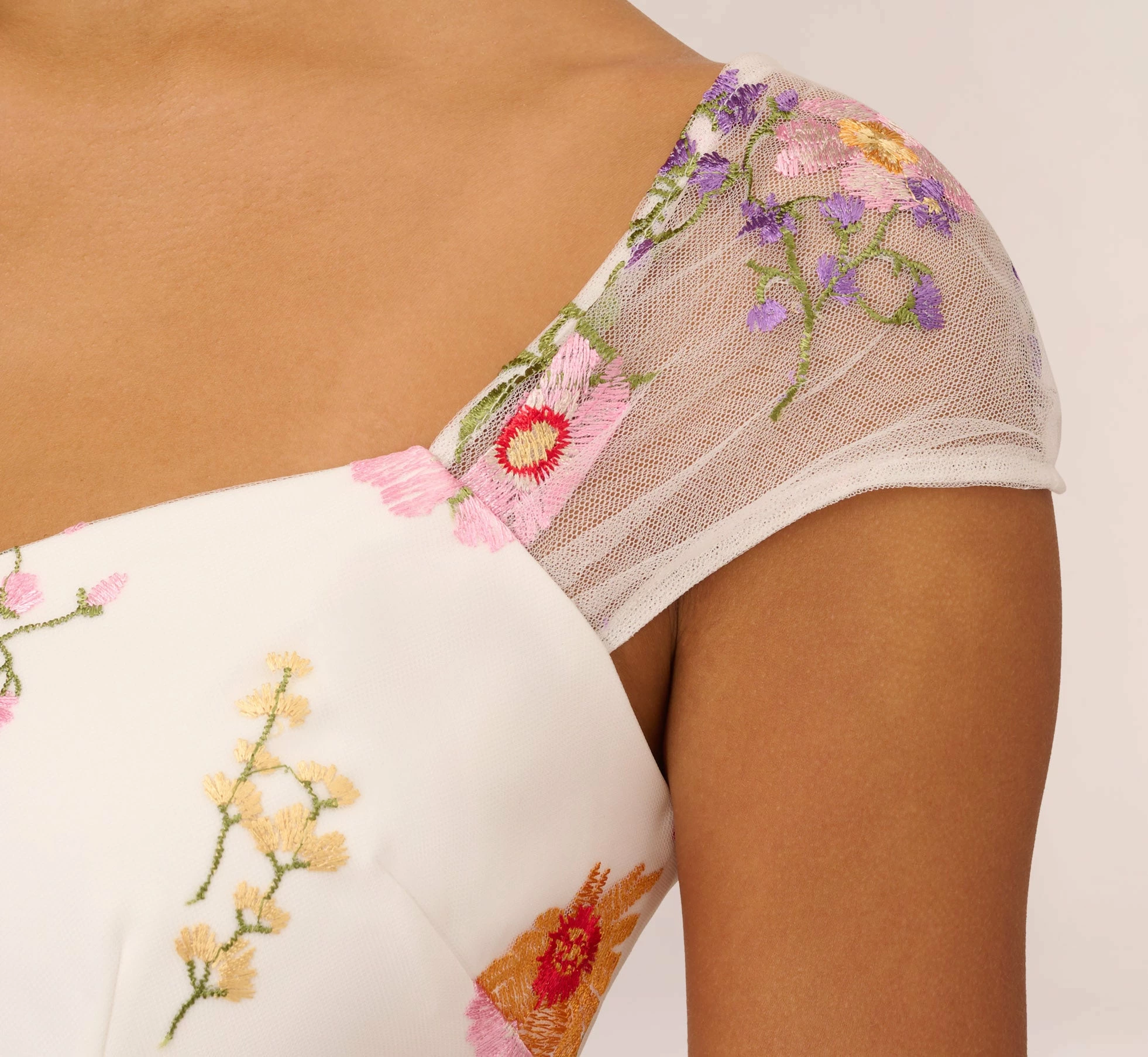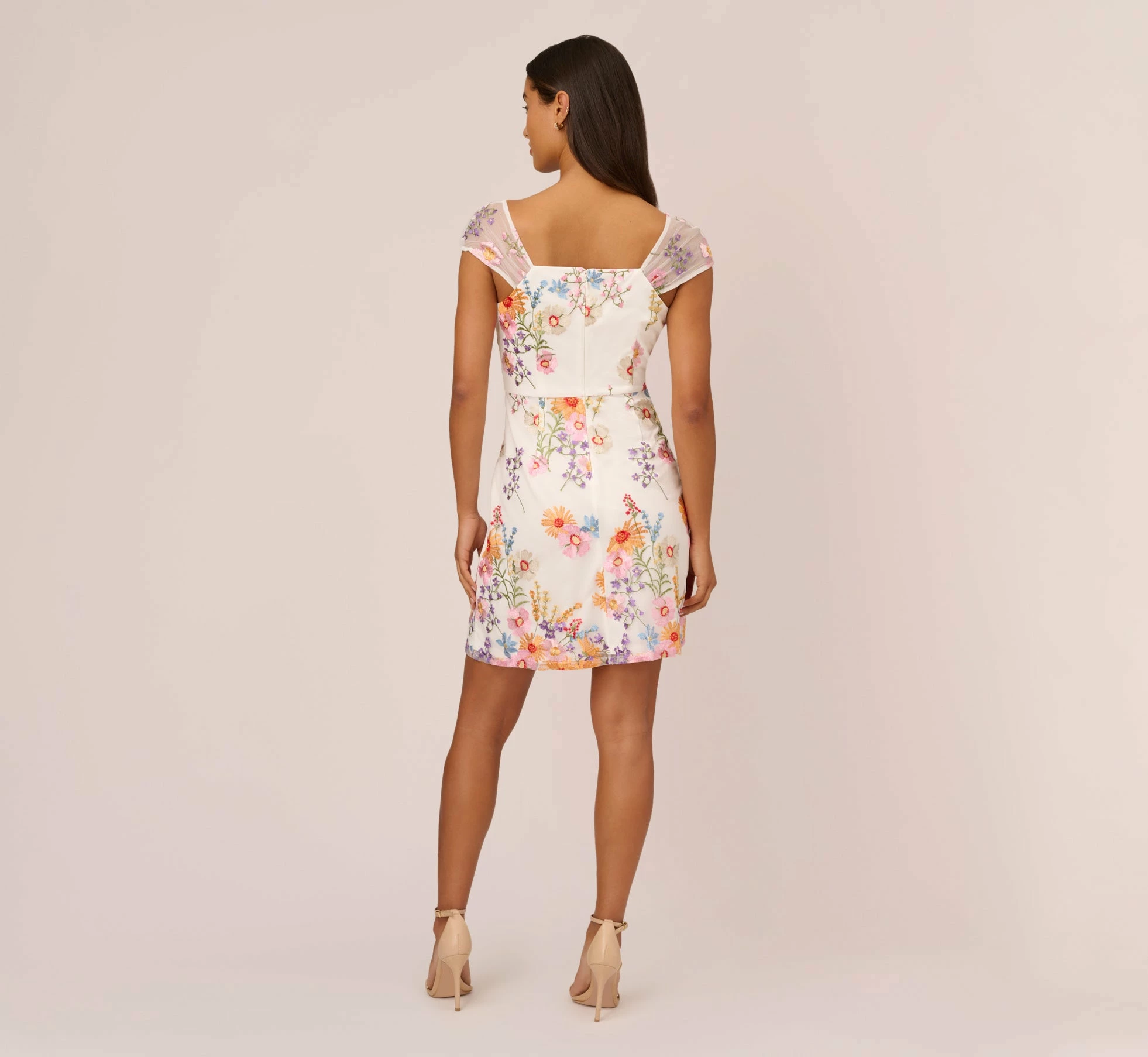 Bring the bloom in this bright and beautiful embroidered dress. This floral dress features a v-neckline, an a-line silhouette, and sheer cap sleeves with delicately pleated details. Bright flowers are embroidered throughout this pretty a-line dress. Paired with neutral or metallic heelsand a clutch, this floral embroidered dress will shine for day or night.