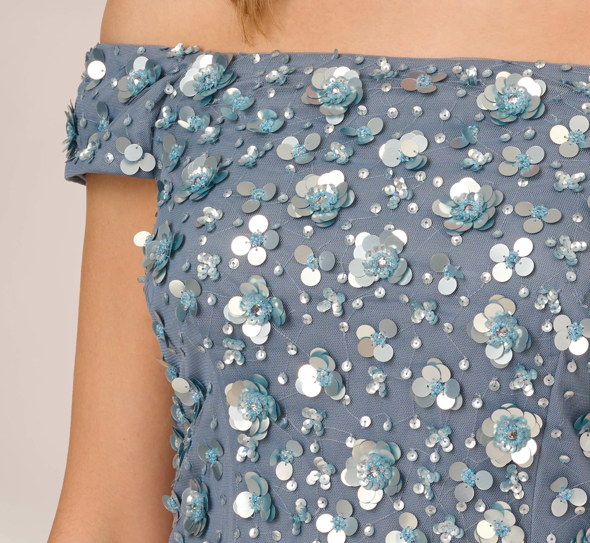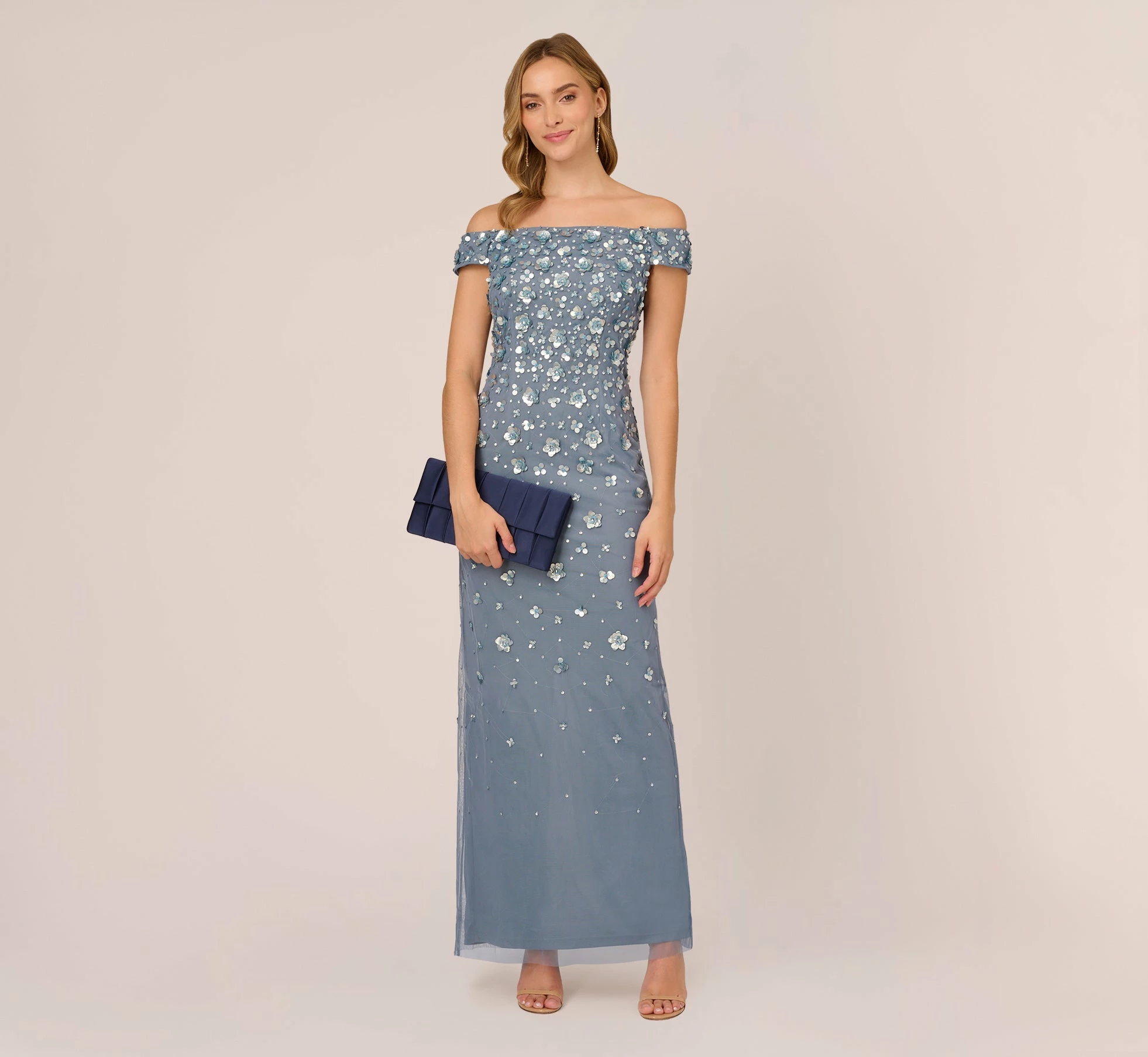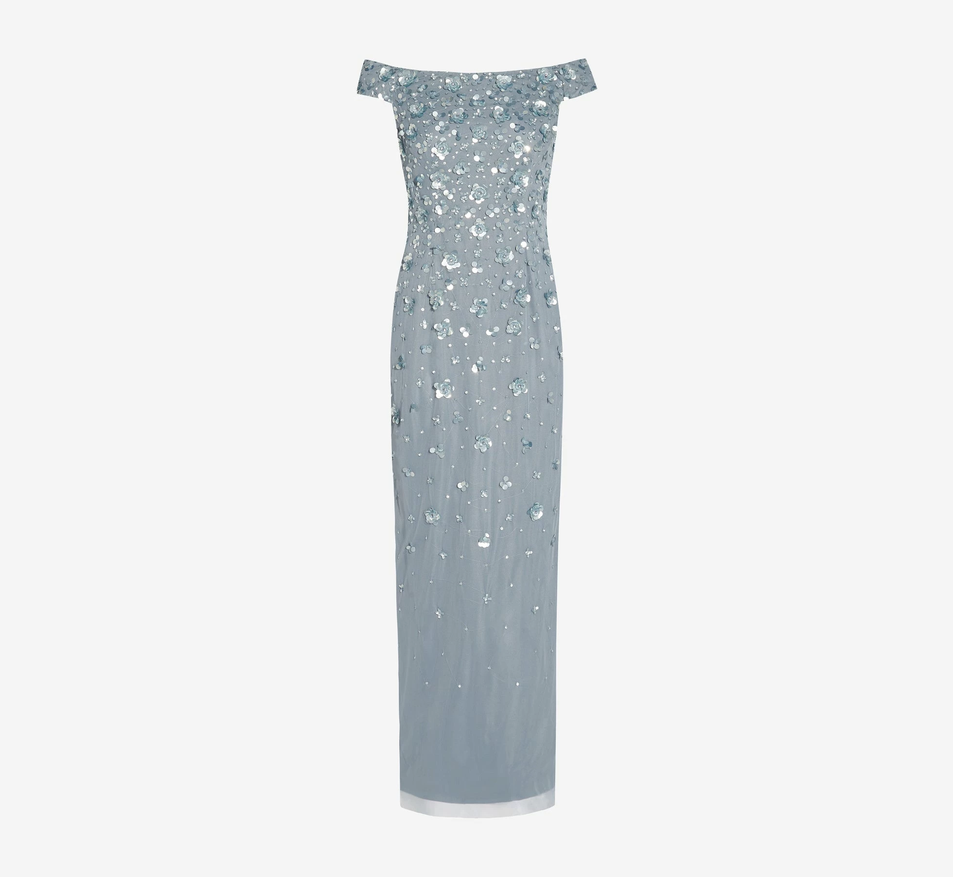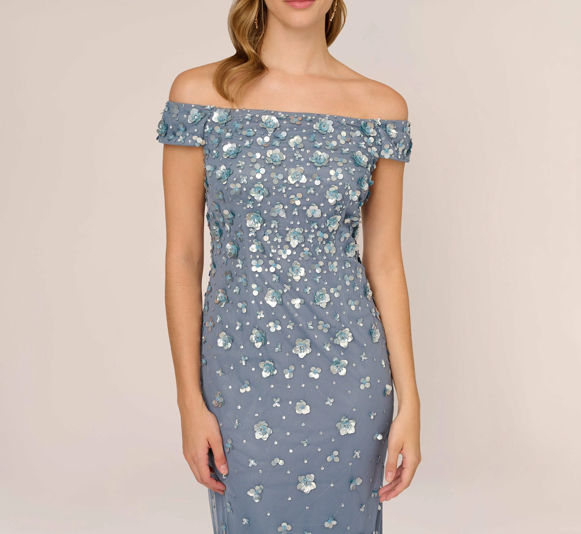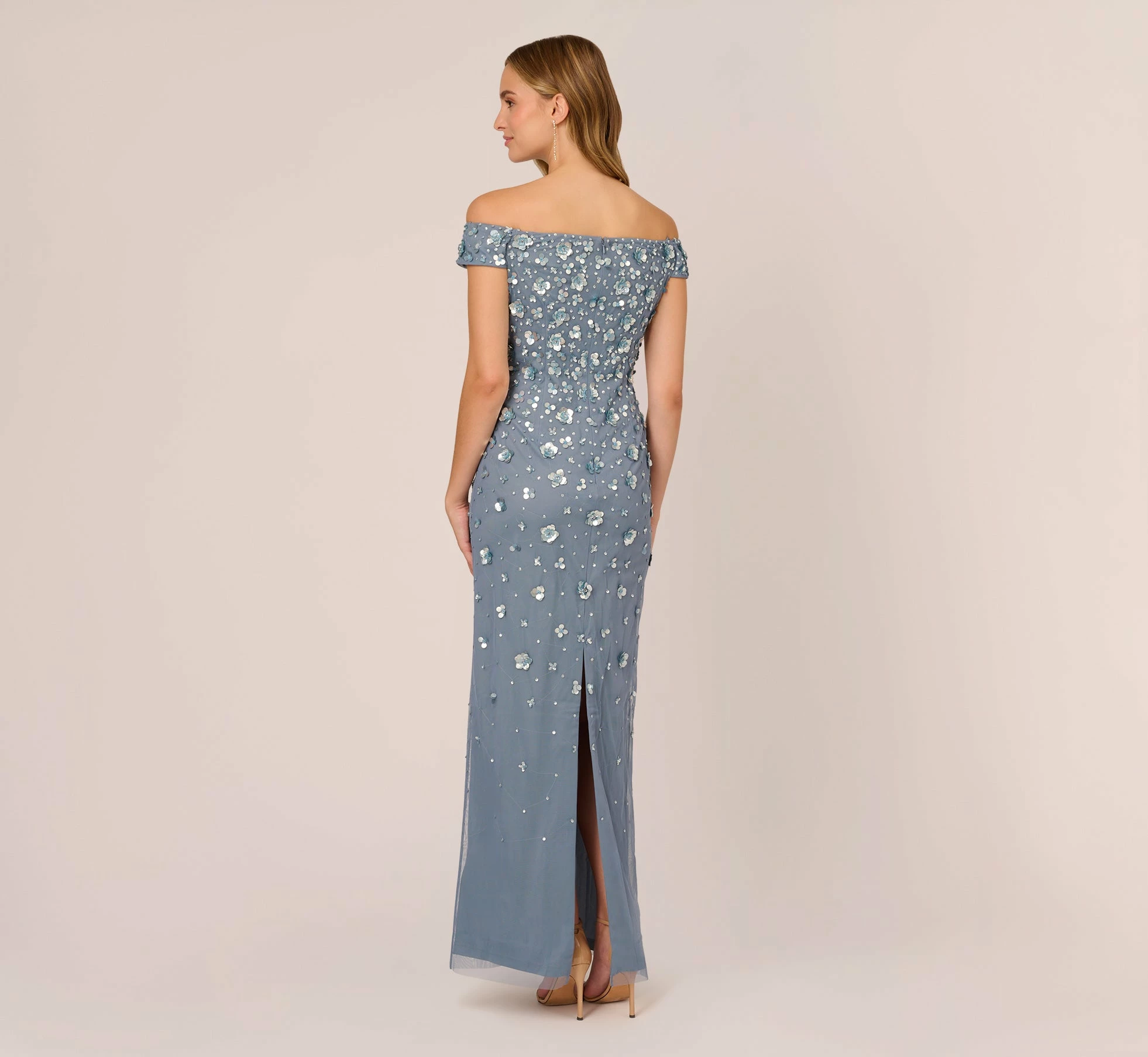 Feminine and fabulous, this special occasion dress features a romantic off-shoulder neckline, a floral embellished bodice, and a long, straight skirt with a back slit, and back zipper closure. Take on your next formal in style with this stunning evening dress. Whether for a wedding, gala or other black-tie event, you can’t go wrong with a party dress this polished. Wear this formal dress with sparkling chandelier earrings, a chic, metallic clutch, and a sexy pair of strappy heels for a glamorous look that is sure to shine. Beading and embellishments on this garment were sewn by hand, making each dress beautifully unique. Slight variations or irregularities may be present.