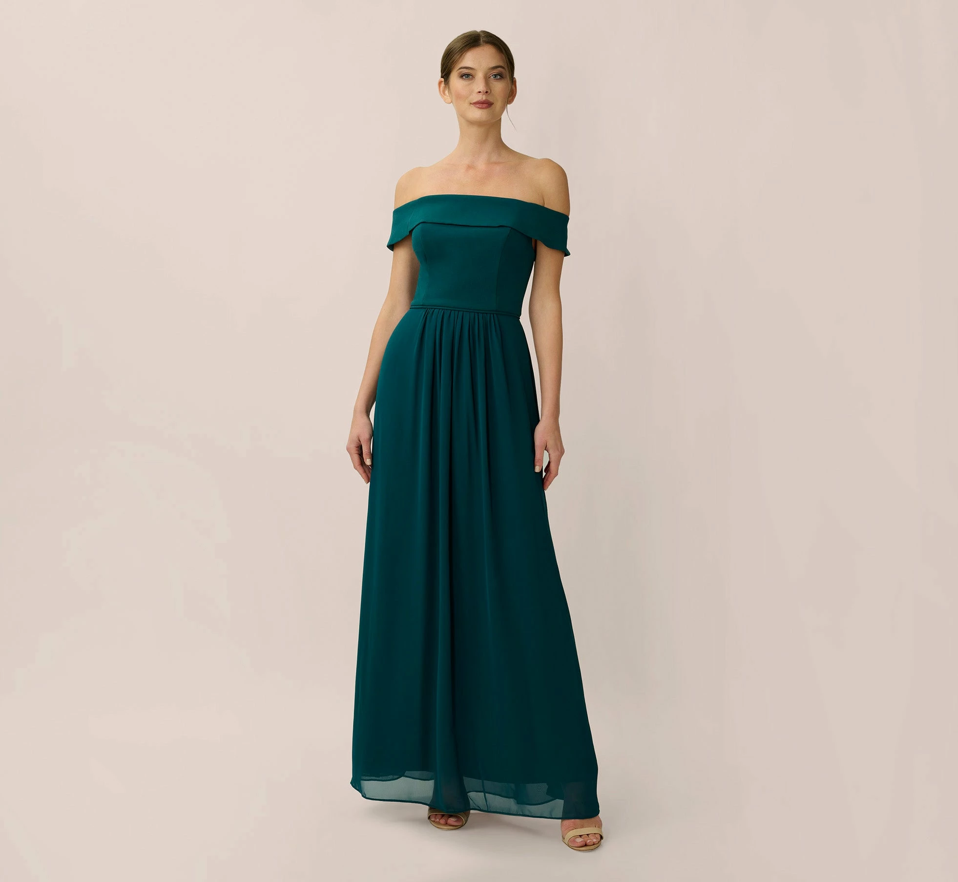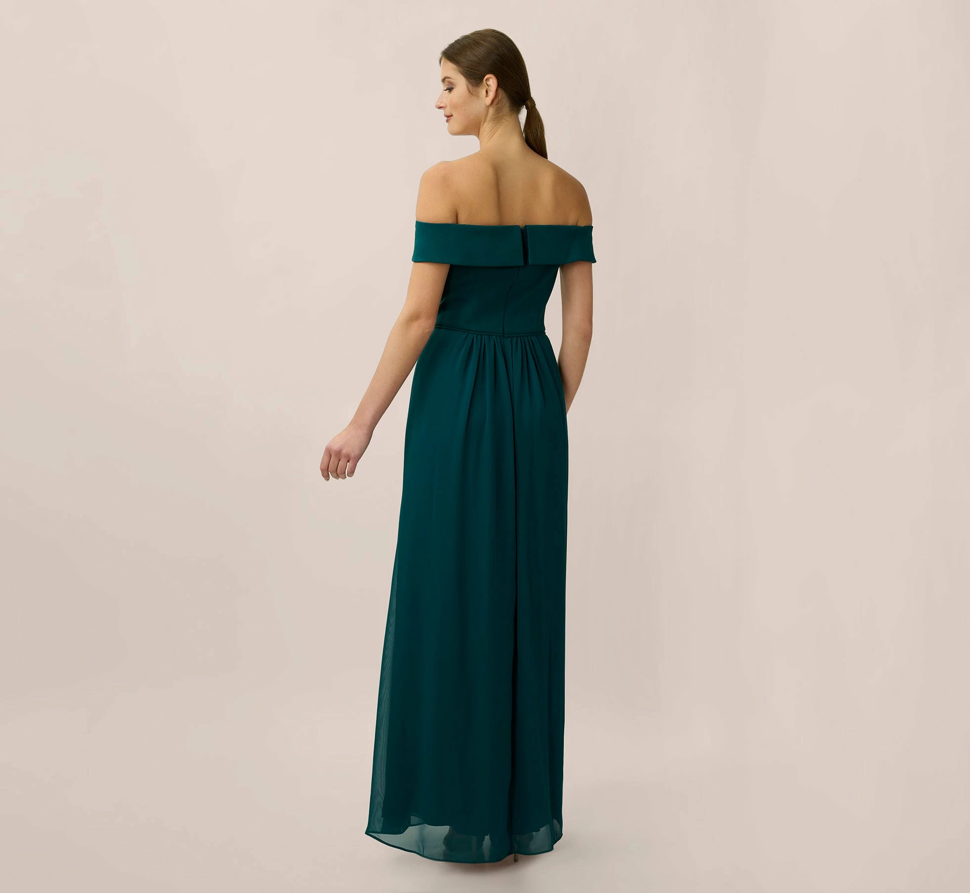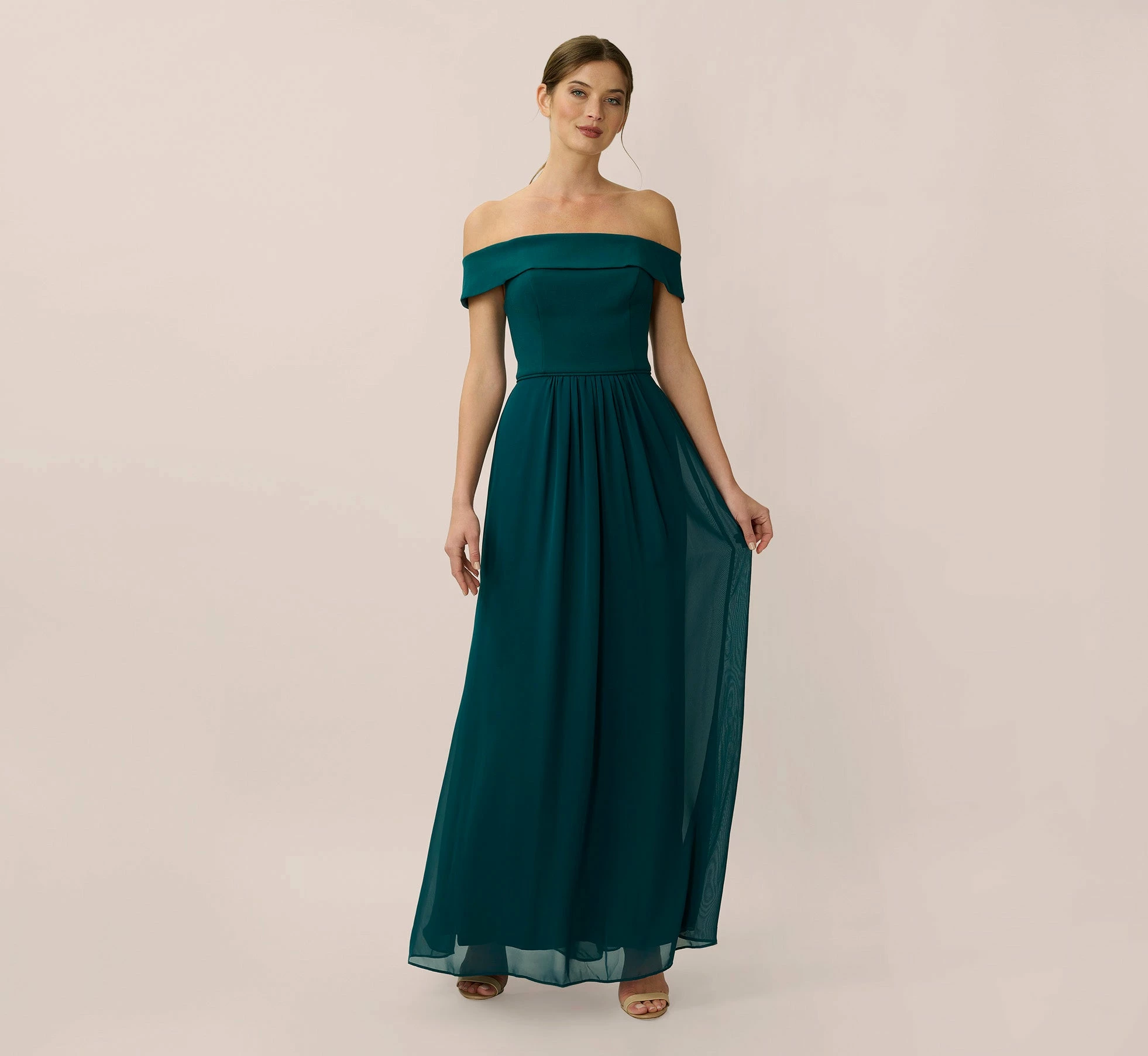 Poised and elegant, a timeless off-the-shoulder silhouette with a knit crepe bodice and soft, flowing skirt. For evenings out, weddings, and every occasion that calls for celebration. This dress pairs perfectly in your bridal party. As a bridesmaids dress this mixes perfectly with our beaded blouson styles or together with our chiffon bridesmaid collection.