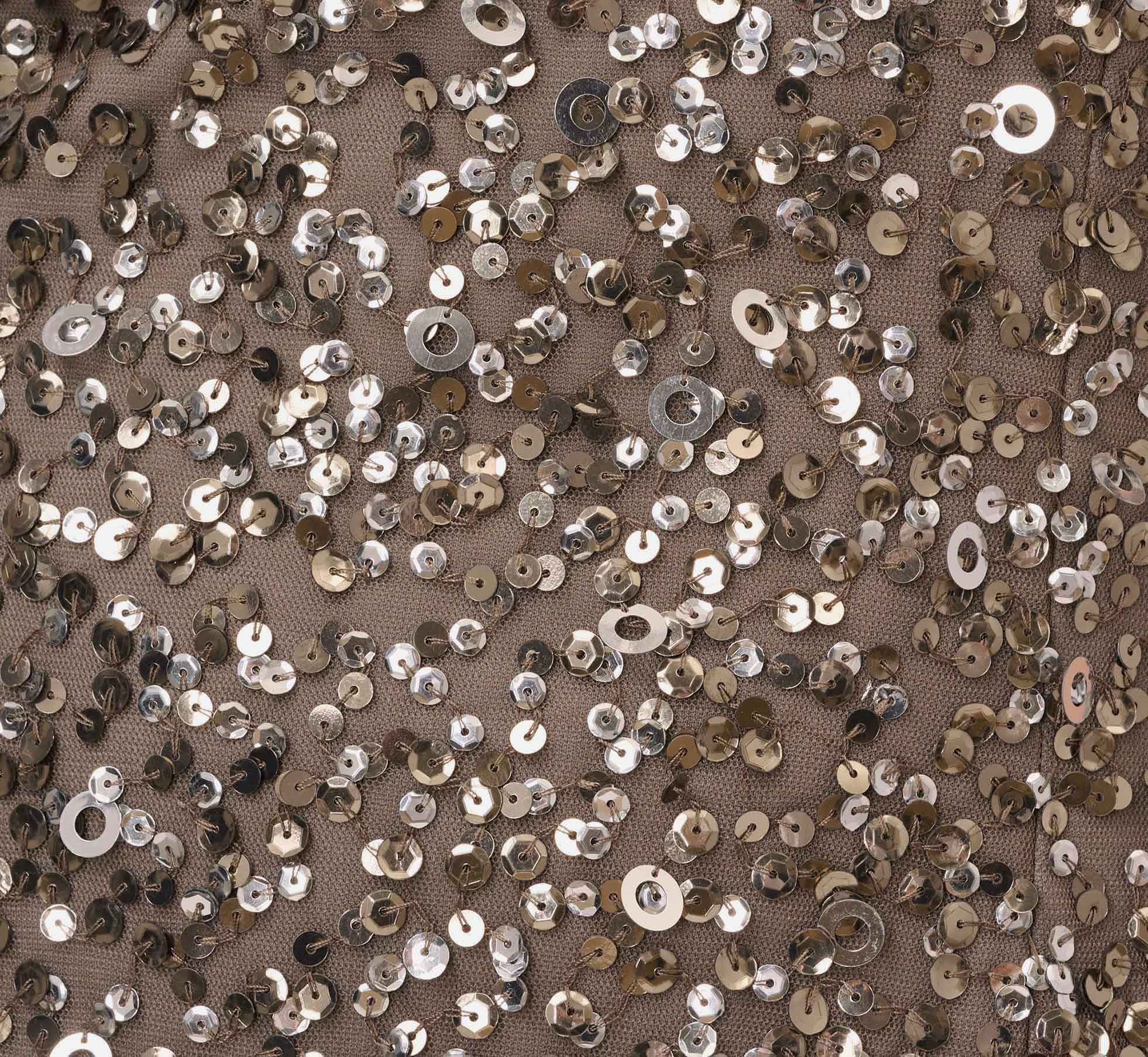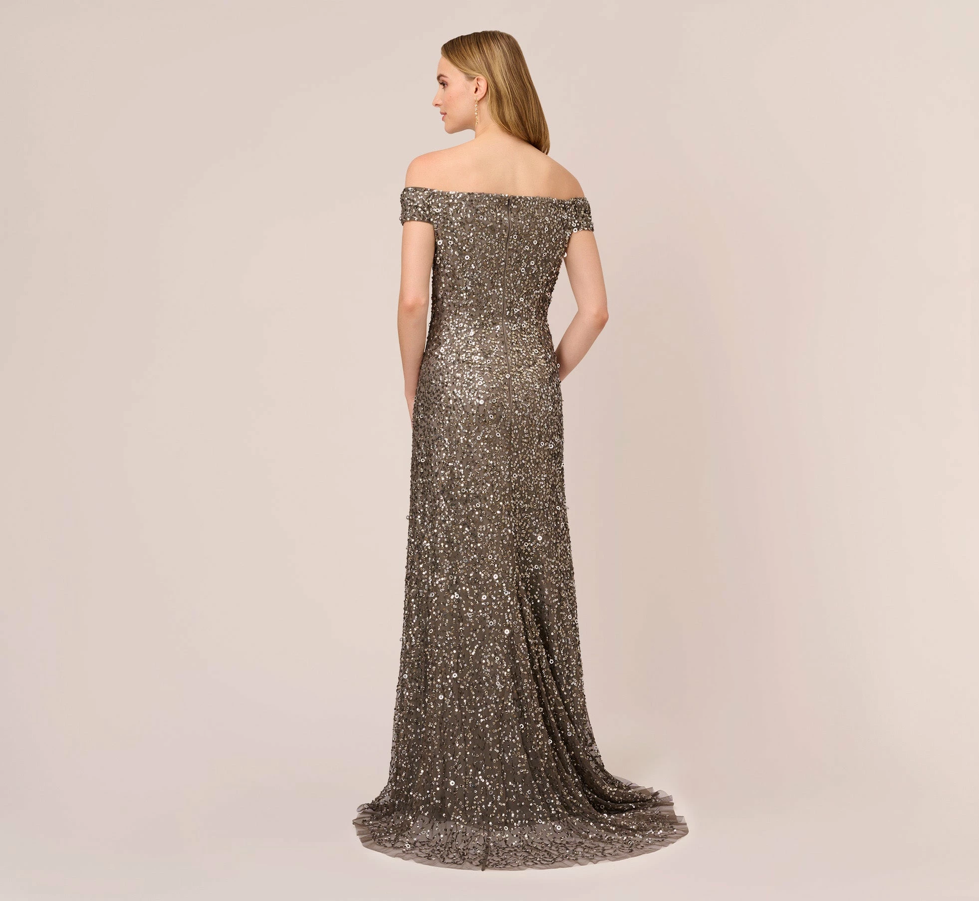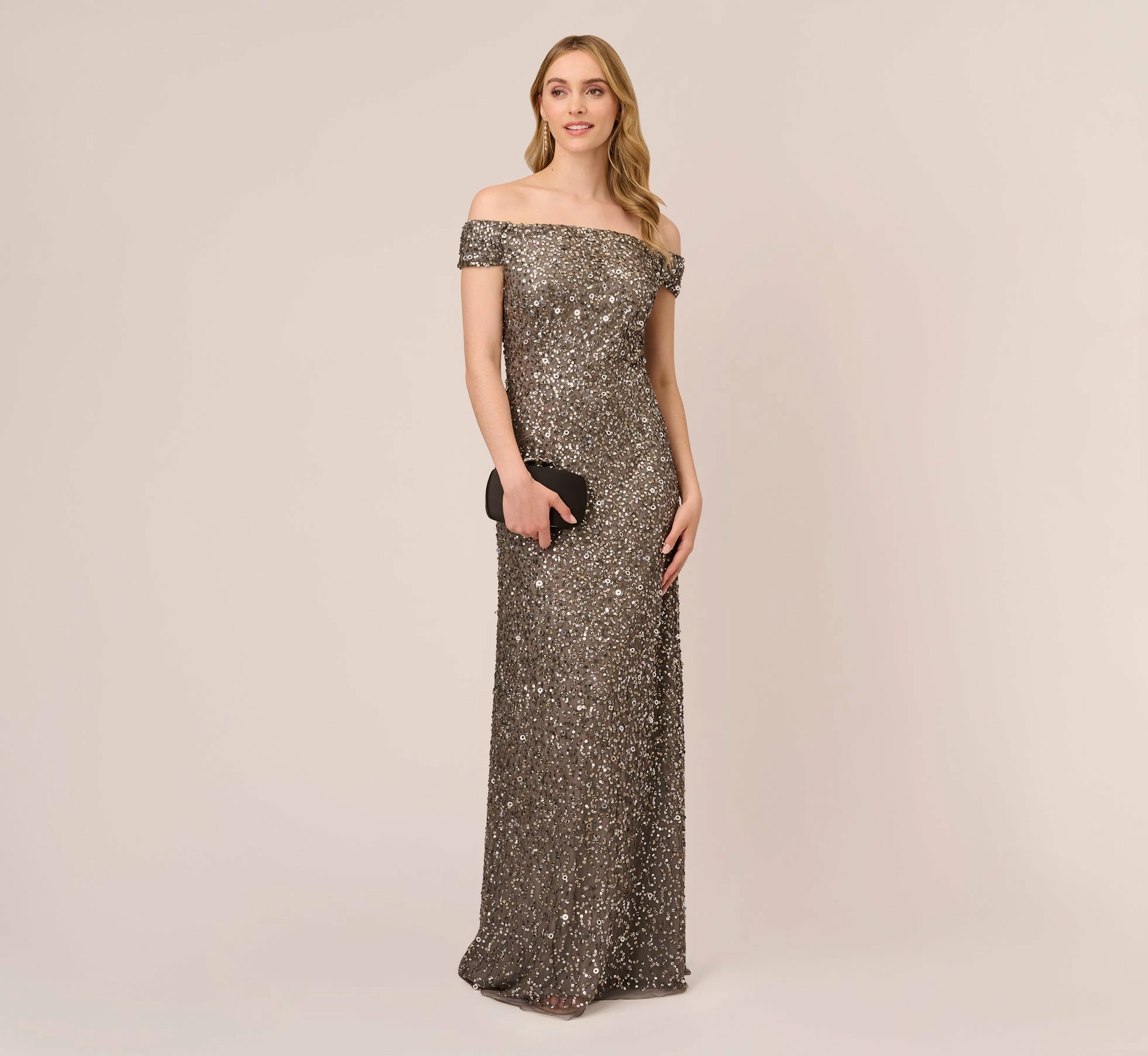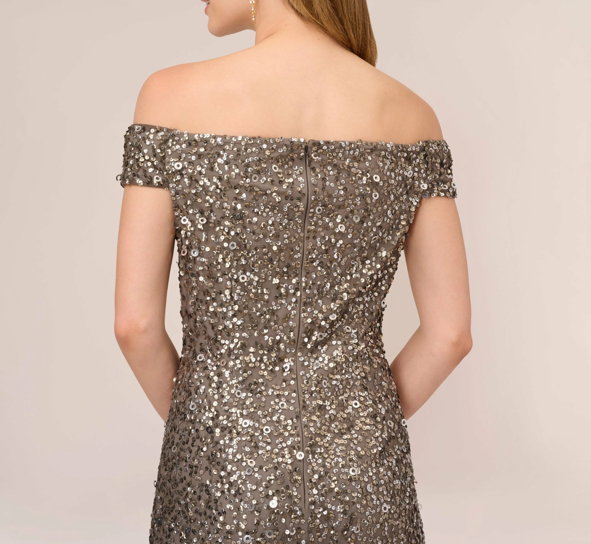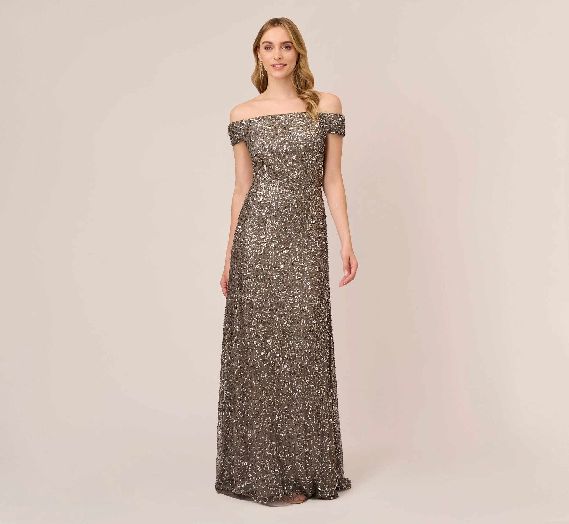 Beautiful all over sequin beading shines on this pretty evening gown. This formal dress features an off the shoulder neckline, a fitted bodice, a no seam waist (so flattering) and a soft, long skirt with slightly flared hem and a modified train. Paired with peep toe pumps, this sparkling dress is complete.