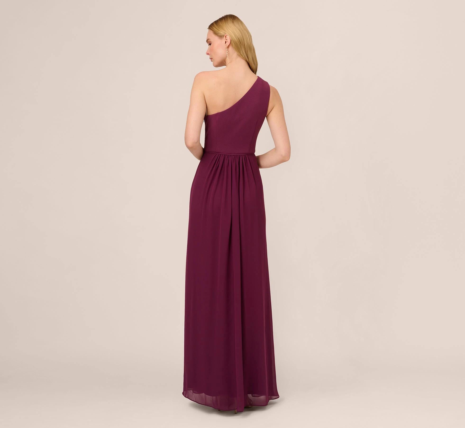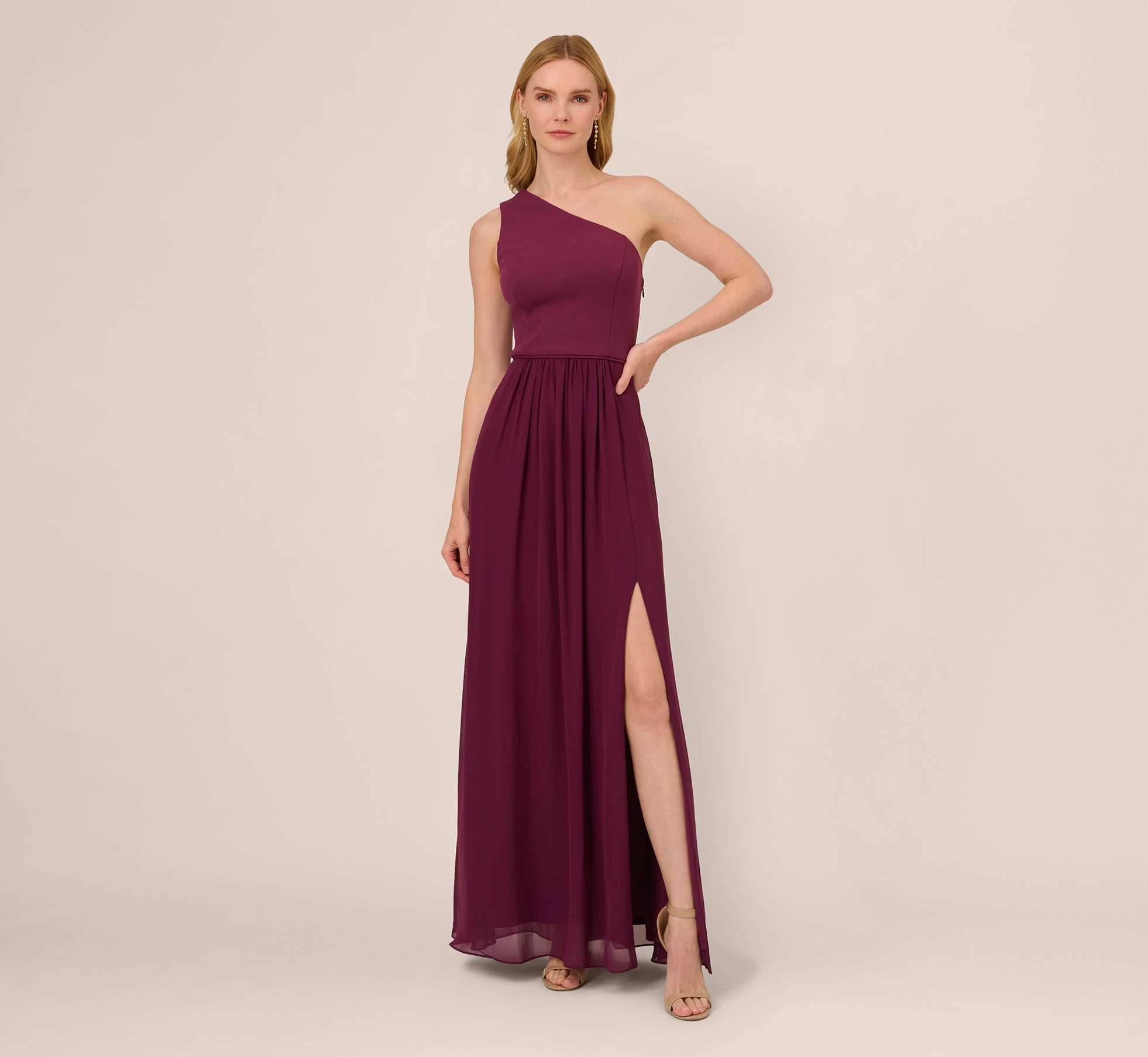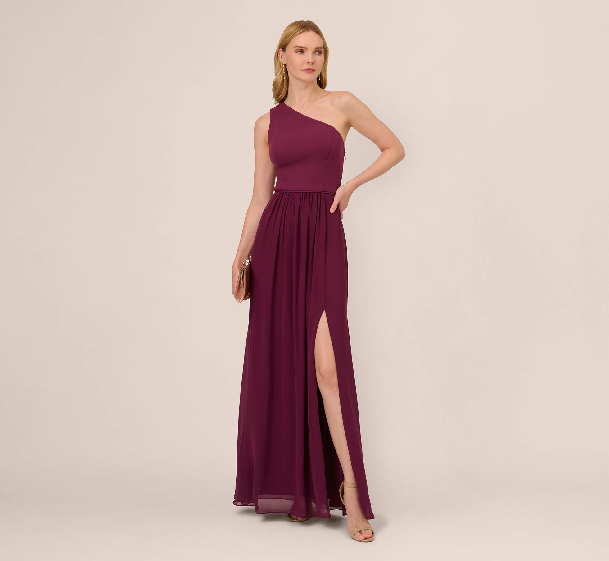 Lightweight, soft and fits like a dream, our woven chiffon floor-sweeping gown features a one-shoulder asymmetric neckline. Details: Pretty pleats at the waist for added dimension and movement. Bridesmaids, party-goers and anytime you have a special occasion, you’re going to look and feel great in this.