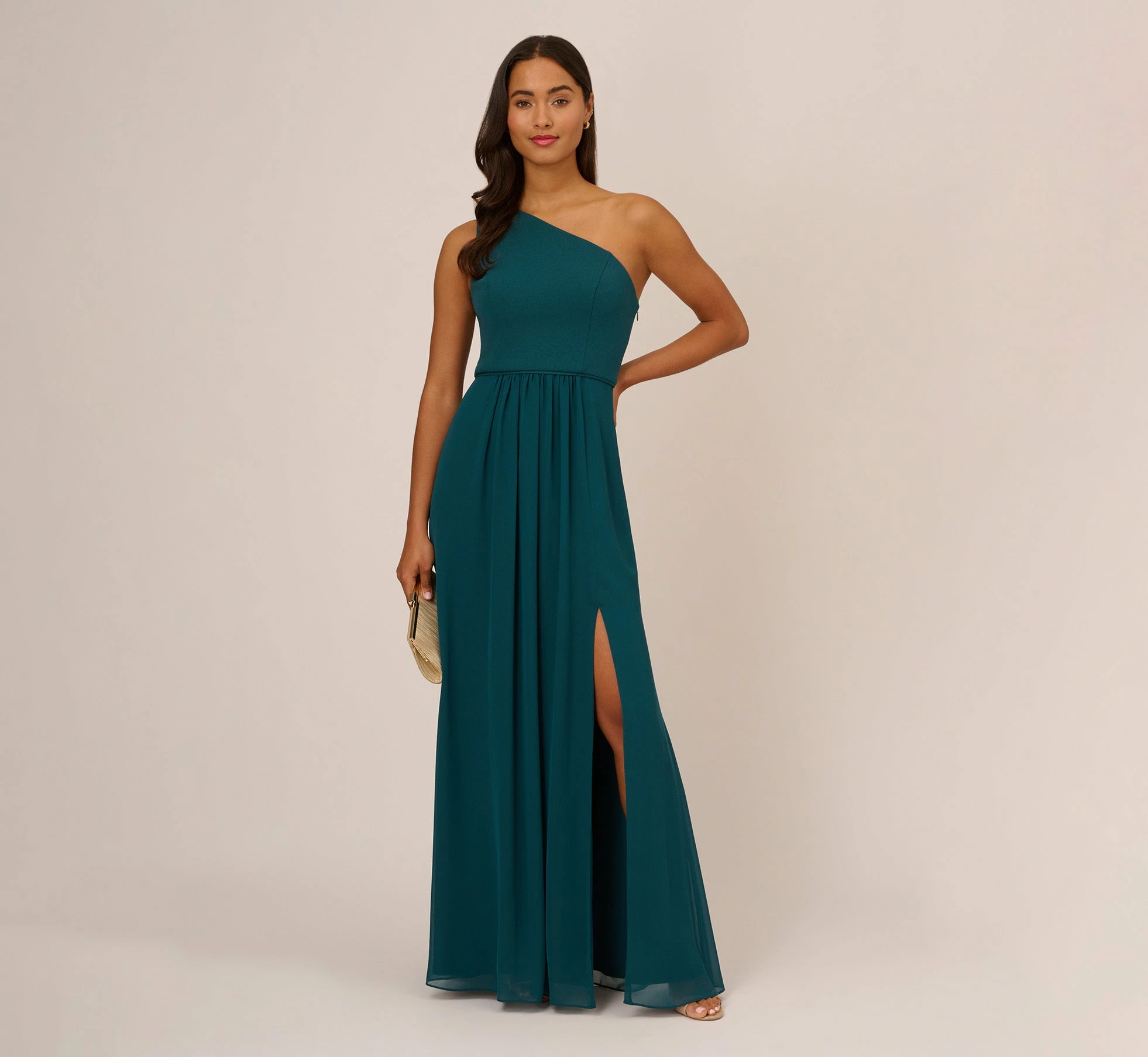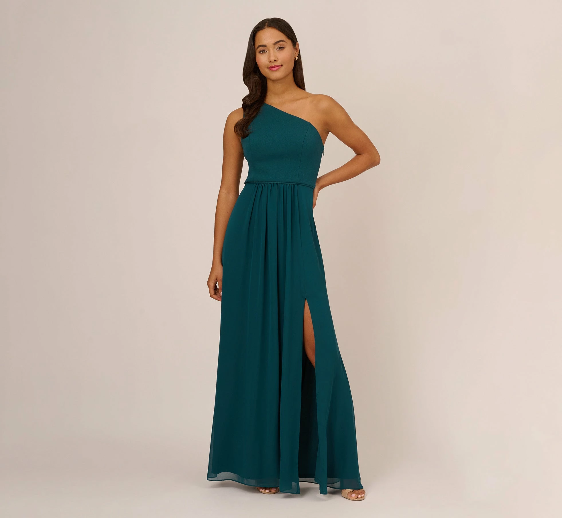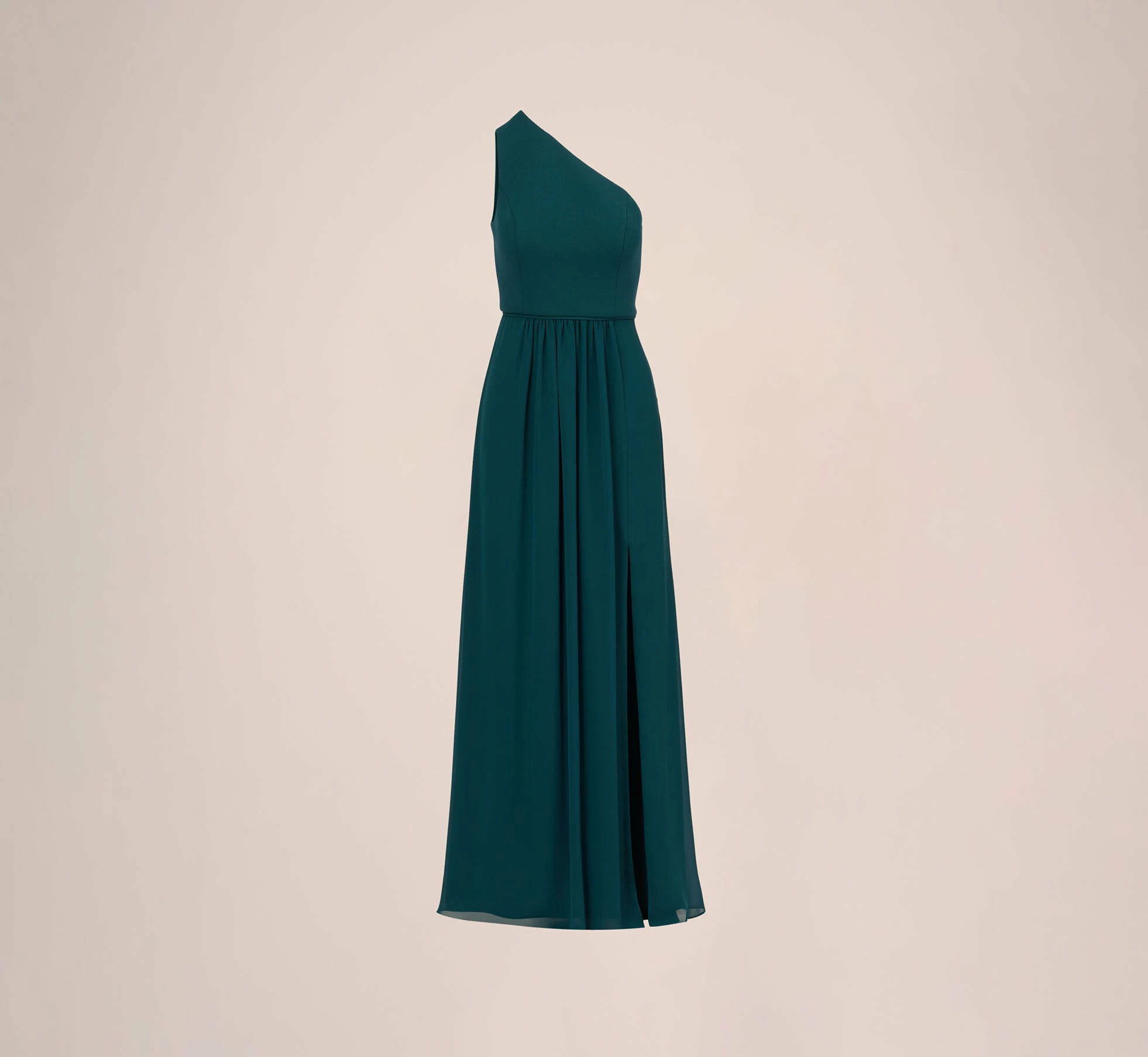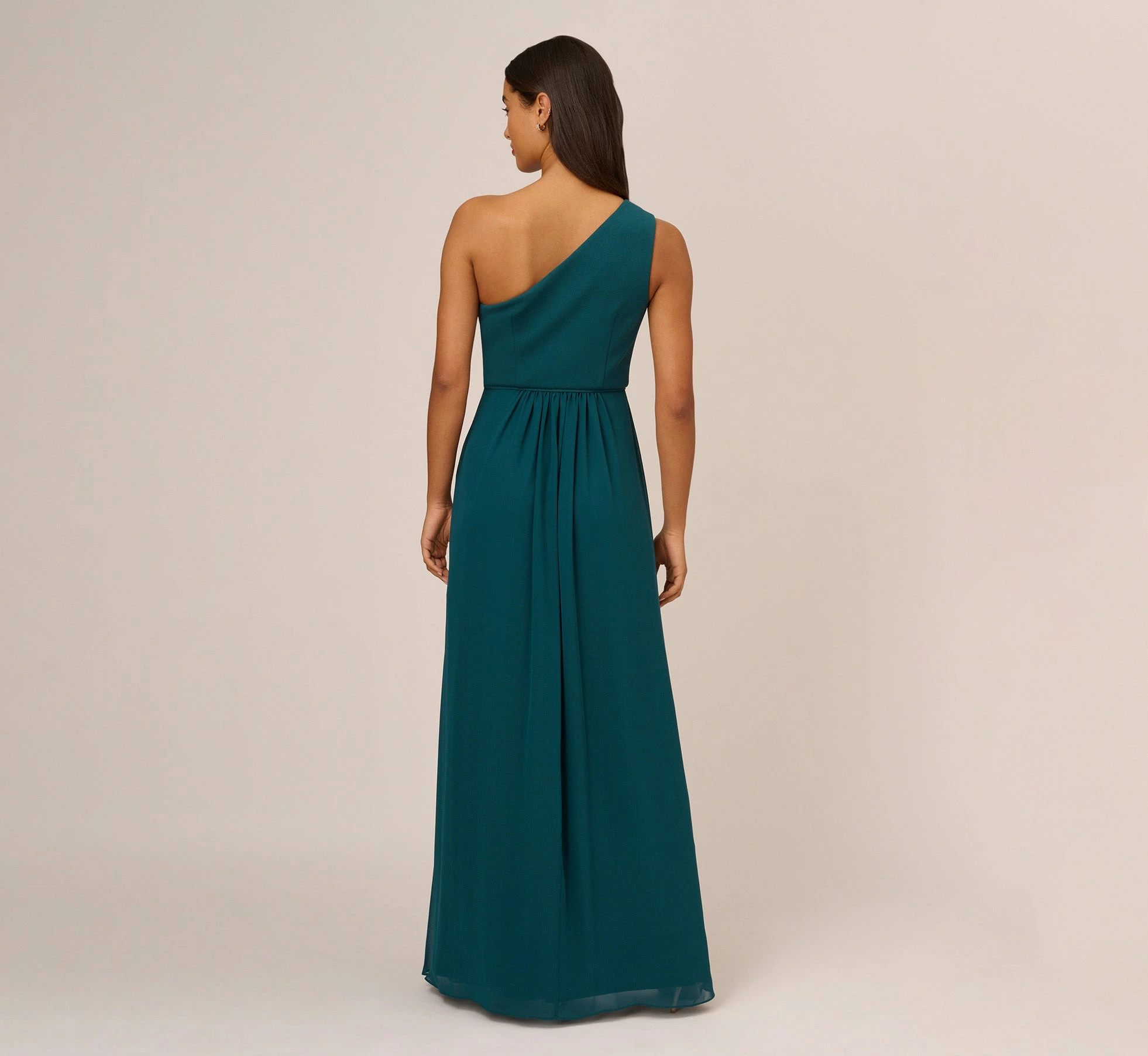Lightweight, soft and fits like a dream, our woven chiffon floor-sweeping gown features a one-shoulder asymmetric neckline. Details: Pretty pleats at the waist for added dimension and movement. Bridesmaids, party-goers and anytime you have a special occasion, you’re going to look and feel great in this.