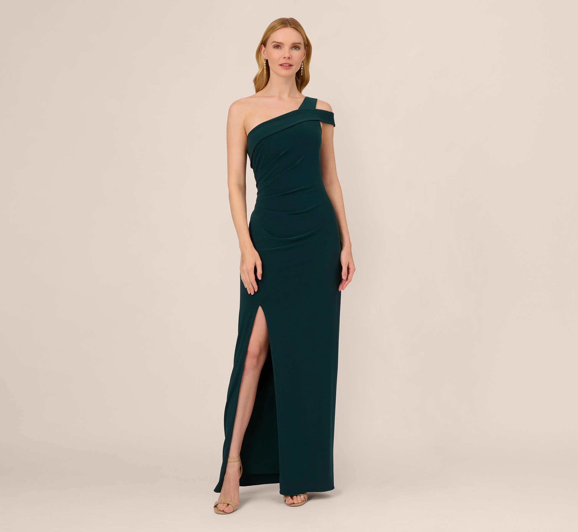 Sleek details elevate this one shoulder gown for your next night out. This formal dress features a fitted bodice with one shoulder neckline, a cutout sleeve, and a column skirt. Designed from jersey fabric, this evening gown has plenty of stretch for a comfortable fit. A thigh-high slit at the skirt and a side zipper closure completes this jersey gown. Styled with metallic high heels and statement earrings, this black-tie dress is ready for anything.
