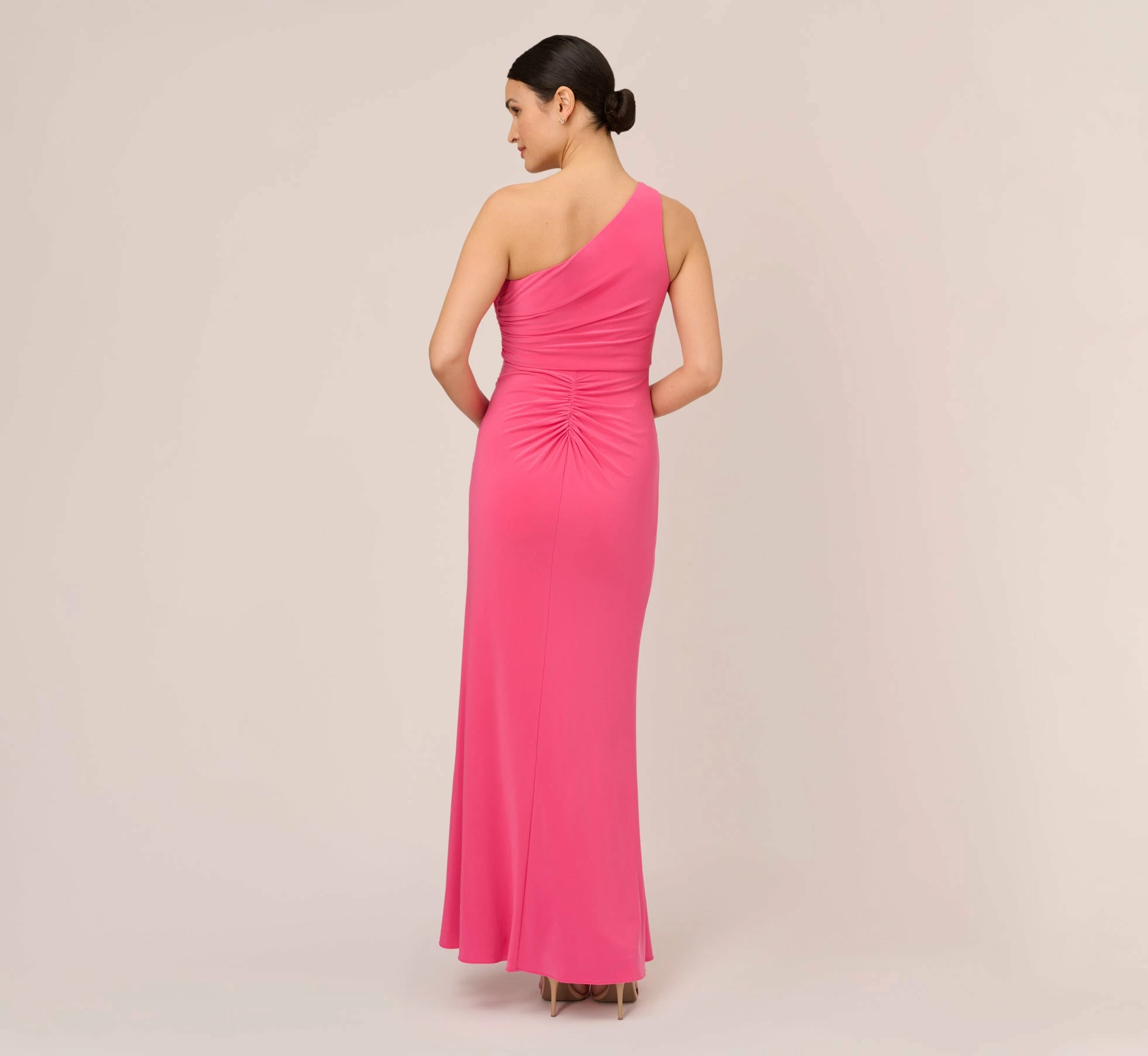 Channel your inner goddess in this modern take on a classic gown. This dress features a one shoulder neckline accented by a metal ring at the shoulder, all over draping that flatters the figure, and a slit at the mermaid skirt. Shirred details at the back of the dress add interest to thedesign. A zipper at the side closes the look. Add matching metallic accessories to complete this beautiful one shoulder gown.