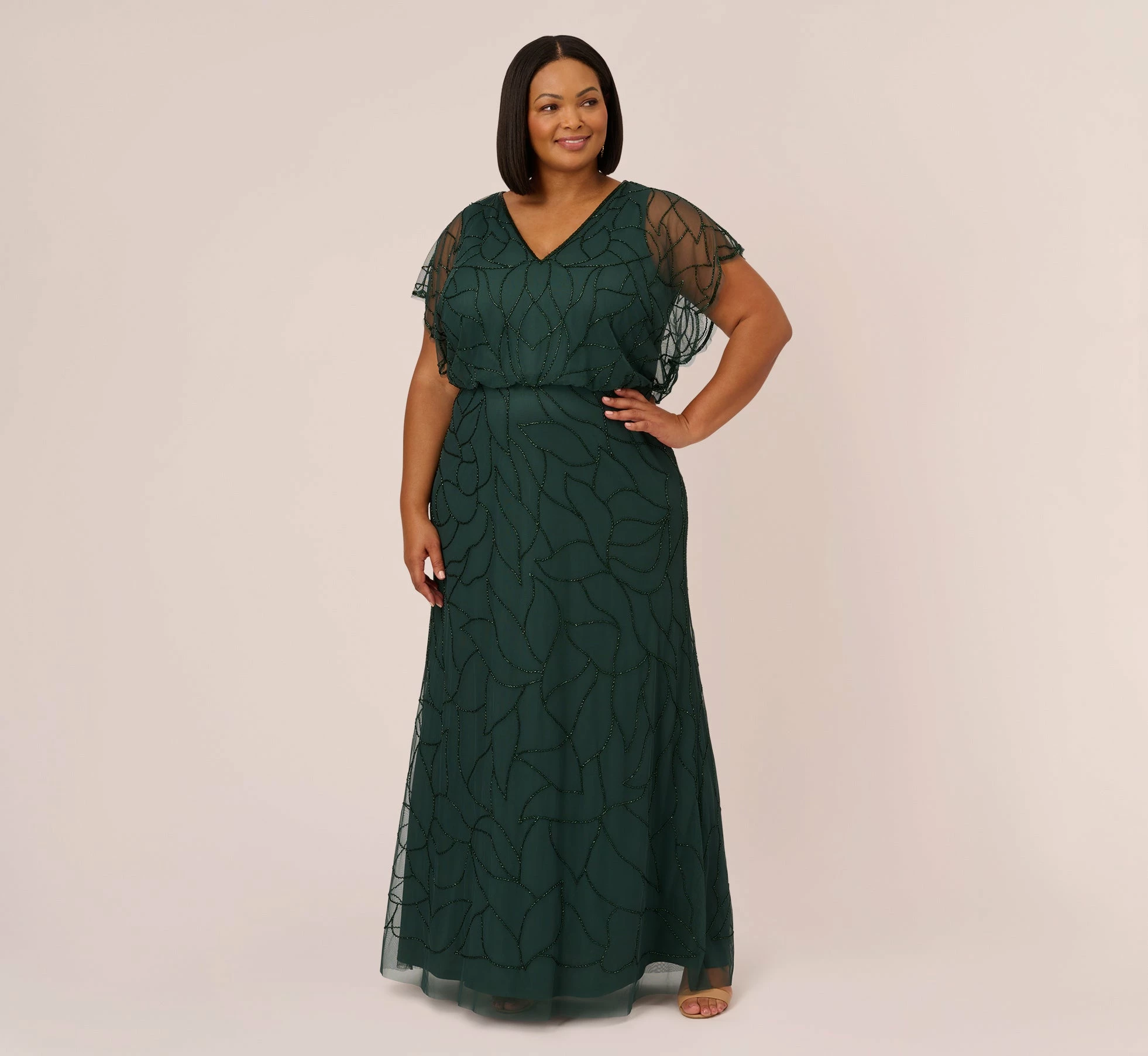 An unforgettable night out starts with this short sleeve beaded gown. This formal dress features a blouson bodice with v-neckline, sheer dolman sleeves, and a soft mermaid skirt. Lined through the body and overlaid with sheer mesh covered in lines of sparkling beads, this evening gown is a timeless style. A zipper closure at the back completes the short sleeve gown. Perfect for black-tie and formal events, this beaded dress will shine with nude heels and a contrasting clutch.
