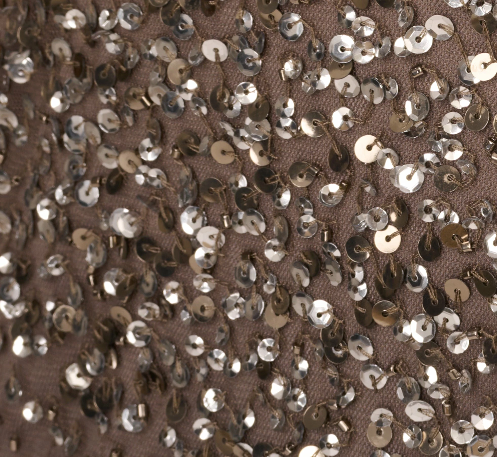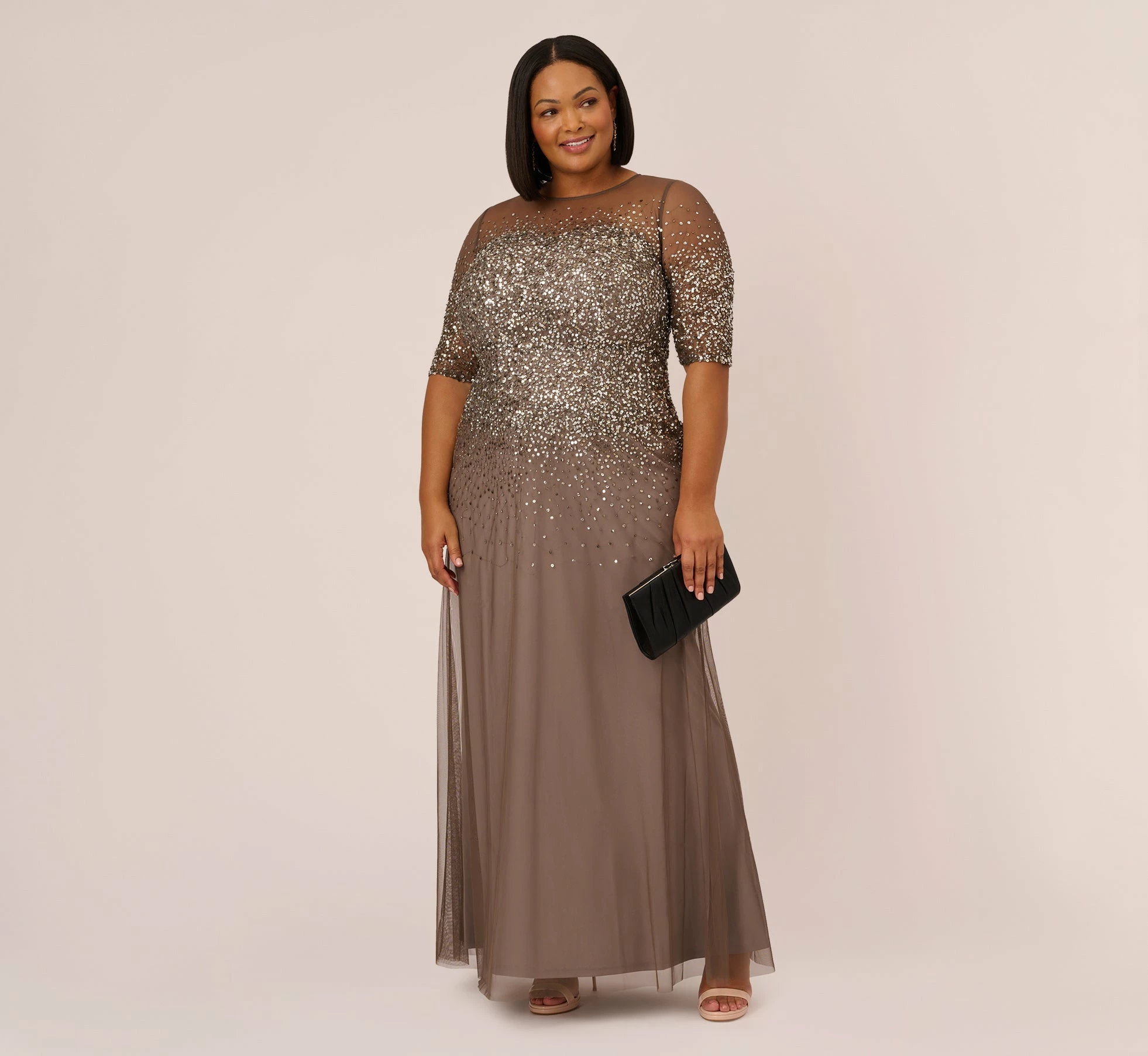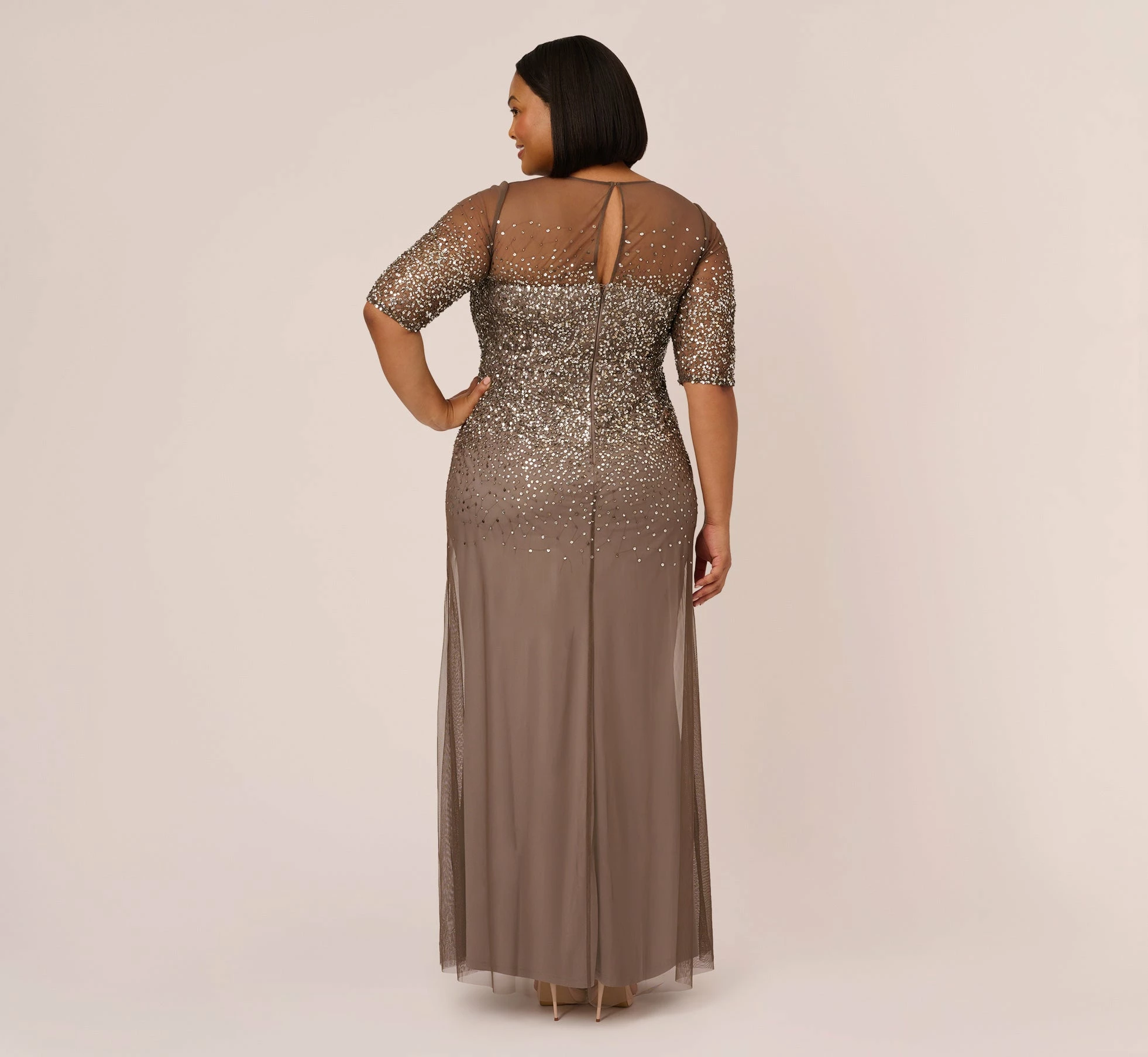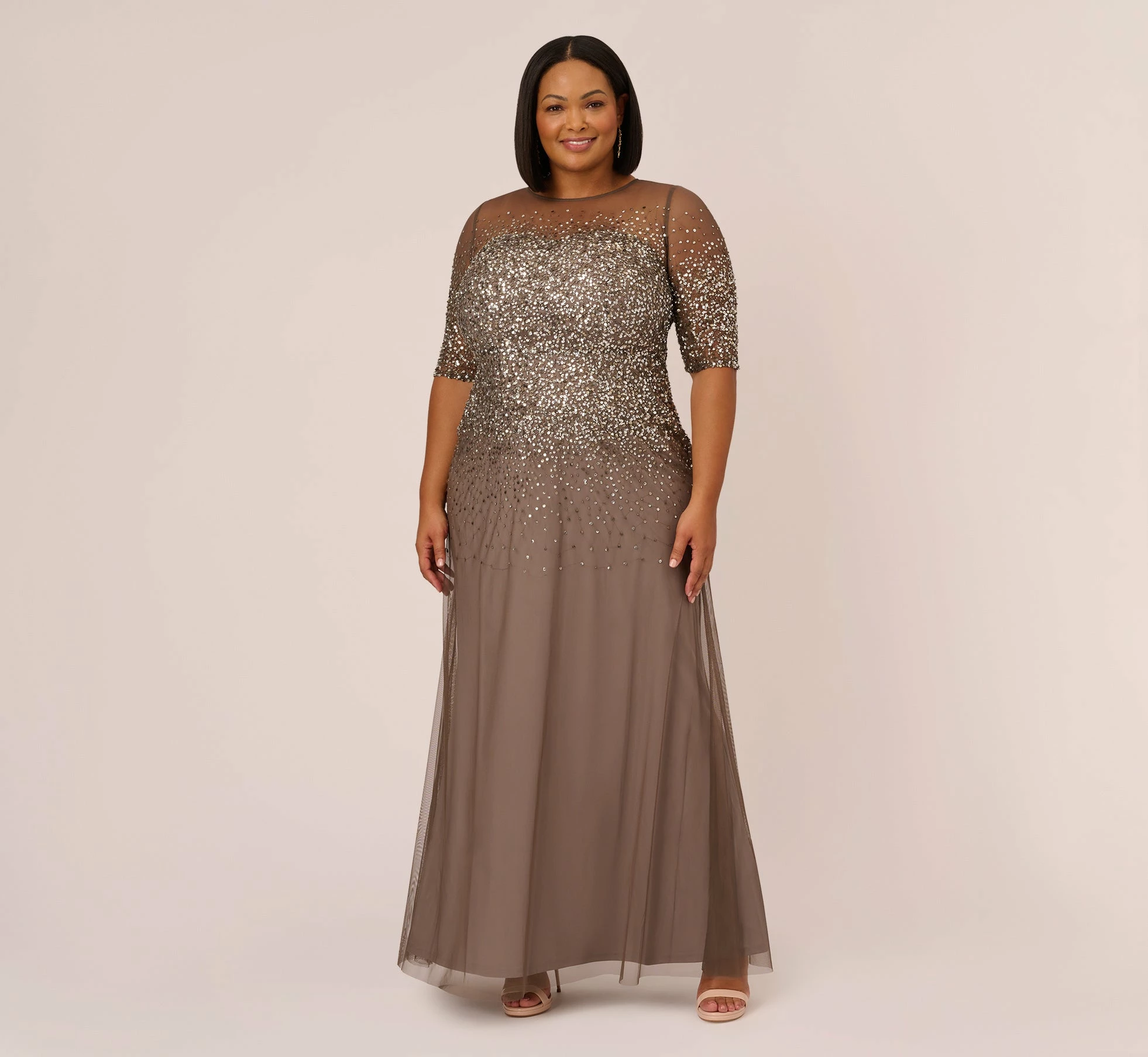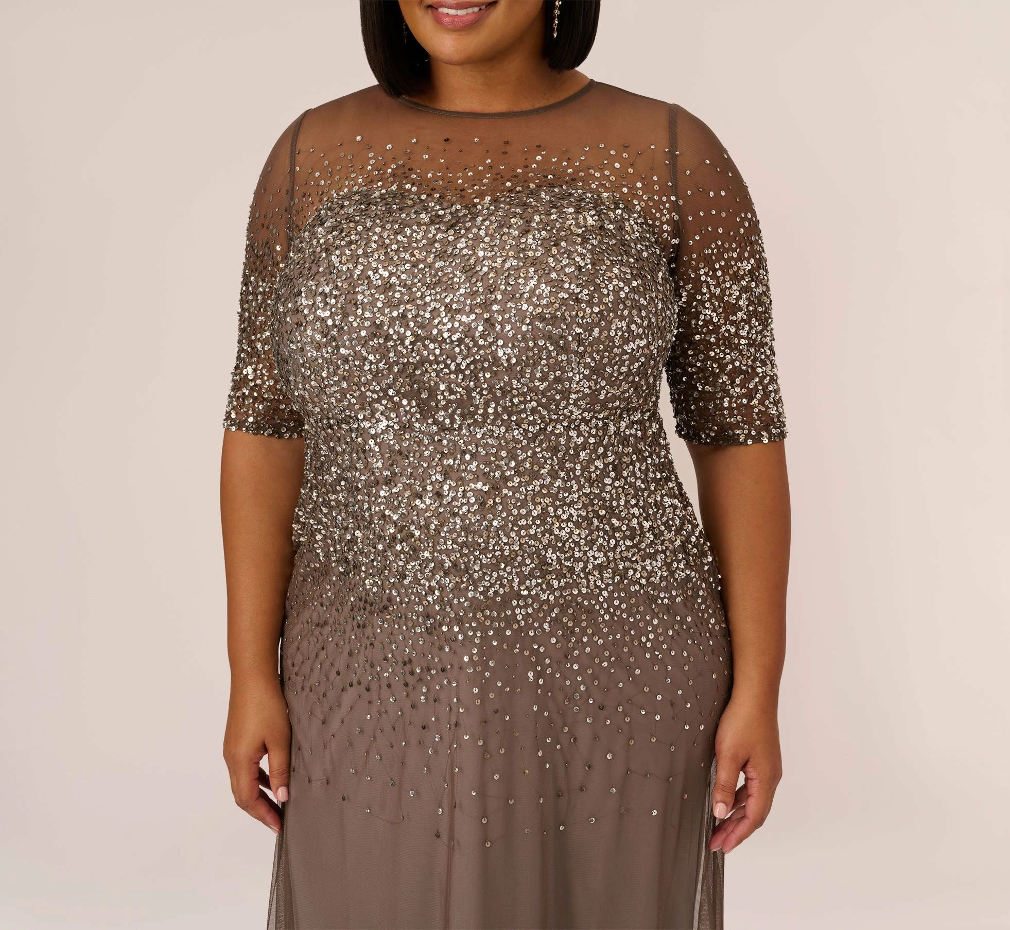 Complete with a stunning illusion necklace and keyhole back, this shimmering three quarter sleeve gown exudes elegance.This Adrianna Papell design has been made from the finest and most luxurious fabrics. All bead work, embroidery and ornamentation has been done completely by hand. Slight irregularities or variations should not be regarded as defective or damaged, rather a testament to the garment’s unique beauty.