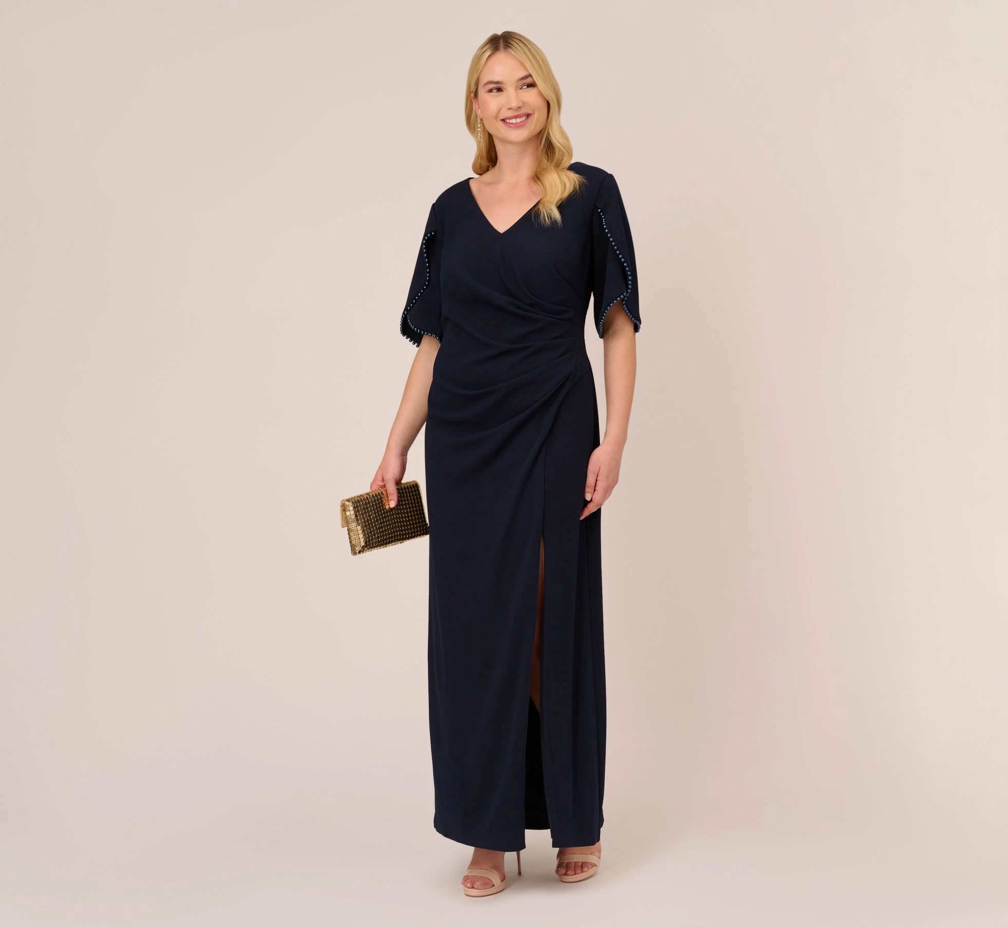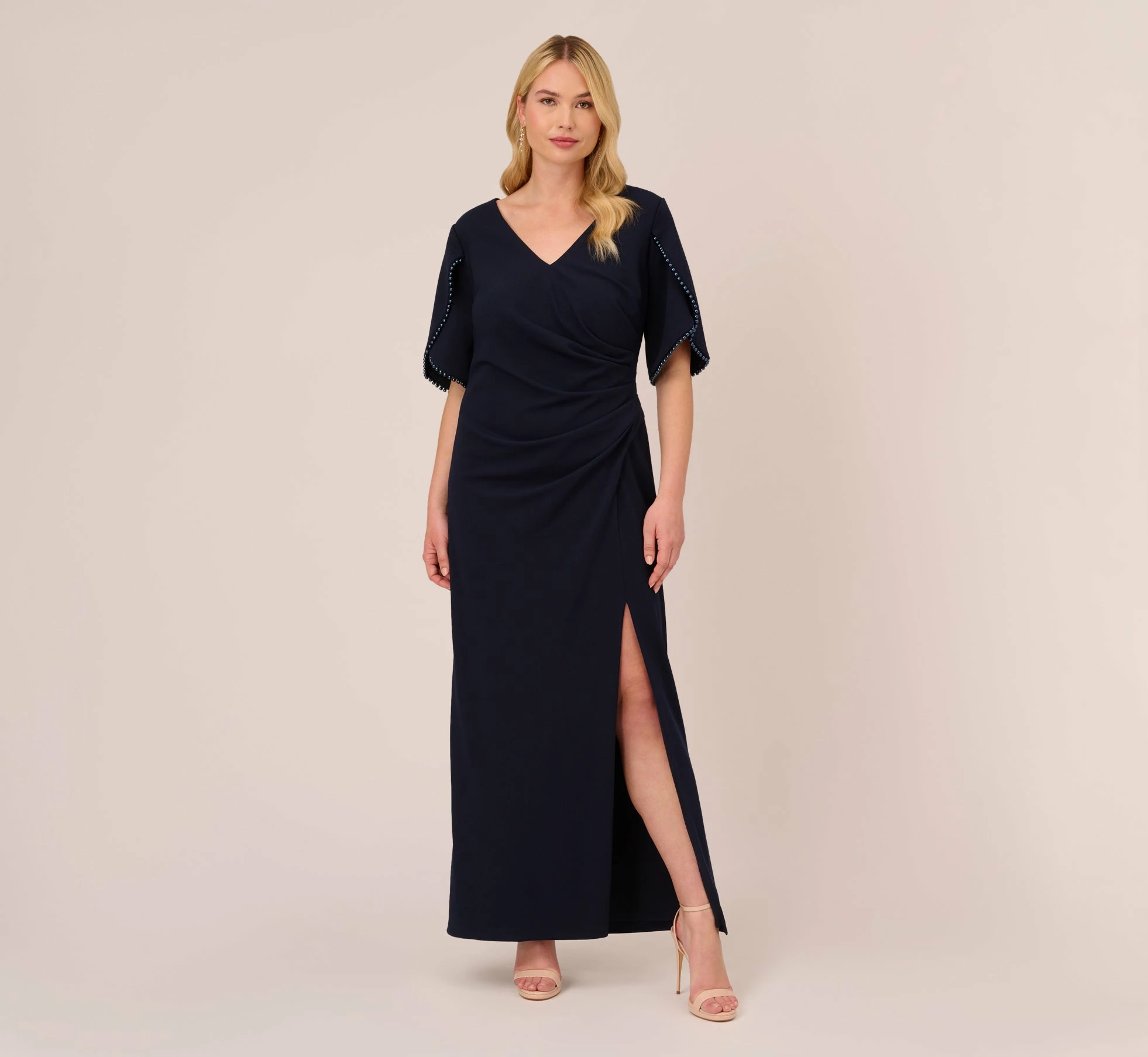 The simplest dresses are often the most timeless, and this short sleeve gown is no exception. This mermaid gown features a fitted bodice with v-neckline, elbow-length sleeves, and a full-length mermaid skirt with slit hem. Adorned in sweet pearl trim, the short sleeves have a petal-like design for added interest. Draped details throughout the crepe fabric make this formal dress a flattering look. A zipper back closes this evening gown. Teamed with a contrasting clutch and heels, this sophisticated dress is perfect for a formal or black-tie wedding or event.
