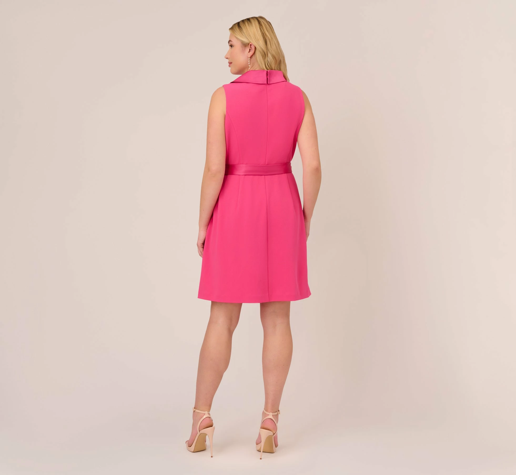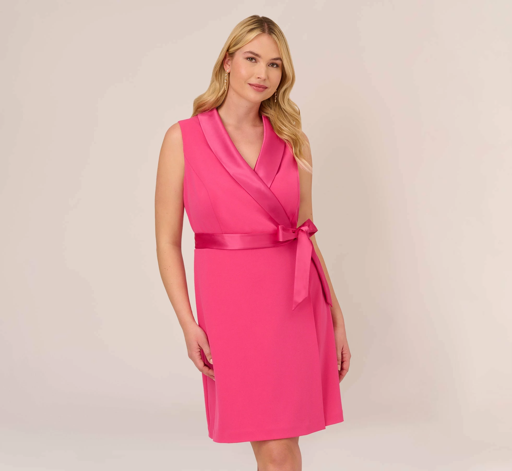 A classic menswear-inspired design, this tuxedo style faux wrap sleeveless dress is crafted in a luxe yet comfortable stretchy knit crepe. Details we love: the shawl collar and self-tie belt. (so flattering). Perfect to wear to the office and out to dinner or cocktails and makes a chic option for bridal showers and wedding receptions.