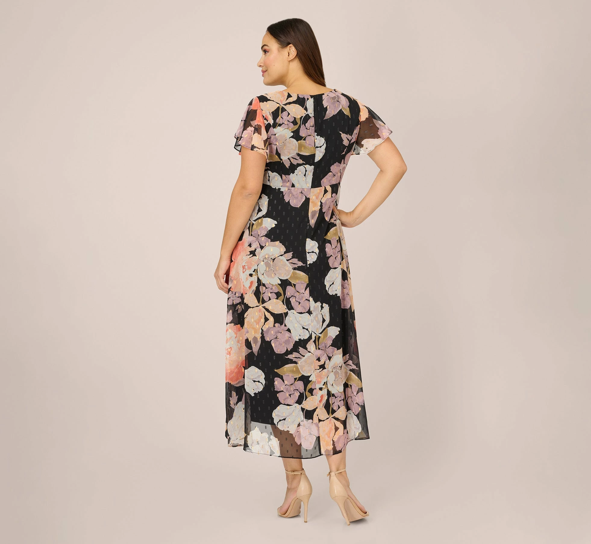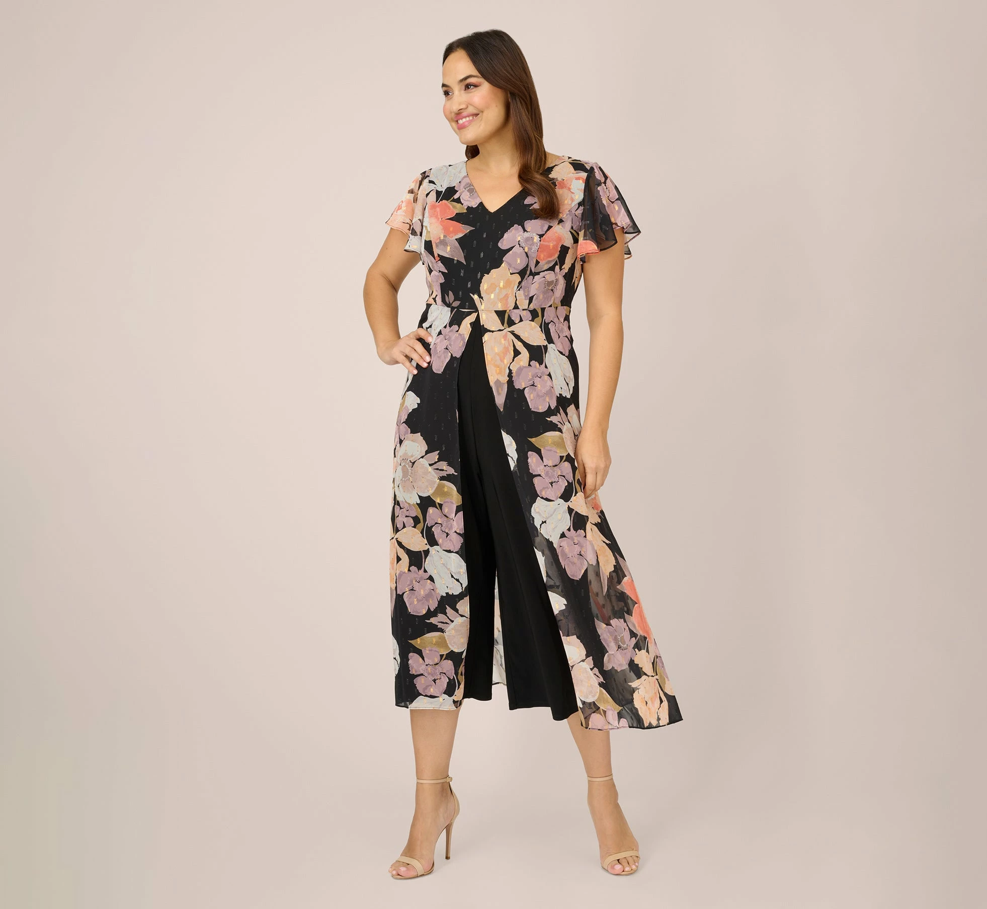 Bold and easy-fitting, our best-selling jumpsuit features a lightweight floral-printed metallic clip dot chiffon overlay skirt and flutter sleeves for added dimension. We love the super comfortable and effortless cropped jersey lining and wide-leg pants that feel amazing day to night. Sleek back hook-and-eye/zip closure.