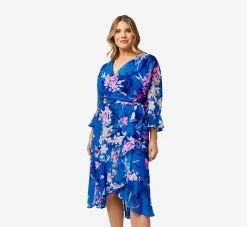 Feminine and flirty, we’re obsessed with this faux wrap dress crafted in a woven chiffon, especially the chic floral print. This versatile style features a surplice top with delicately ruched shoulders and elbow sleeves with bell cuffs. The high/low wrap skirt is finished with a ruffled flounce hem. A self-tie belt finishes this effortlessly chic style. Back hook-and-eye and zip closure. Perfect for brunch, dinner dates, baby/bridal showers and wedding receptions.