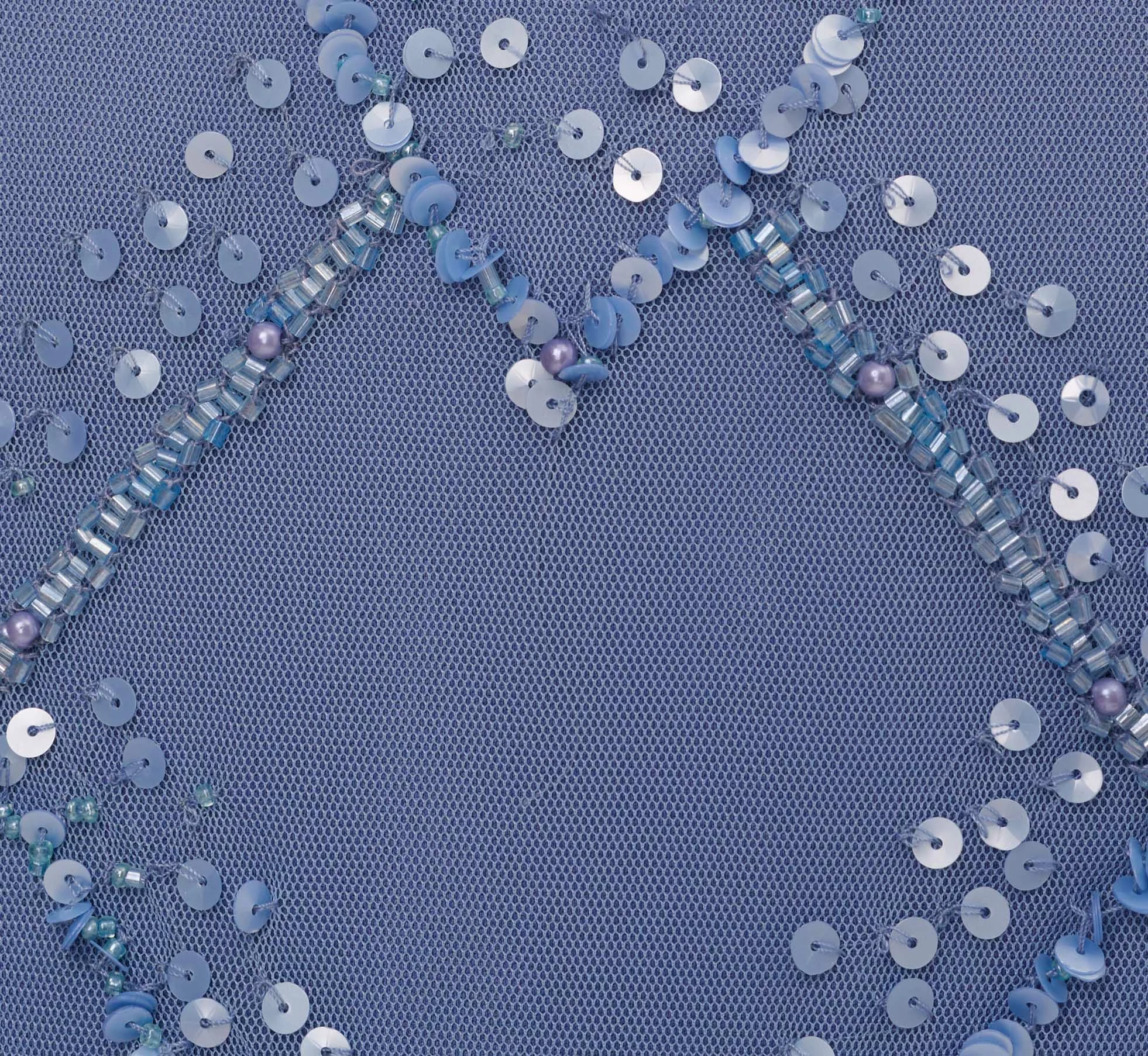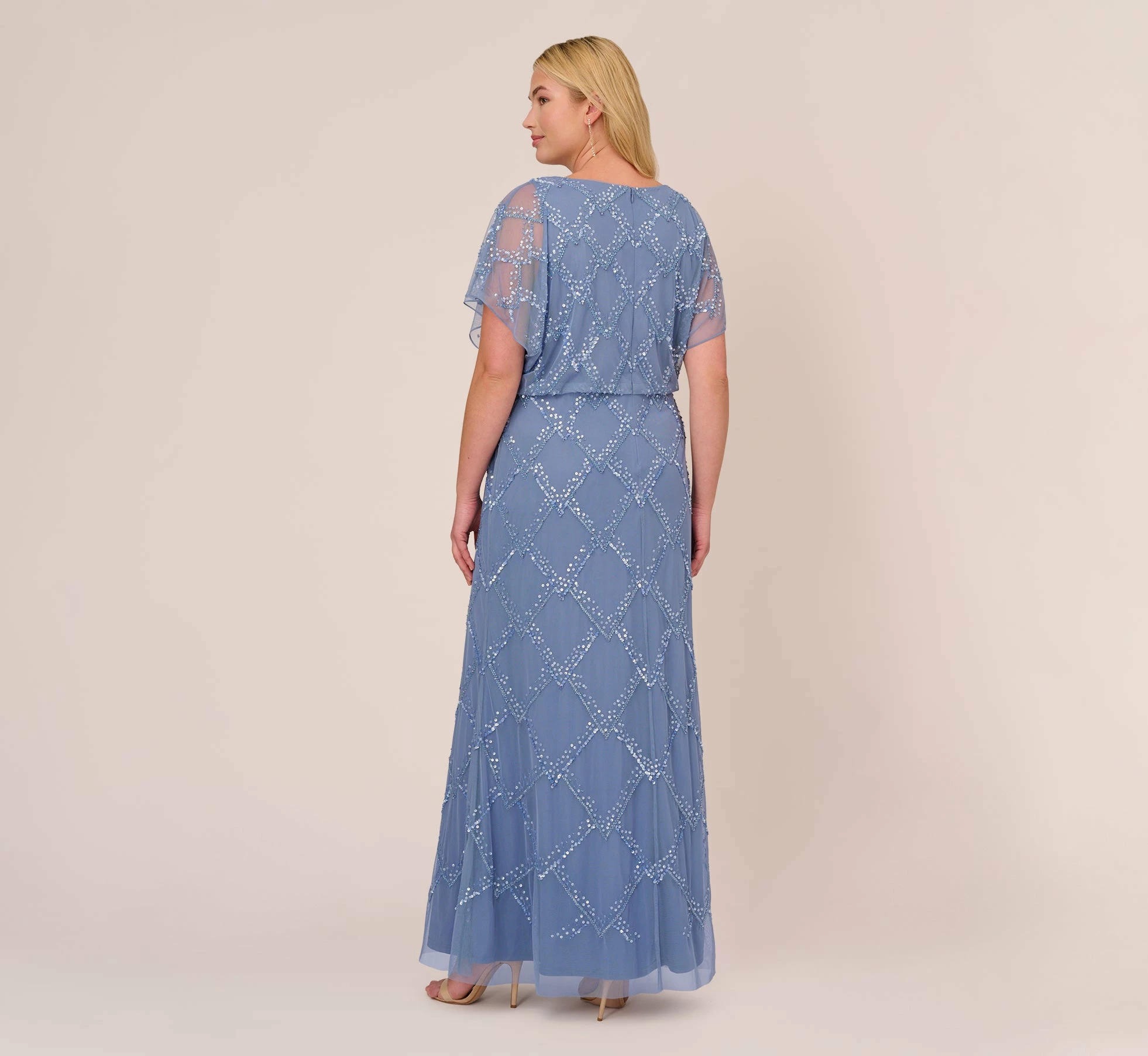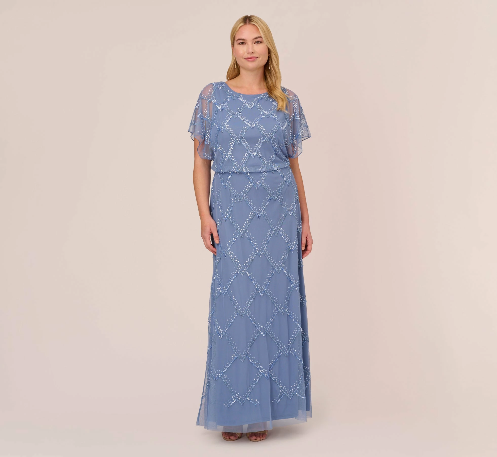Shimmering, light as air and exceptionally flattering, this floor-sweeping gown is designed in our signature and ultra-flattering blouson fit. Obsessed with the shimmering hand beadwork in a geometric pattern. Details we love: the dramatic sheer illusion flutter sleeves.