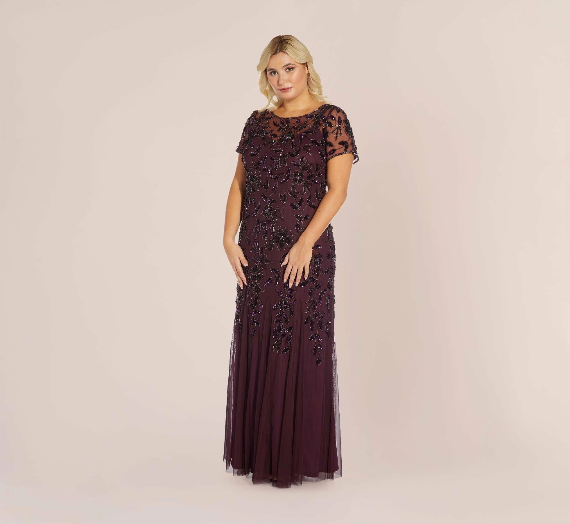 A work of art: our long and romantic gown dazzles with allover handsewn beading in a feminine floral pattern that catches the light with every twirl. A streamlined silhouette is eased with the mermaid skirt with godets to create the right amount of movement. All the details: our iconic (and flattering) no waist seam, sheer illusion yoke and cap sleeves. Sleek back zip closure.