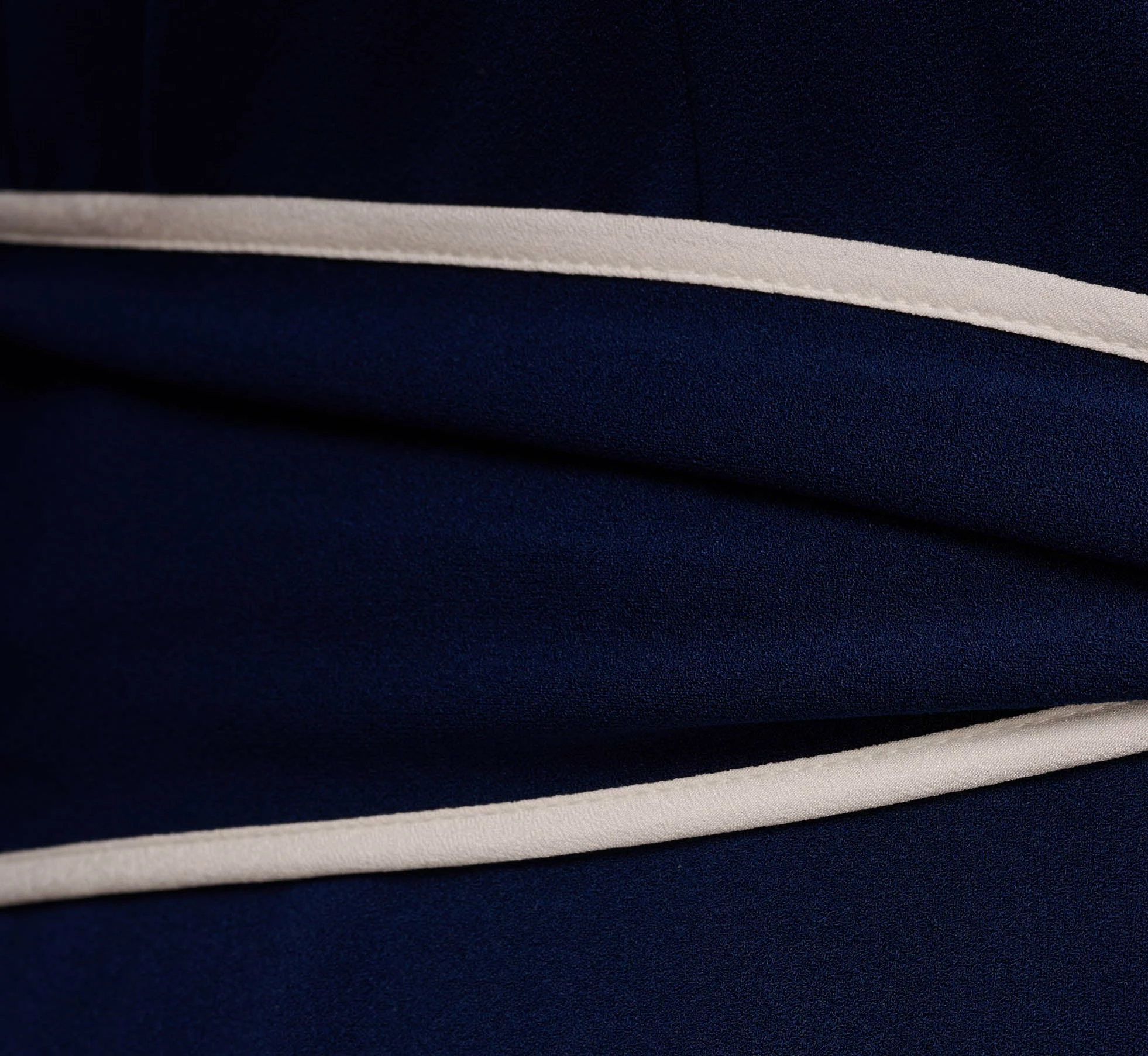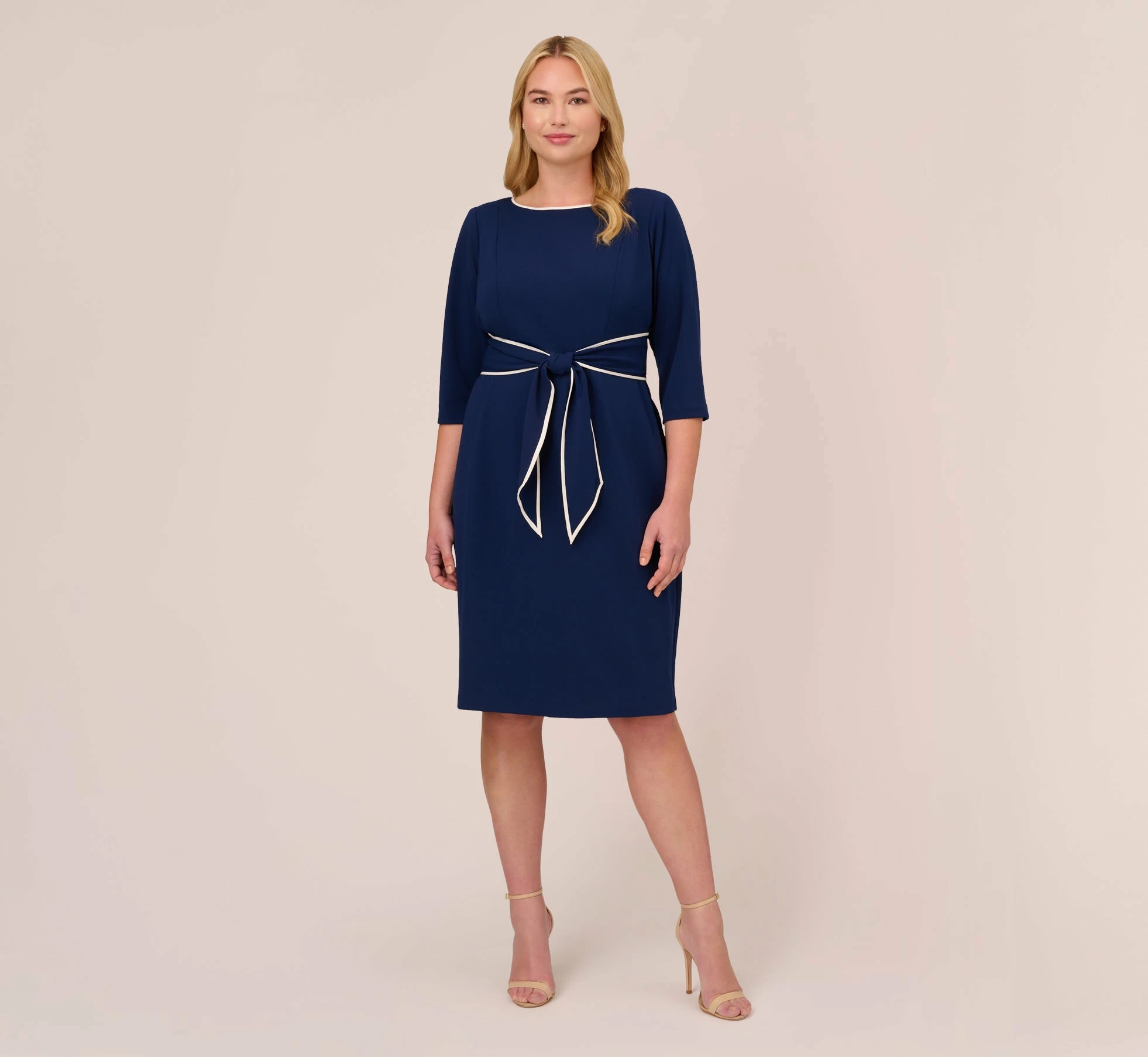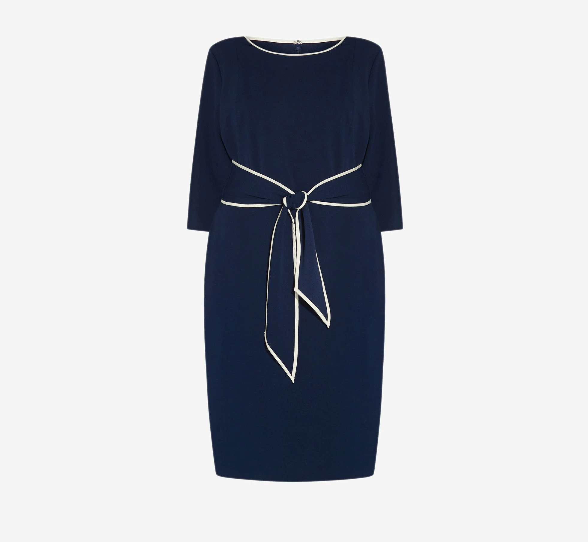 A modern, easy sheath in soft knit crepe, designed in an elegant midi length and accented with ¾-length sleeves, a streamlined skirt and ultra-flattering tie waist. We love the subtle tipping at the neckline and waist tie.