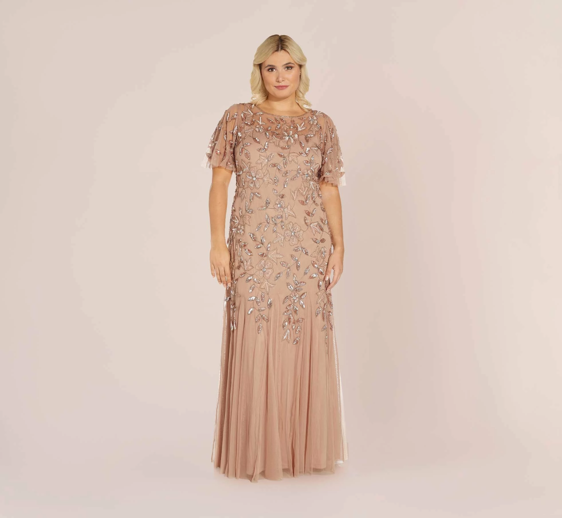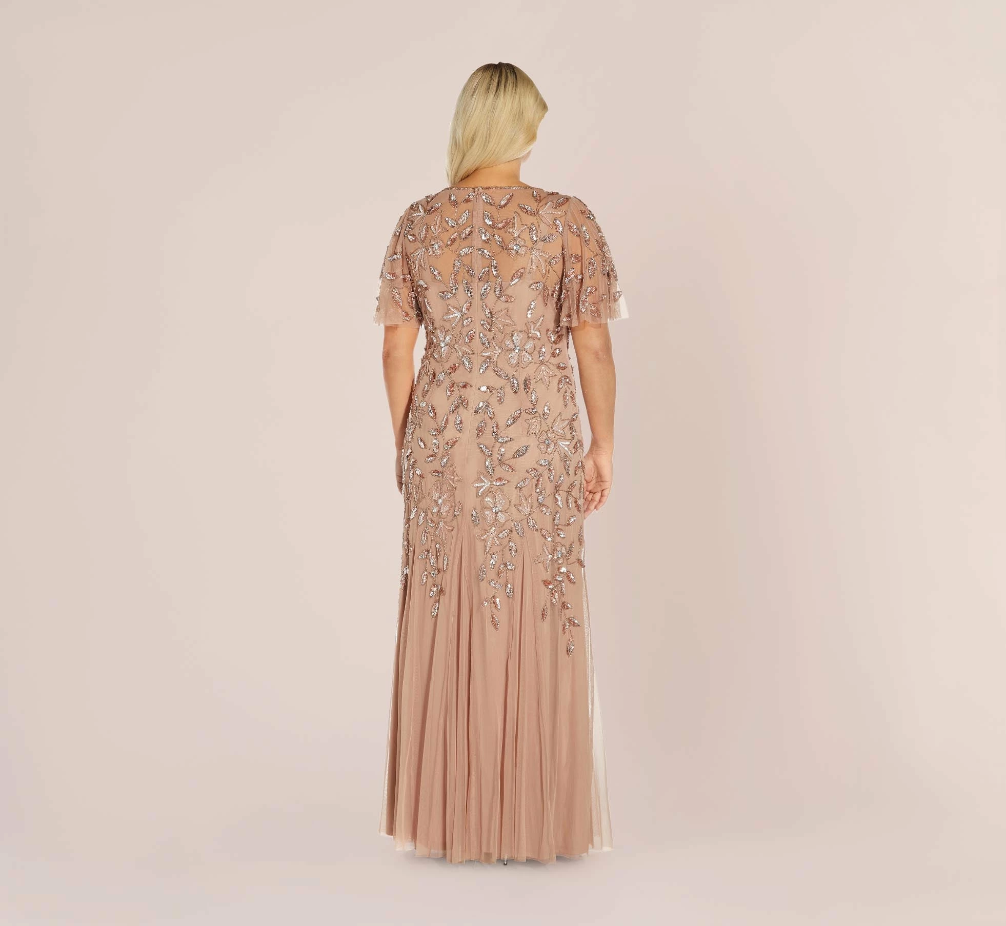 A work of art: our long dress features exquisite hand beadwork in a delicate floral pattern. Designed in a streamlined silhouette that is eased with elbow-length flutter sleeves and soft mermaid skirt with godets that create right amount of movement. All the details: flattering no waist seam and sheer illusion yoke and sleeves. Sleek back zip closure. Calling all mothers-of-the-bride and groom, we love this for you.