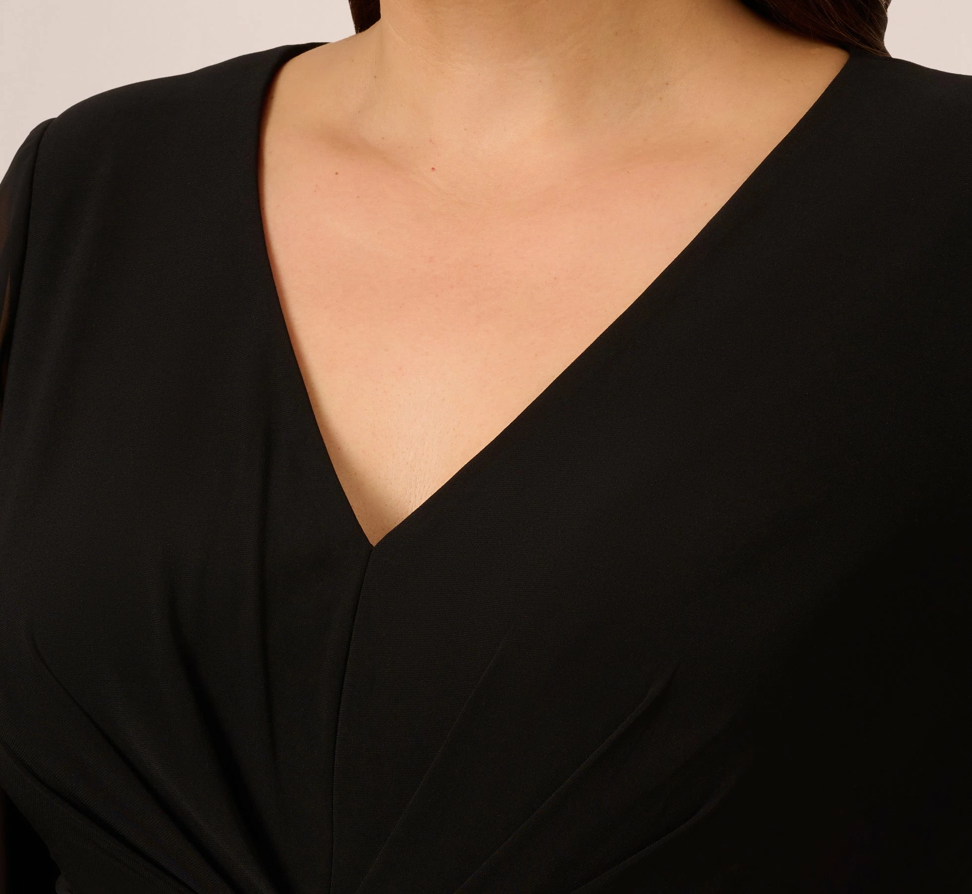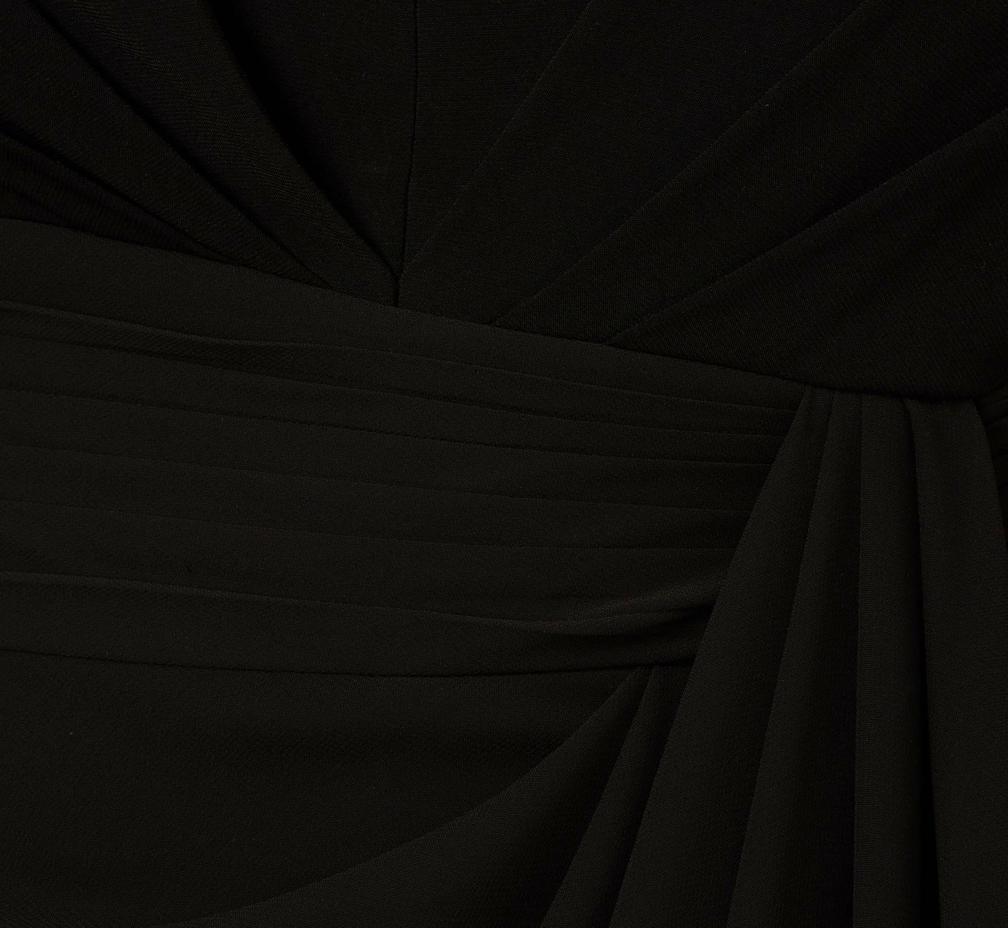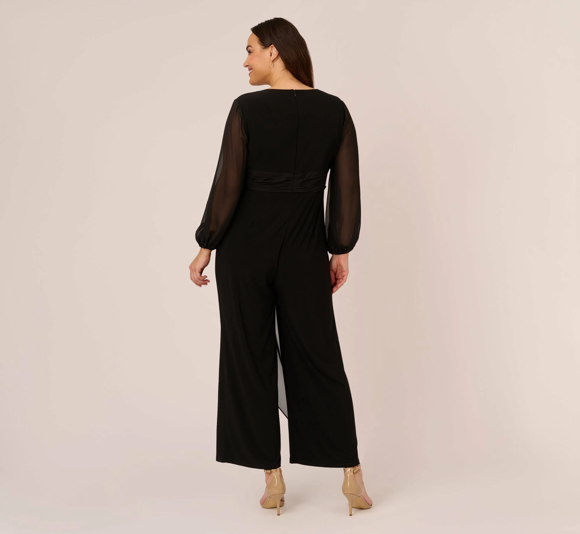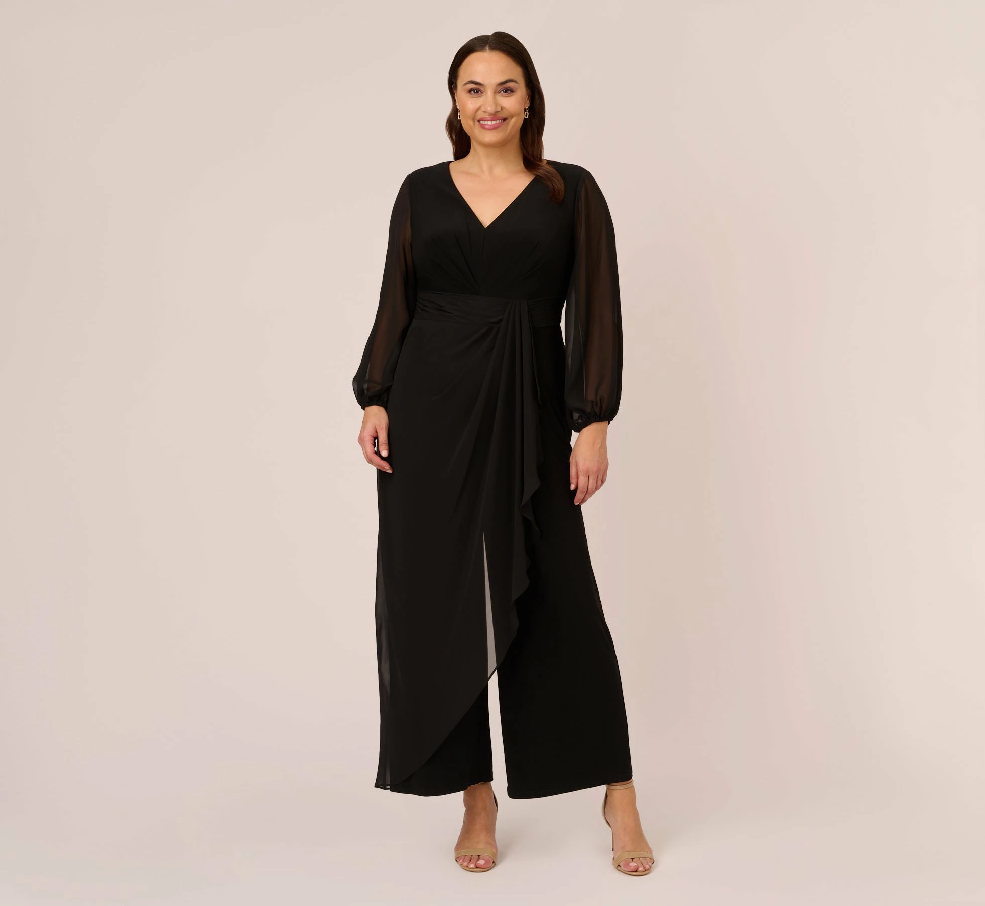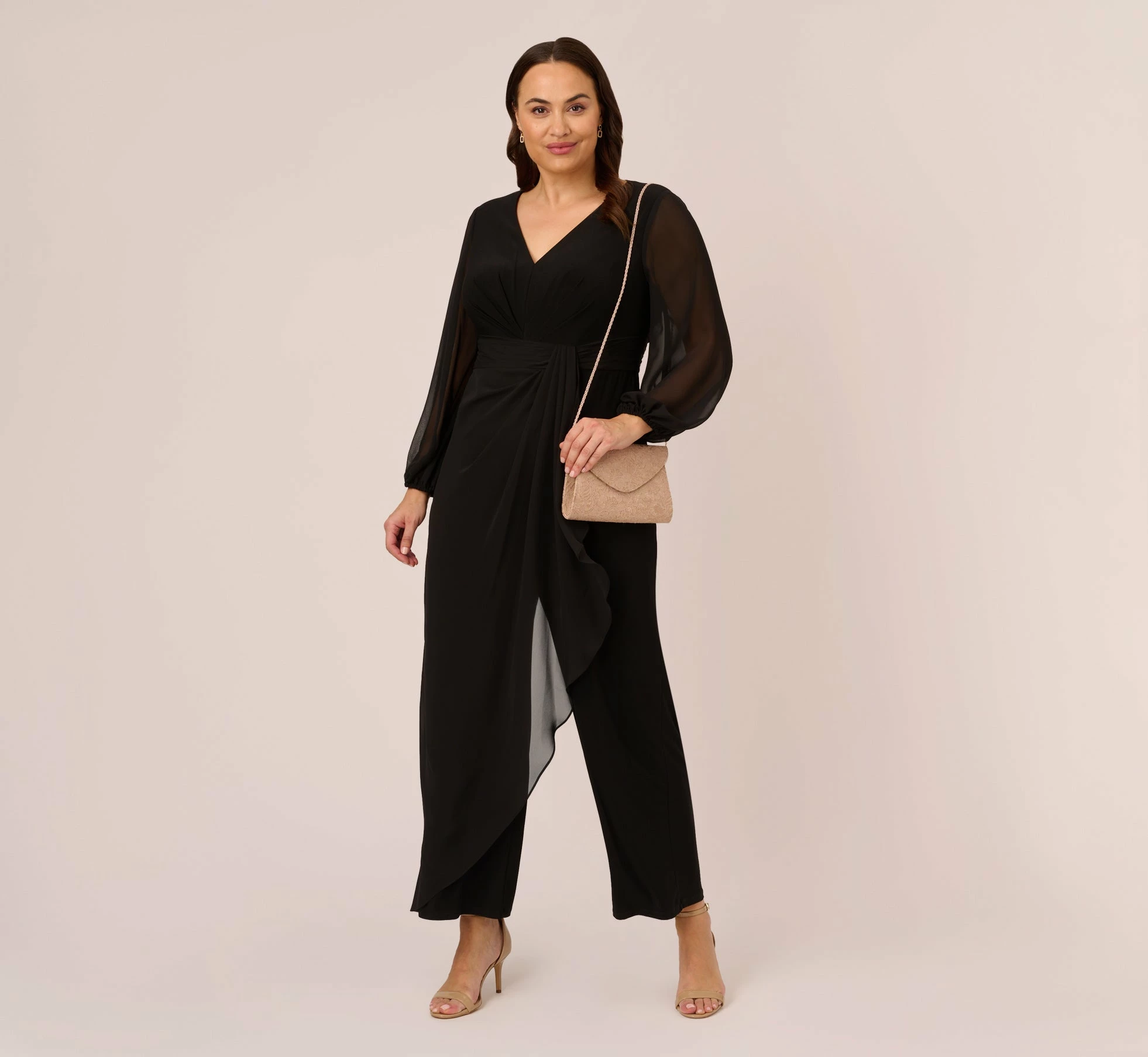 Wherever you’re headed, this long sleeve jumpsuit will be a go-to look. The jumpsuit features a fitted bodice with v-neckline and long bishop sleeves. The chiffon overlay showcases pleating at the bodice before cascading down the jumpsuit’s silhouette. This elegant jumpsuit has wide legpants and a zipper back. Crafted from jersey fabric, this jumpsuit is very stretchy and will be comfortable all day. Paired with open-toed heels and sparkling jewels for an evening event or a closed-toe pump for day, this dressy jumpsuit is an appropriate look for all of your events.