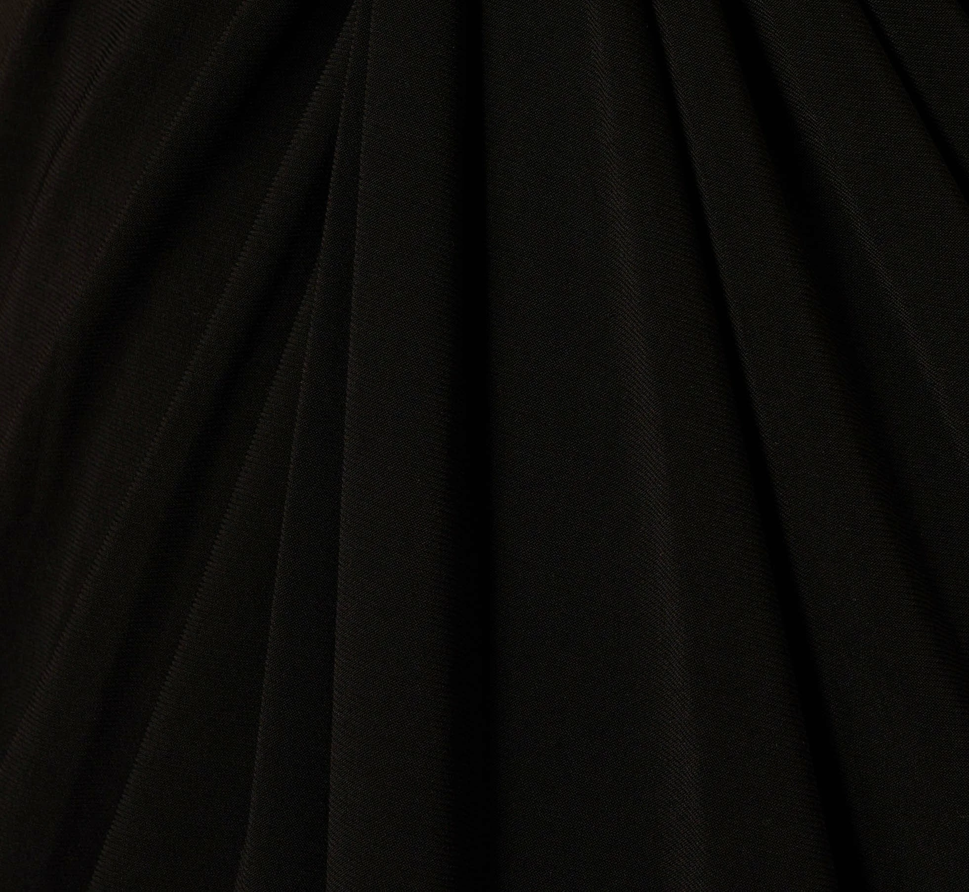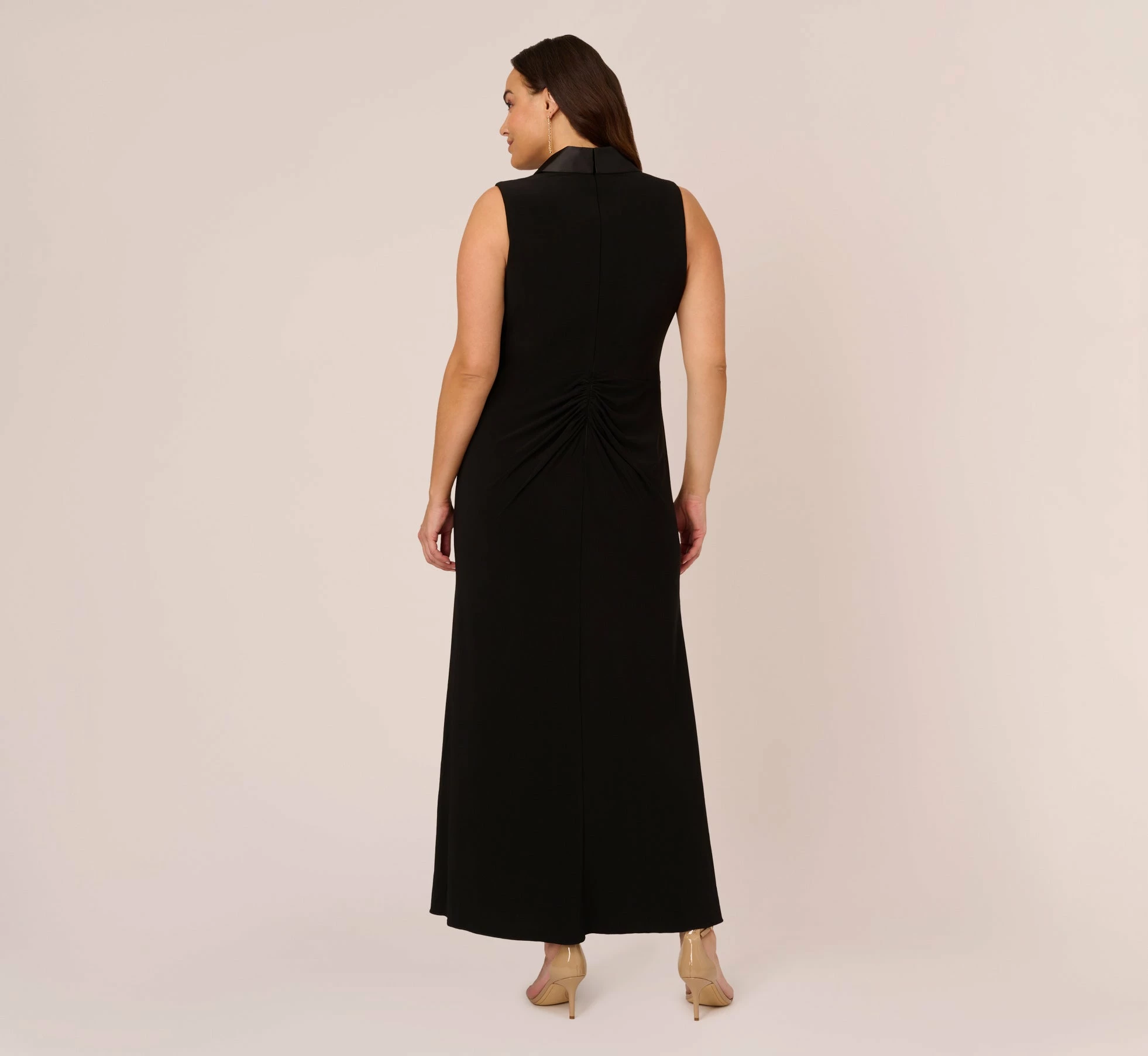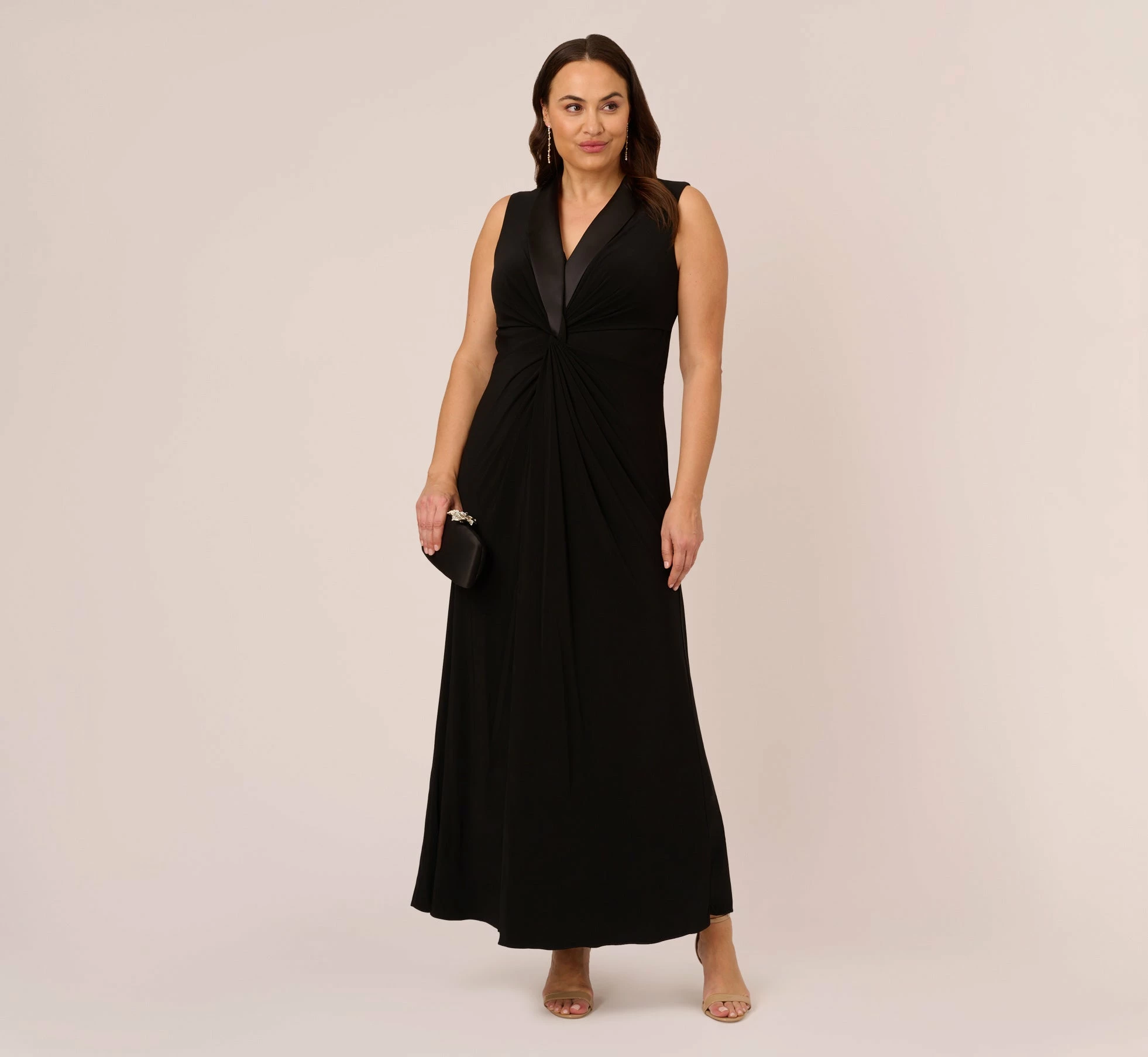 Menswear-inspired tuxedo gown crafted of a refined stretch matte jersey and features a flattering twist-front bodice with a surplice neckline and a satin shawl collar. Ruched detailing accents the back. Sleek back zip closure. A go-to style to wear to wedding celebrations and black-tie galas.