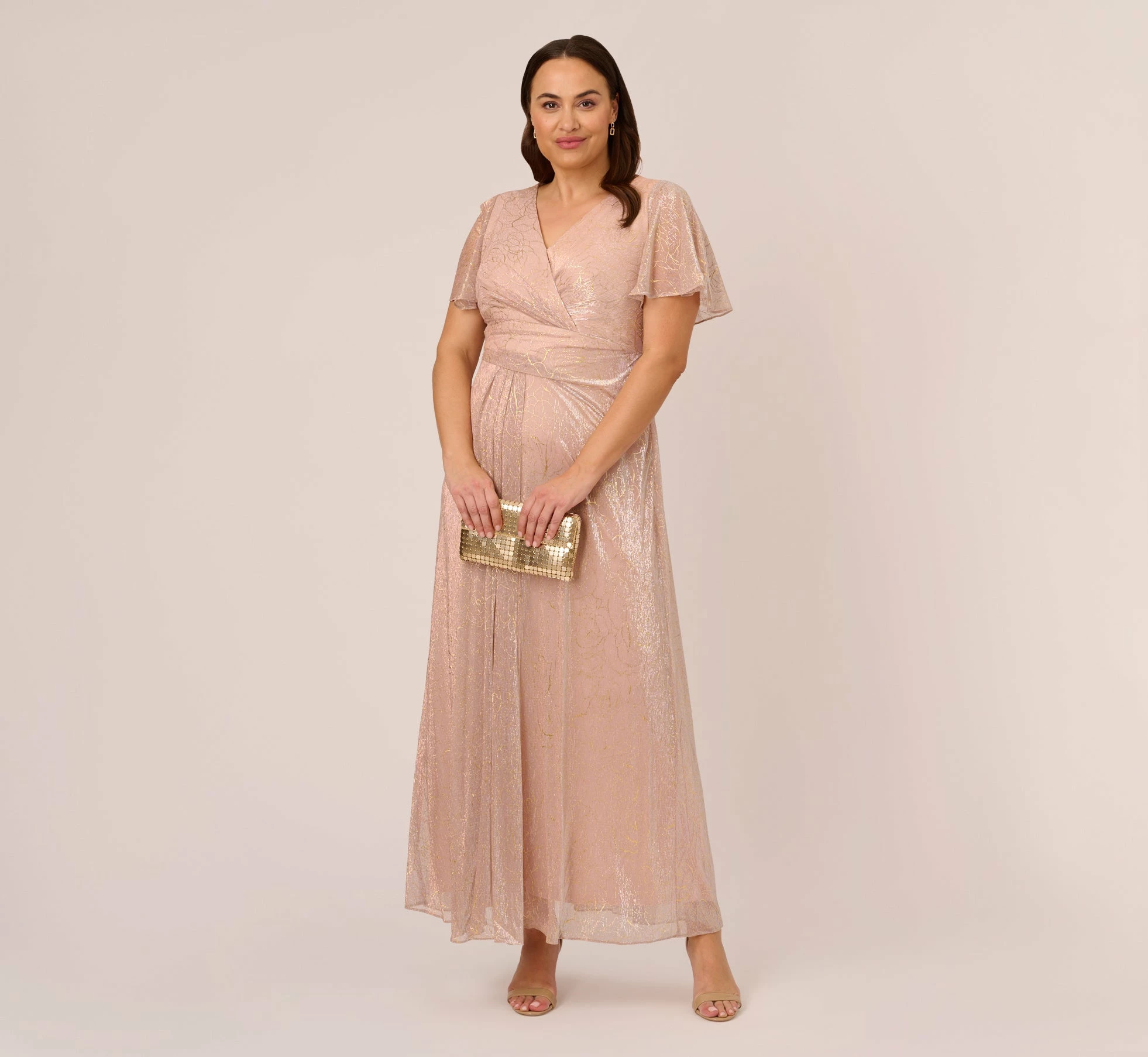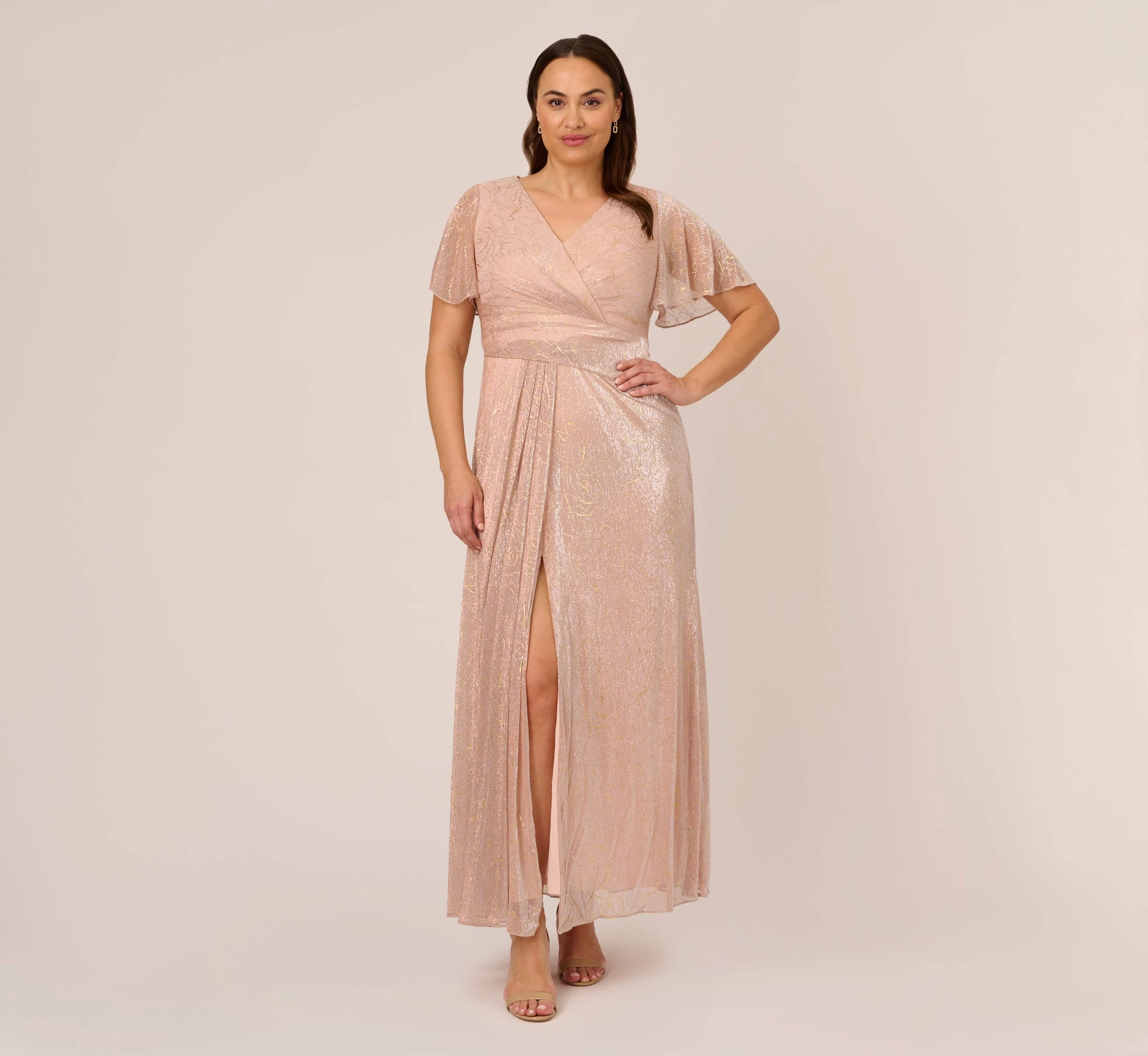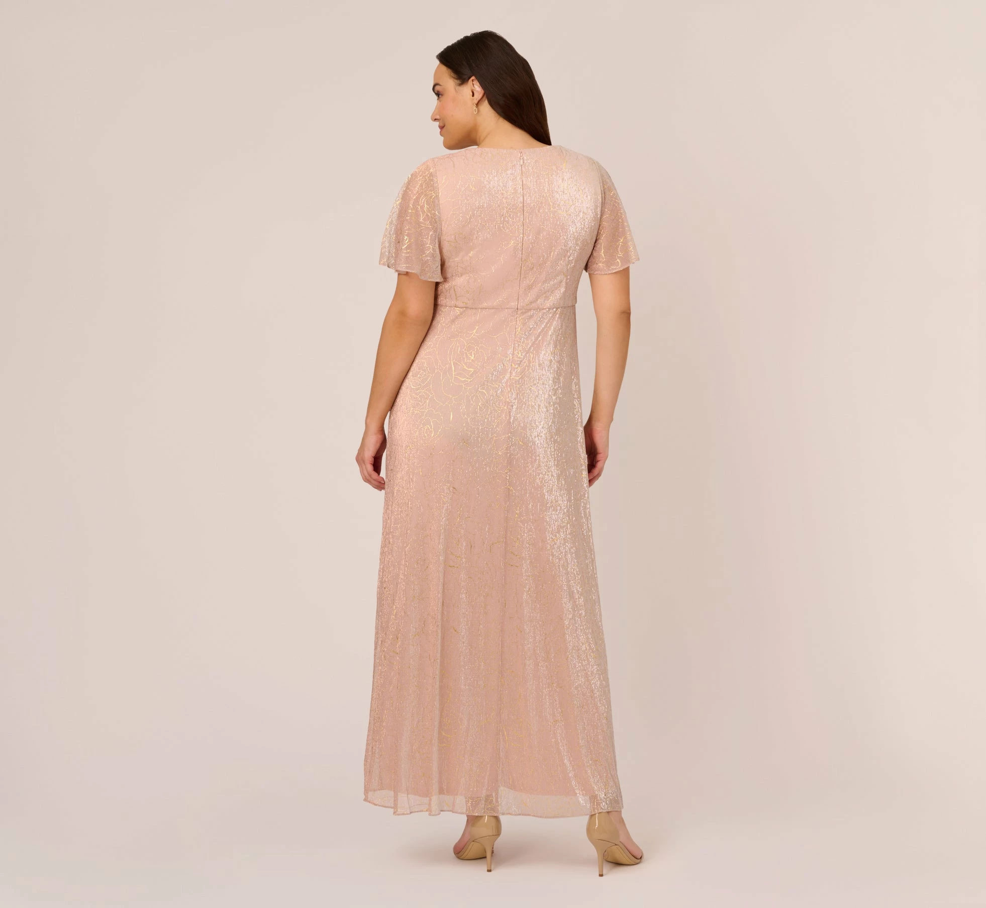 We love the subtle glamour of our draped gown in softly shimmering metallic mesh, designed in an iconic fit-and-flare silhouette, with elegant elbow sleeves and long, draped skirt.