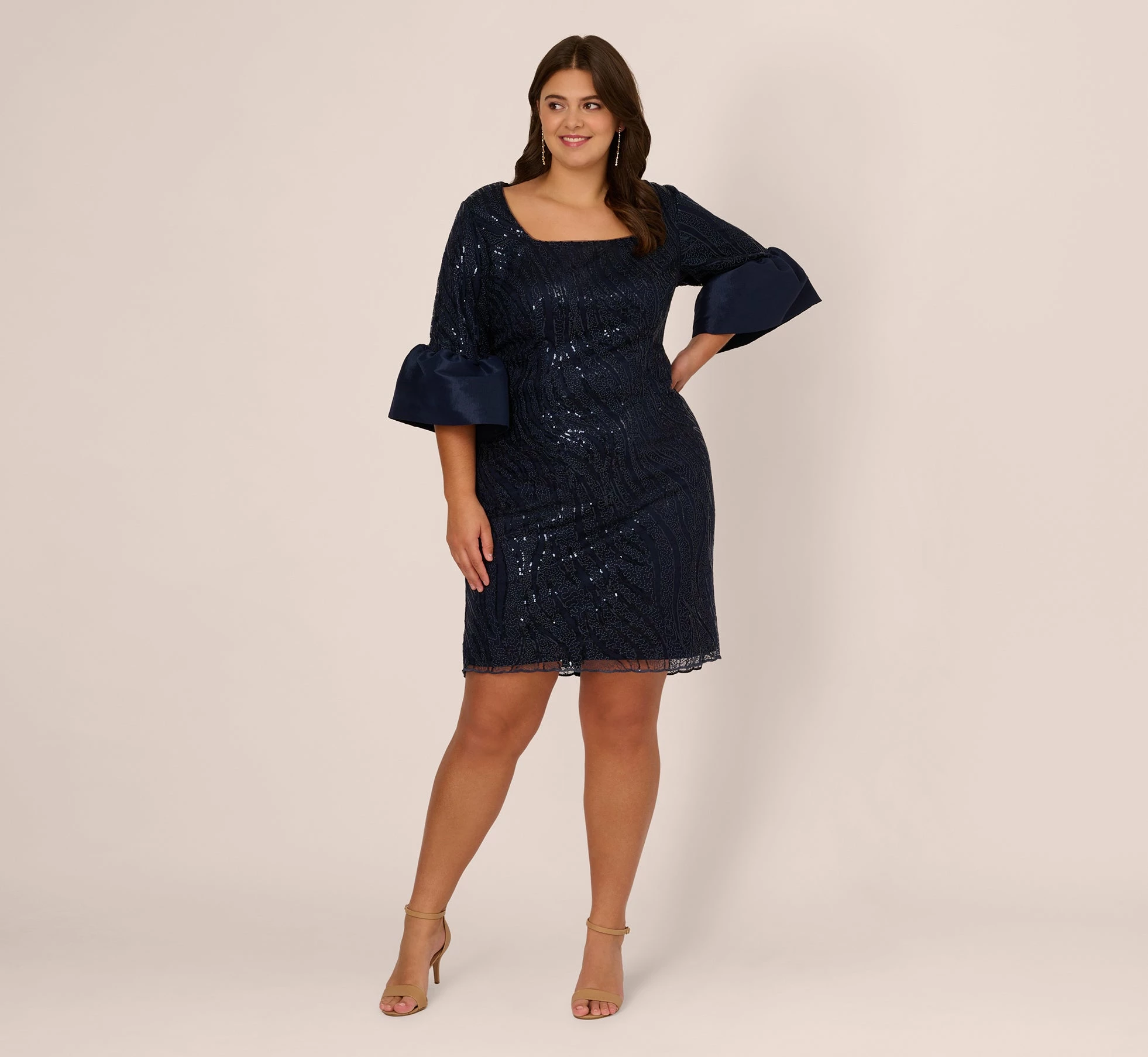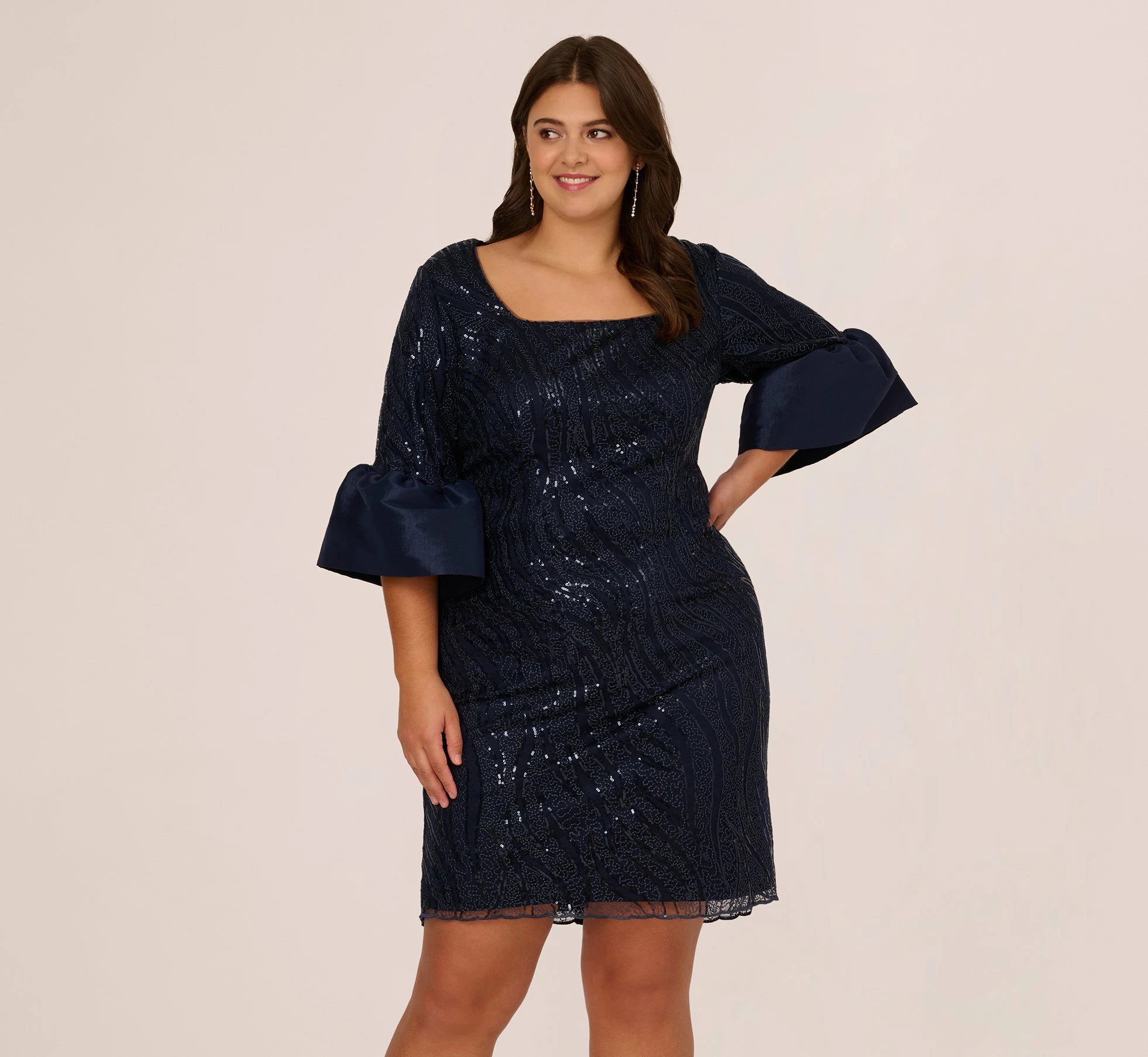 Perfect for cocktail attire and semi-formal events, this sequin dress is a sweet little style. This party dress features a sheath silhouette, square neckline, and three-quarter bell sleeves with taffeta cuffs. A swirl of sequins on elegant lace elevates this sheath dress. A zipper closure atthe center back completes this design. Styled with nude heels and statement earrings, this bell sleeve dress is a memorable look.