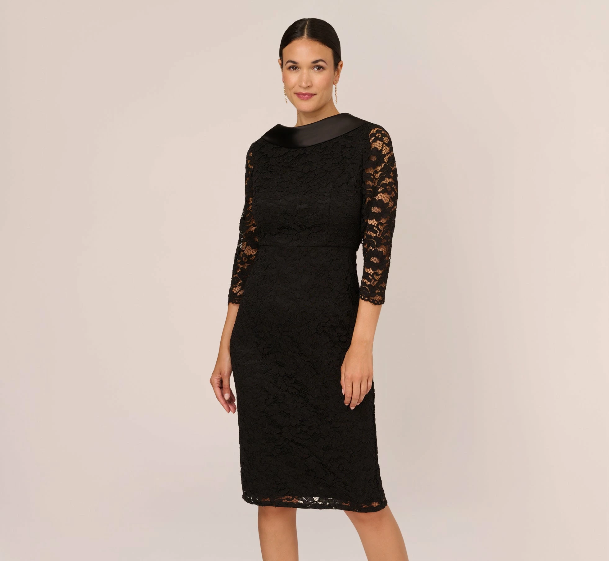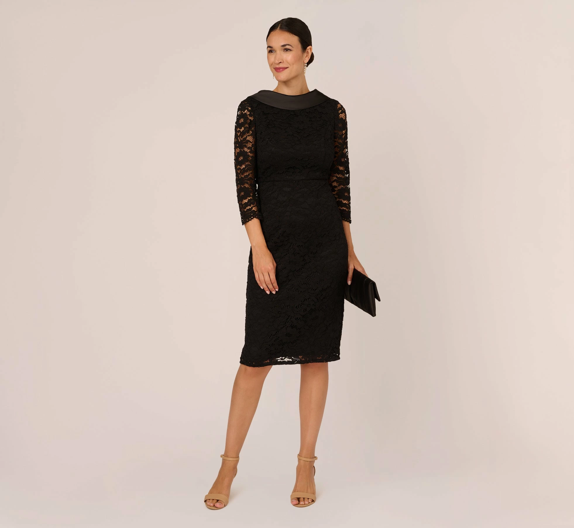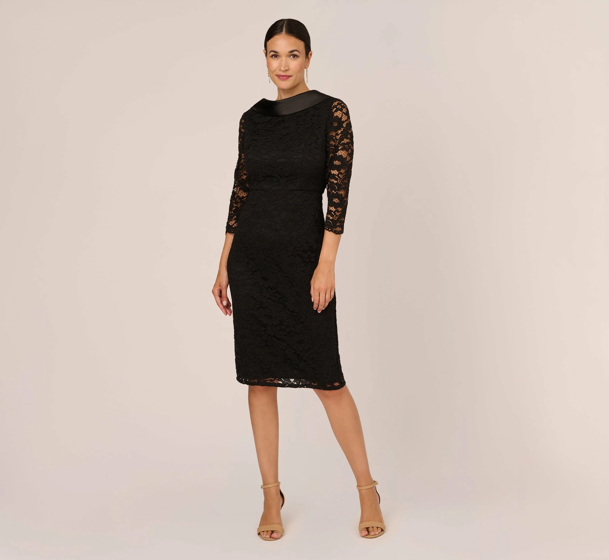 Classic elements make this a lace dress an elegant choice. This sheath dress features a fitted silhouette, satin roll neck collar that flanks the v-back, and sheer elbow-length sleeves with scalloped hems. Crafted from knit lace fabric that is lined through the body, this party dress is apretty cocktail attire or semi formal look. A zipper closure at the center back and a slit at the skirt complete the design. Paired with nude heels and a satin clutch, this lace dress is a timeless look.