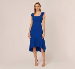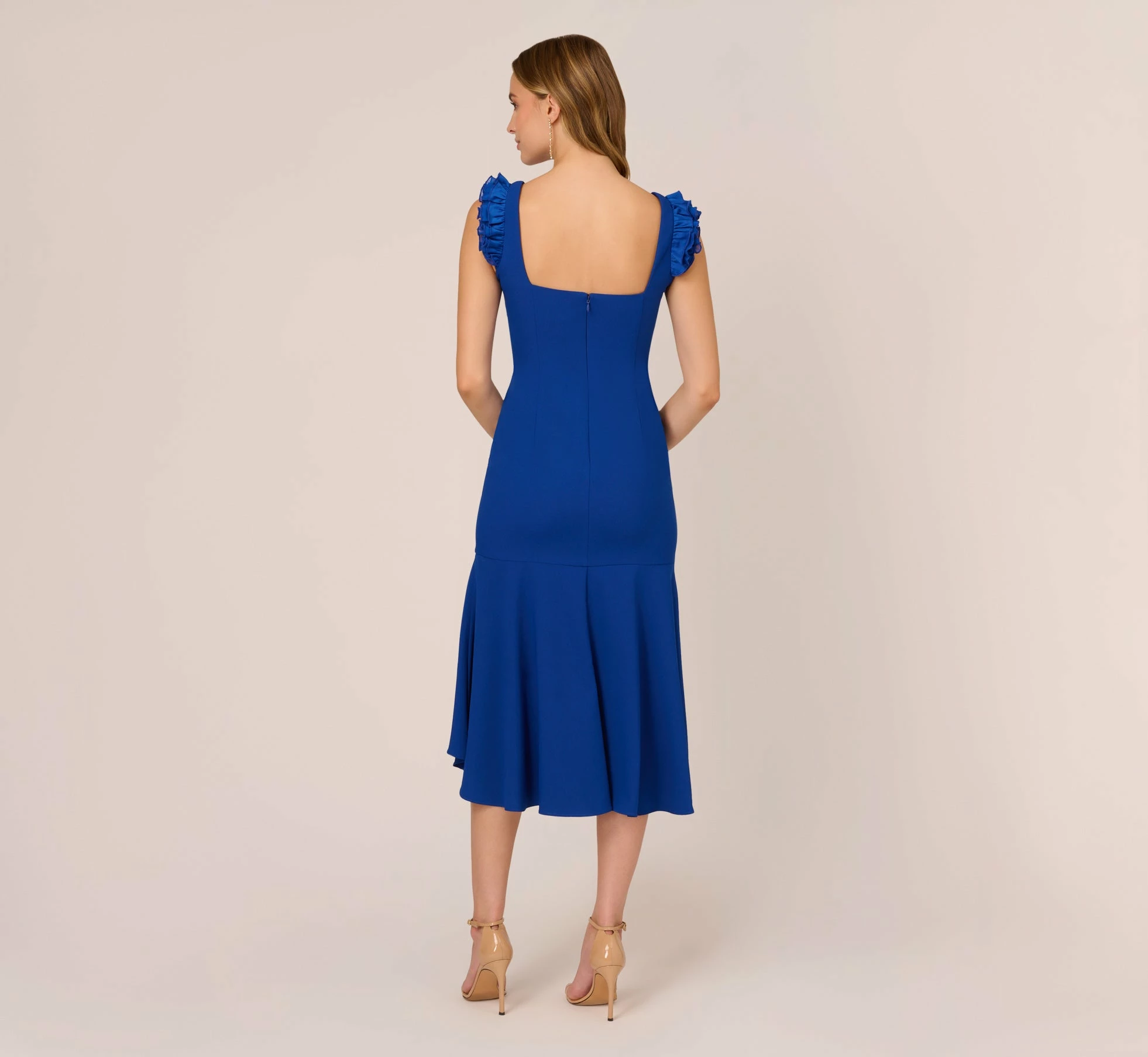 Classic and versatile, our stunning woven satin crepe midi dress is expertly tailored with a playful satin and chiffon ruffled shoulder detail and a high/low mermaid hemline. The square neckline and no waist seam further define this cocktail-style dress. Back zipper with hook and eye closure.