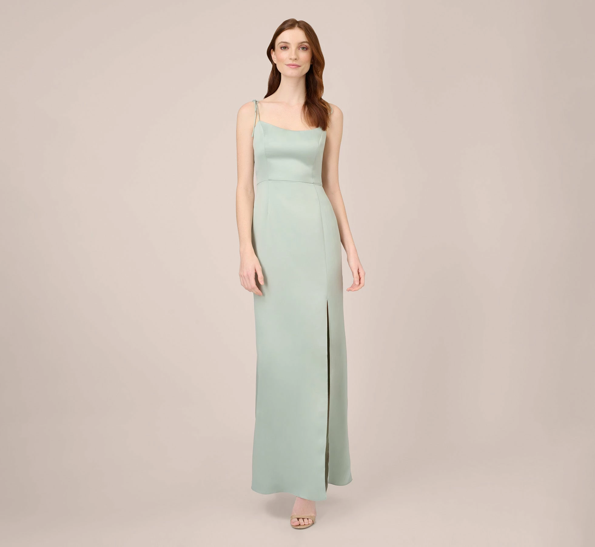 Classic and striking, our long gown is cut from a sumptuous woven satin crepe that gently hugs your figure and then flares out to a graceful mermaid hem. We love adjustable spaghetti straps that tie for a perfect fit. Finished with a deep side slit opening for ease of movement. Sleek back zip closure. A timeless gown that’s a must-have addition to your special occasion wardrobe.