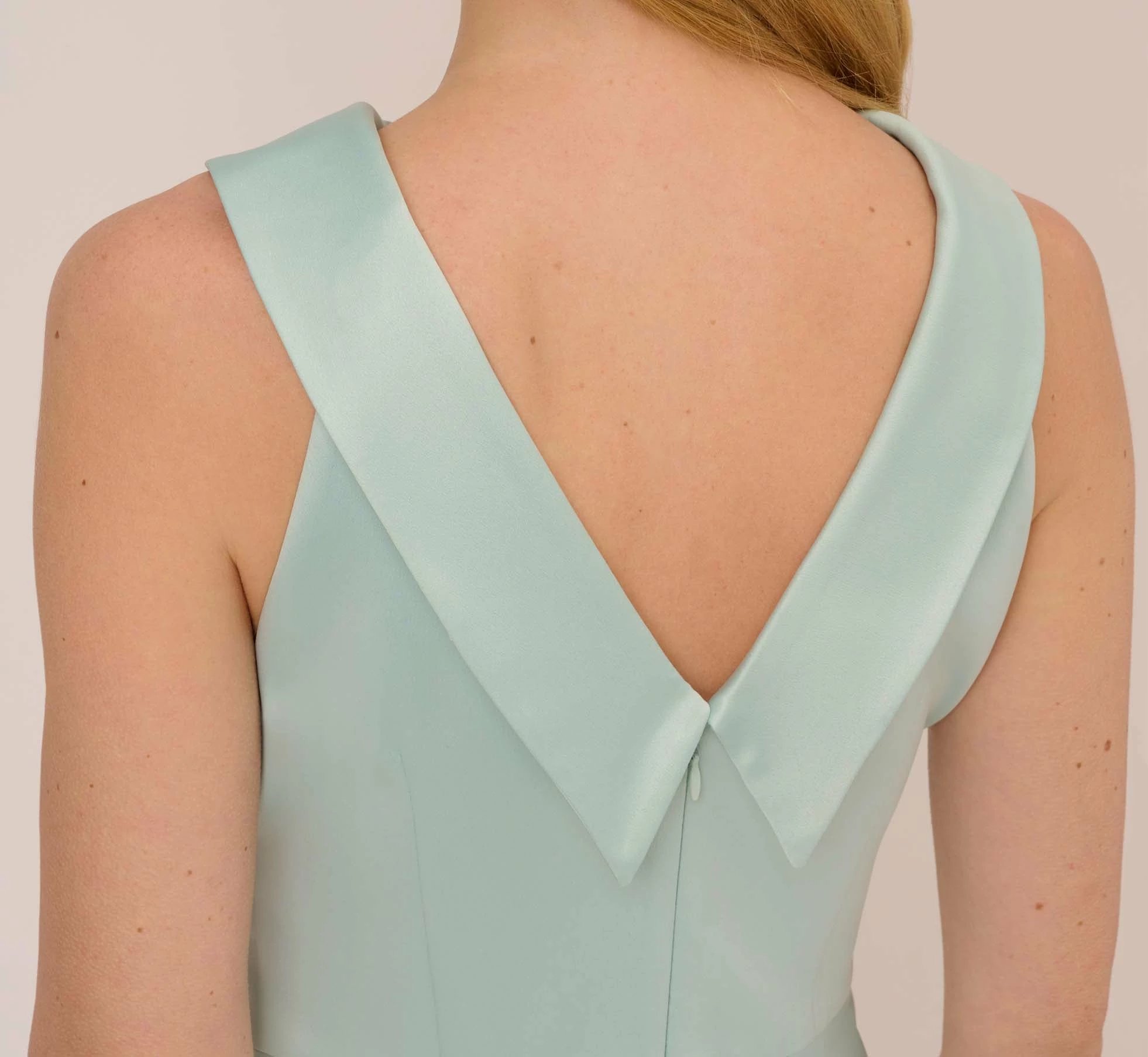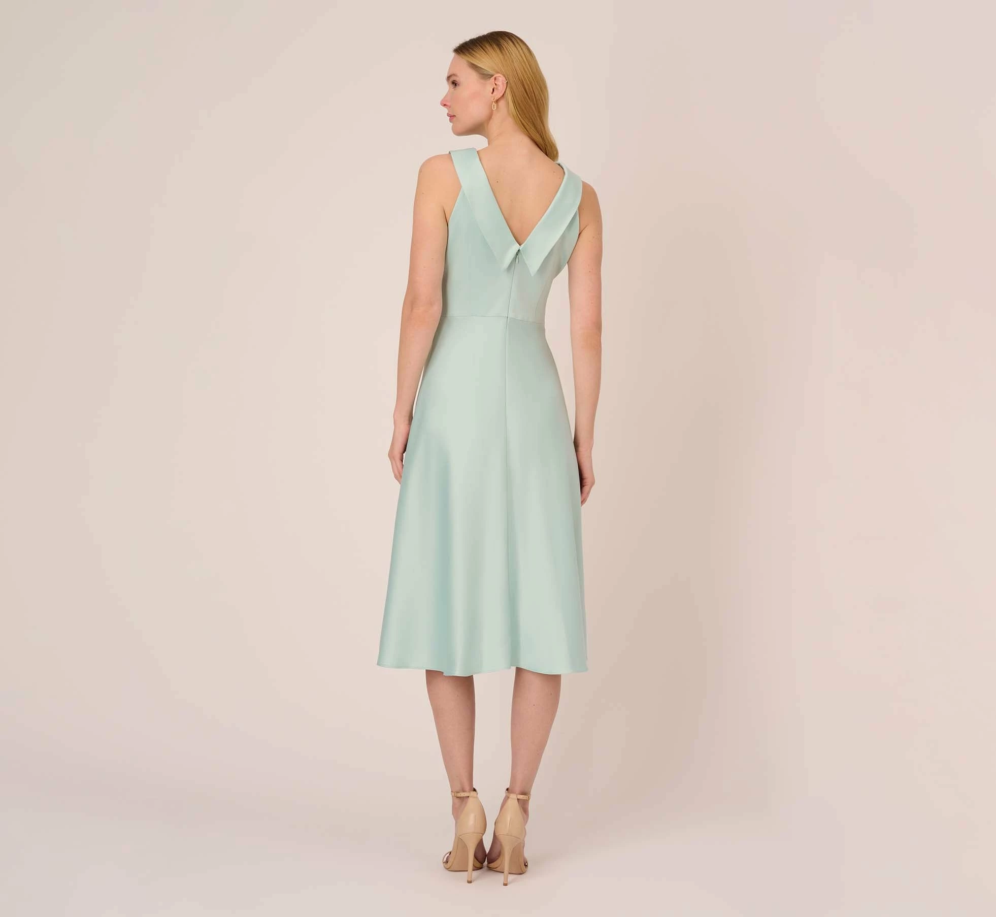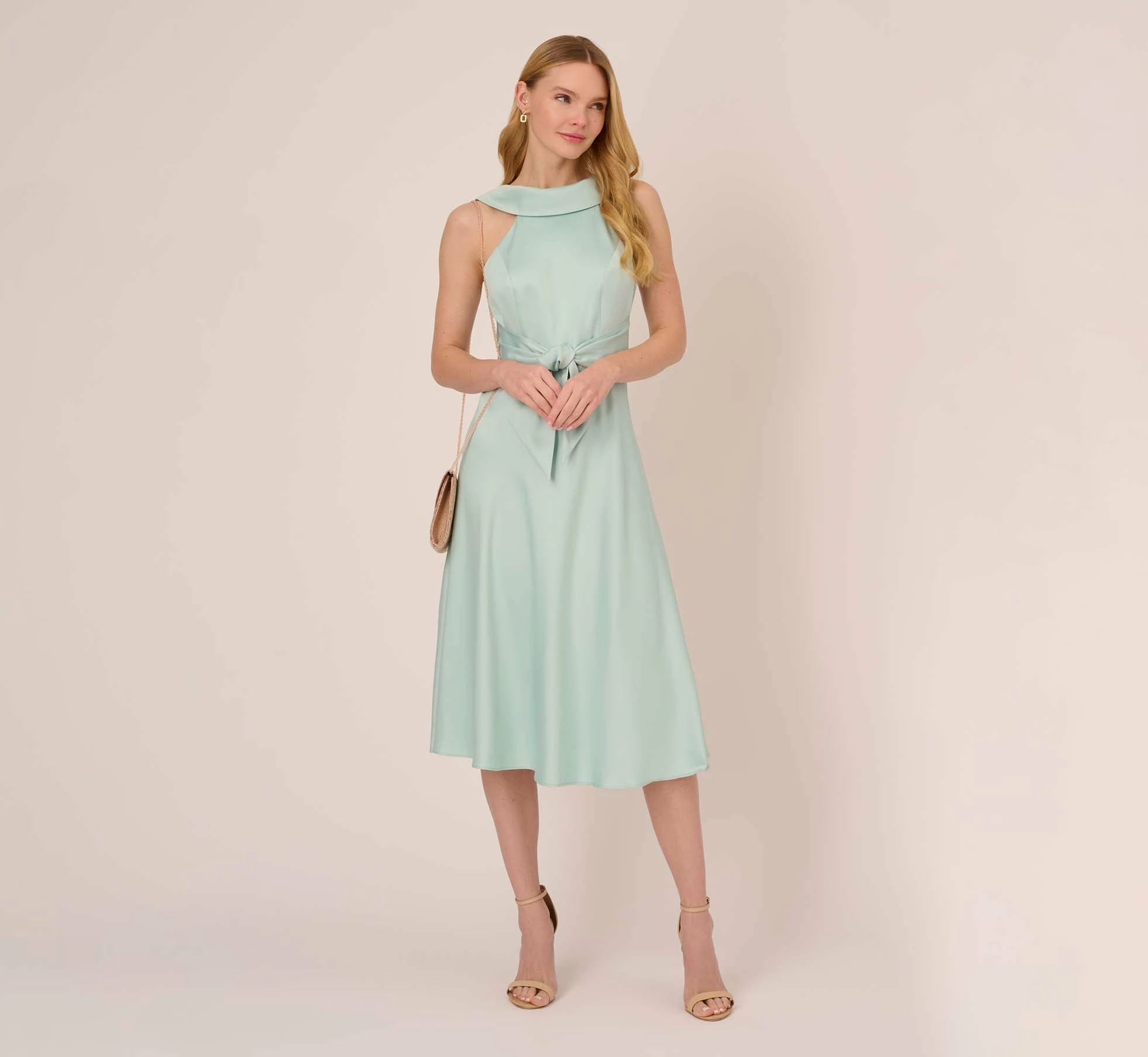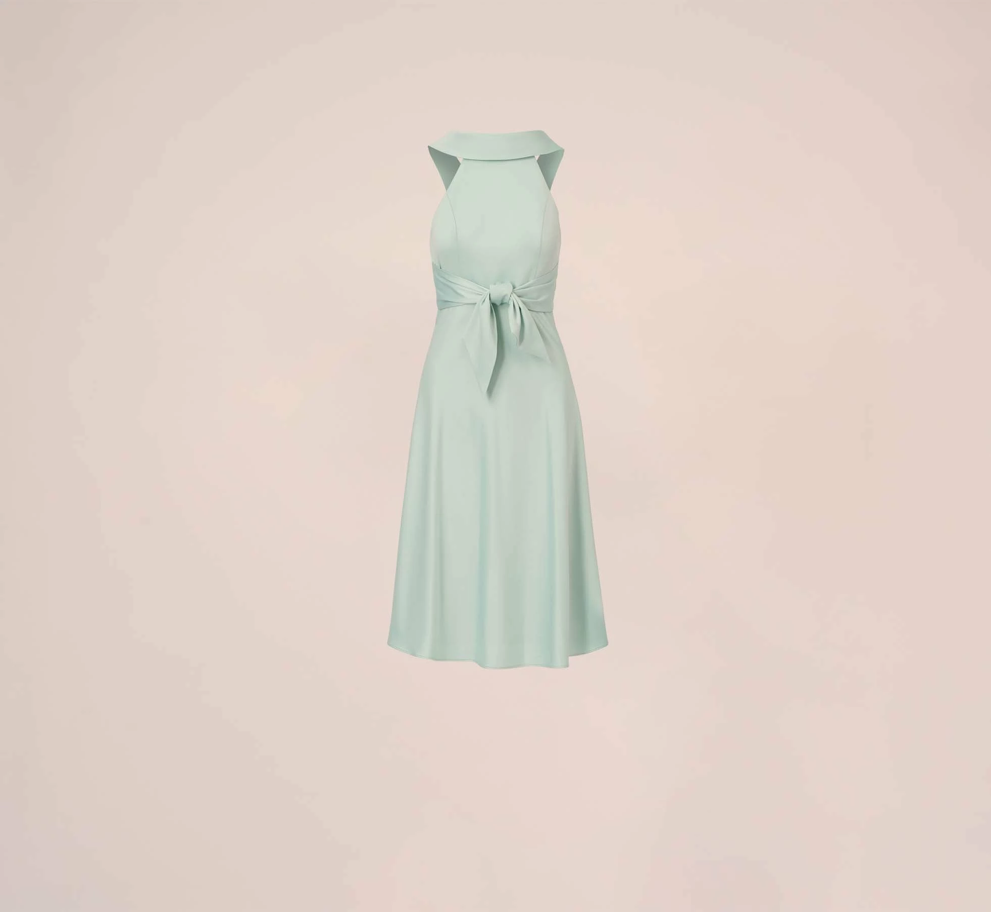 Lustrous and lightweight woven satin crepe shapes this stunning fit-and-flare sleeveless dress featuring a halter neckline with a rolled collar and v-back. Featuring a front tie waist to accentuate your figure. Midi skirt is cut on the bias and has beautiful sway and movement. Back zipper with hook and eye closure. Feel like the queen of the room at brunch, baby/bridal showers and wedding receptions.