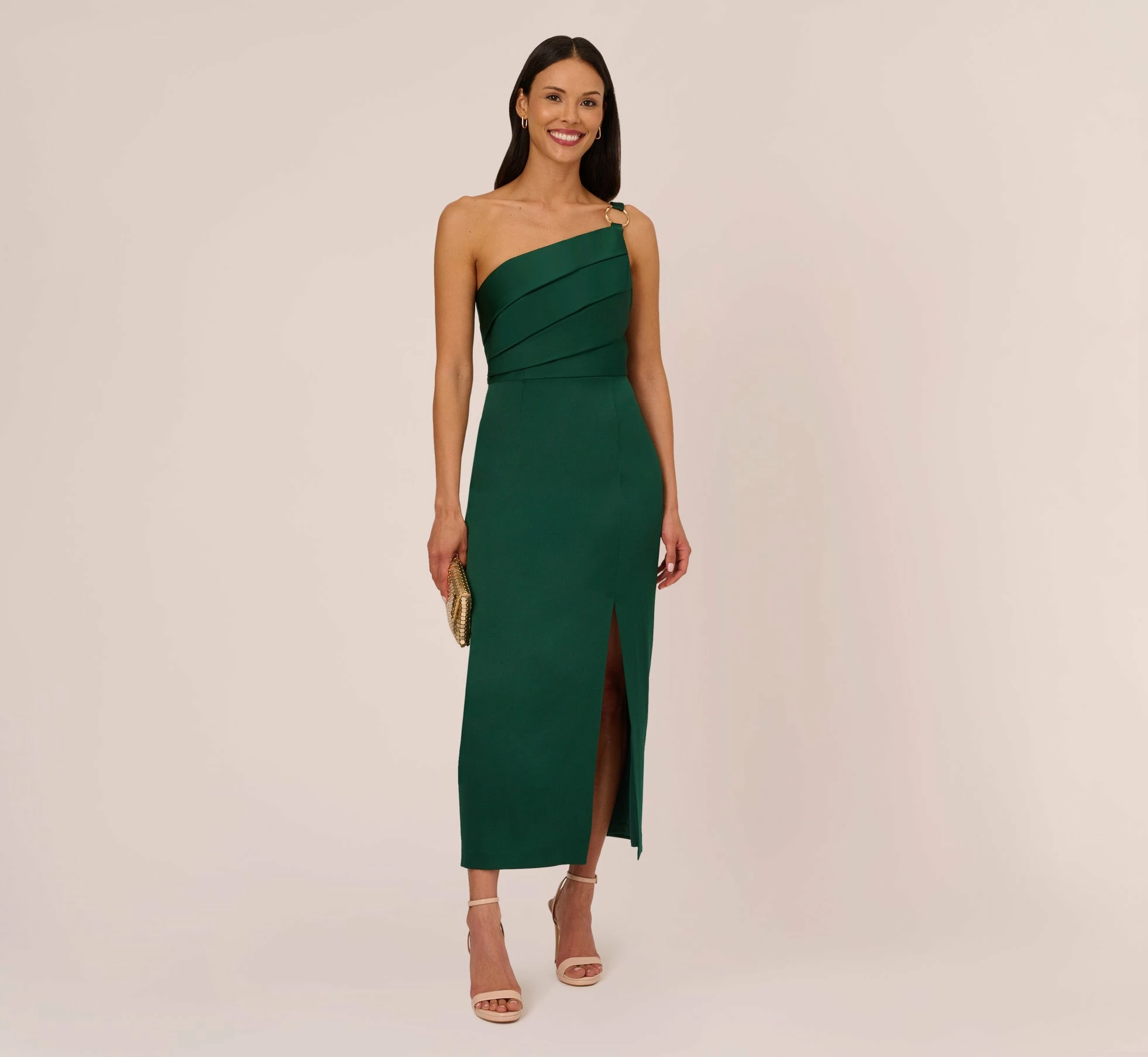 Embrace your inner Grecian goddess in this satin one shoulder gown. This formal dress features a pleated bodice with one-shoulder neckline accented by a twisted metallic ring, a draped back strap, and a slim column skirt. Crafted from shining satin crepe, this evening gown is perfect for a formal or black-tie event. A zipper closure at the center back completes this one shoulder gown. Team this satin crepe gown with metallic heels and a sequin clutch to polish off the look.