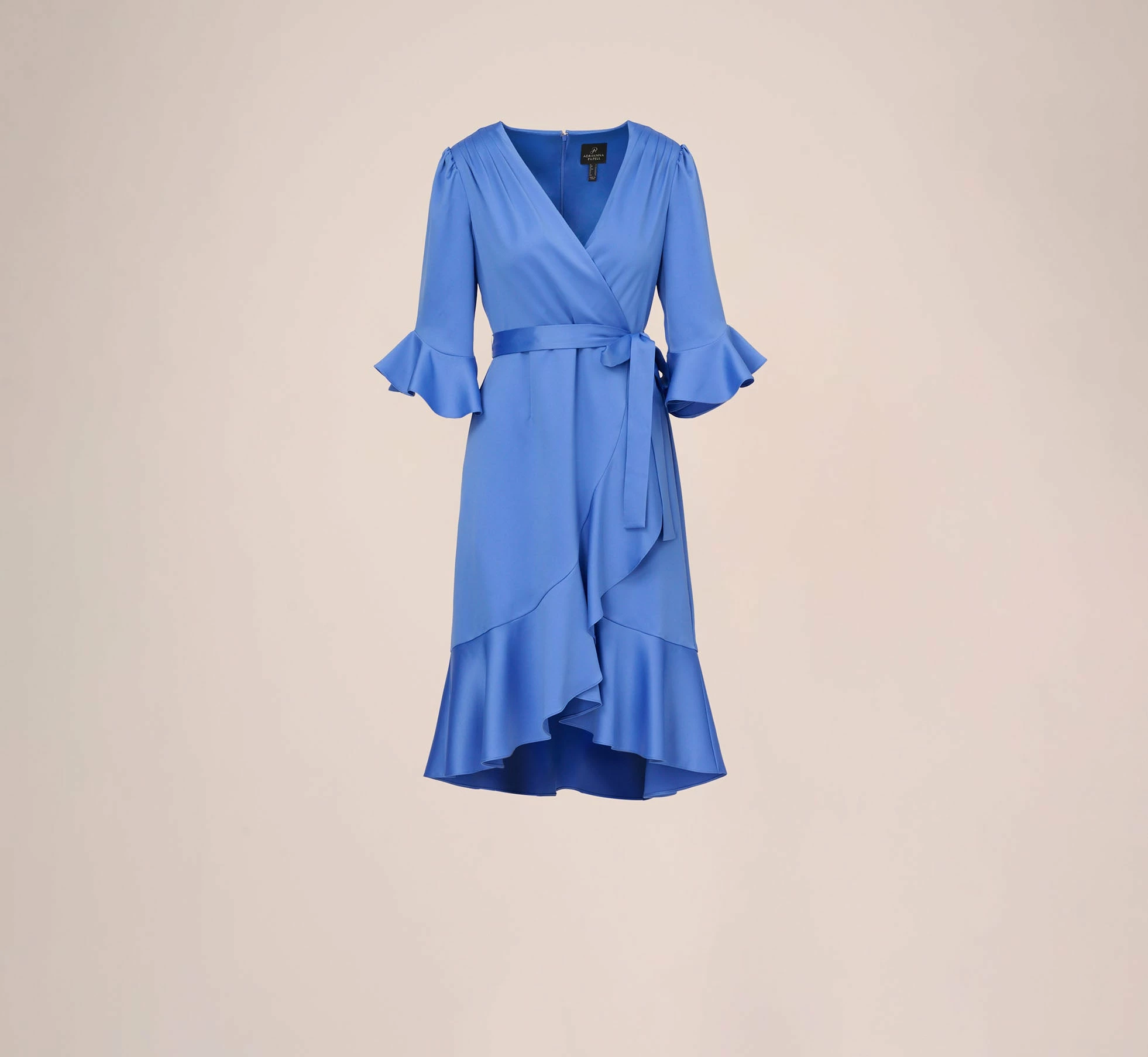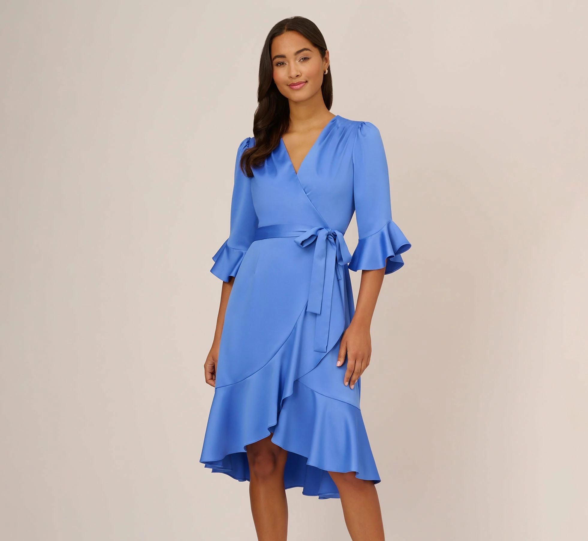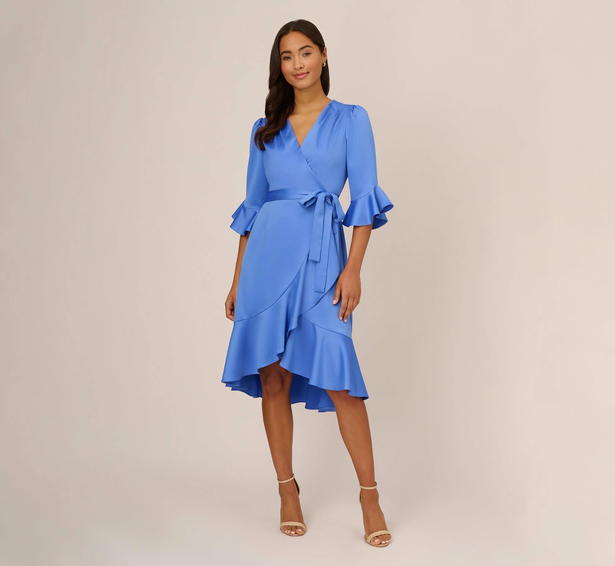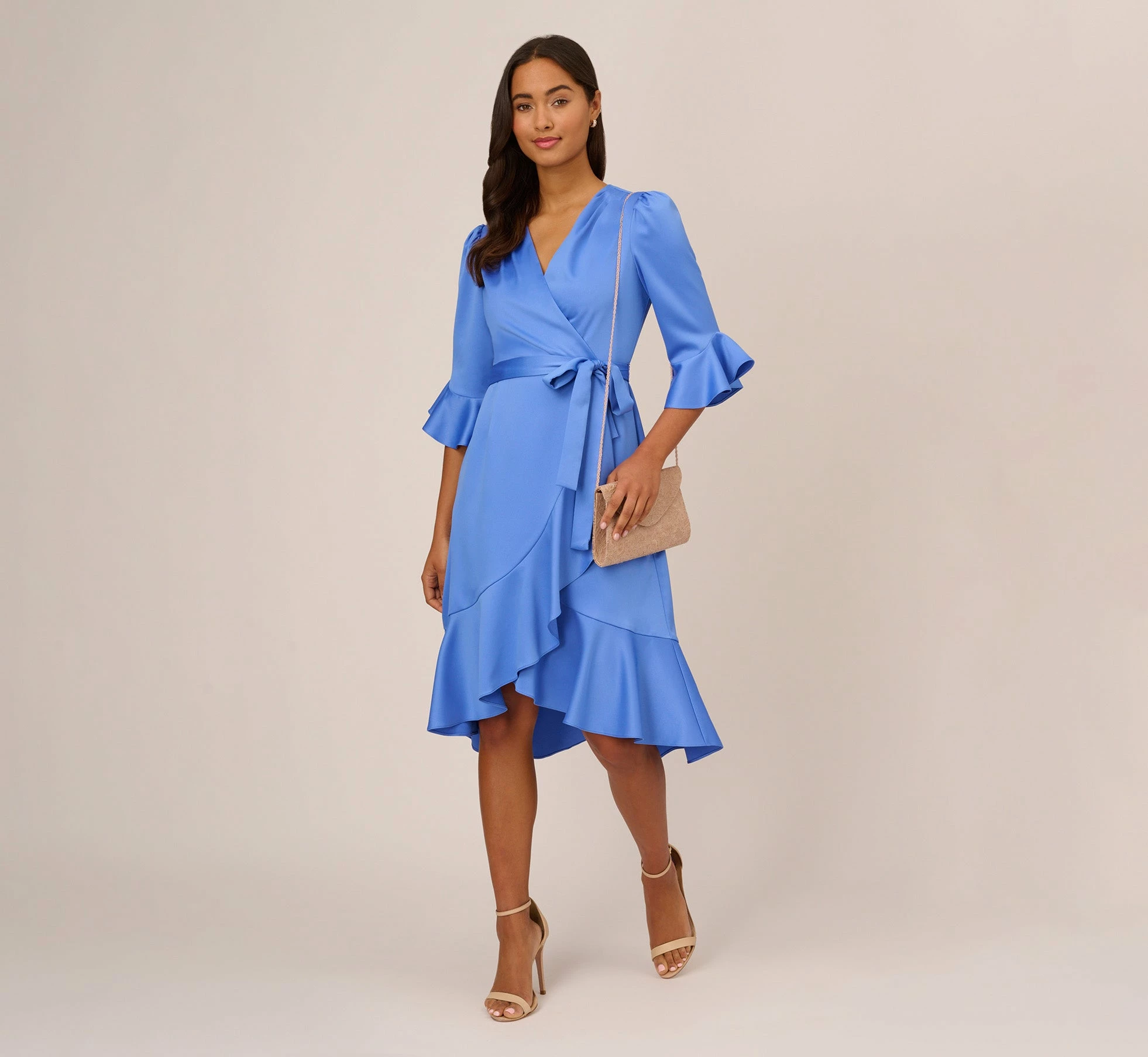 A modern take on a classic design, this faux wrap dress is a chic look. This day dress features a surplice neckline, pleats at the shoulders, and three-quarter length sleeves with ruffled hems. Cascaded ruffle details adorn the hem of the faux-wrap skirt. Designed with a lightweight satincrepe, this dress has a slight shine. Add a nude heel for a look that will be a perfect fit from day to night.