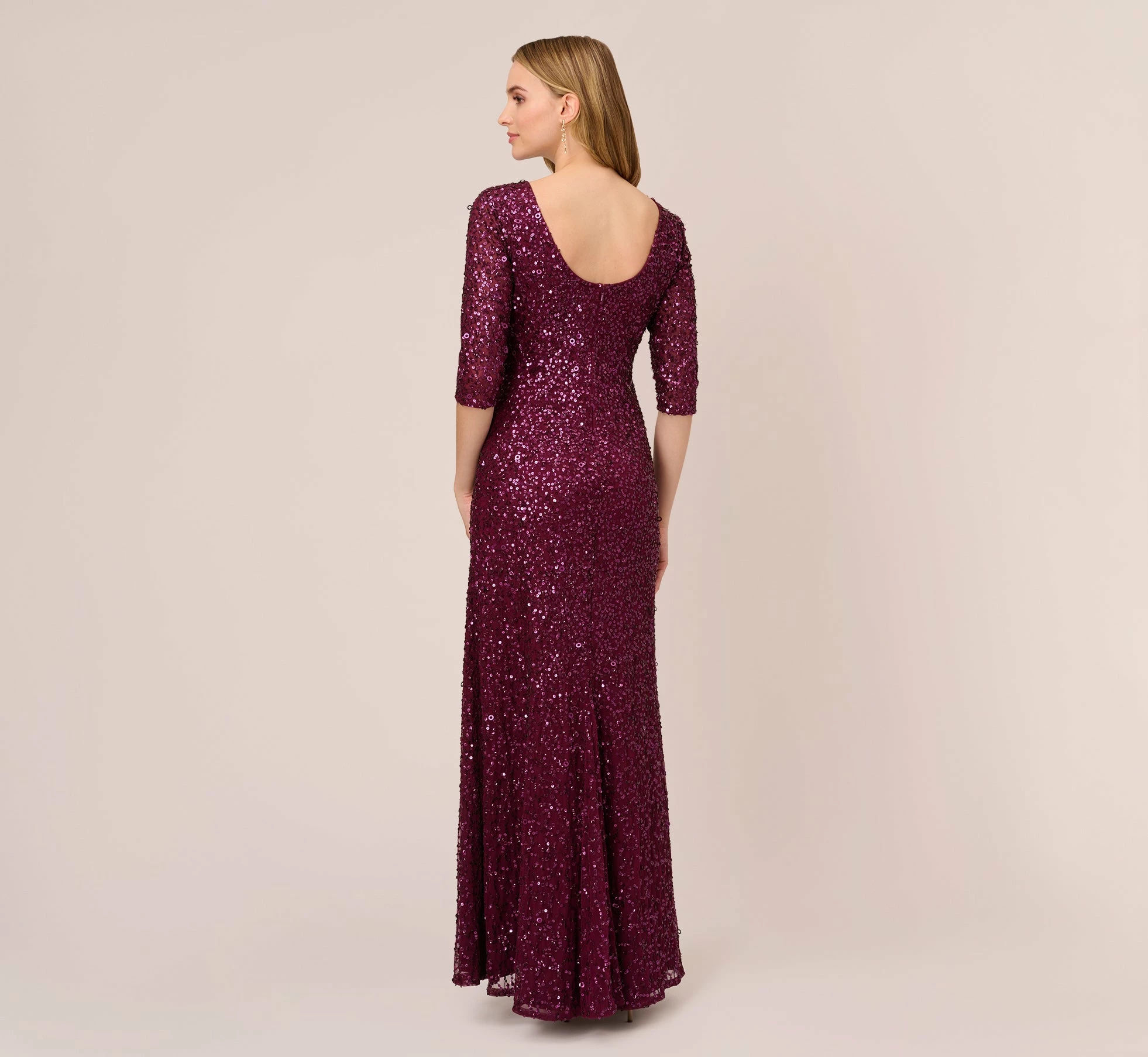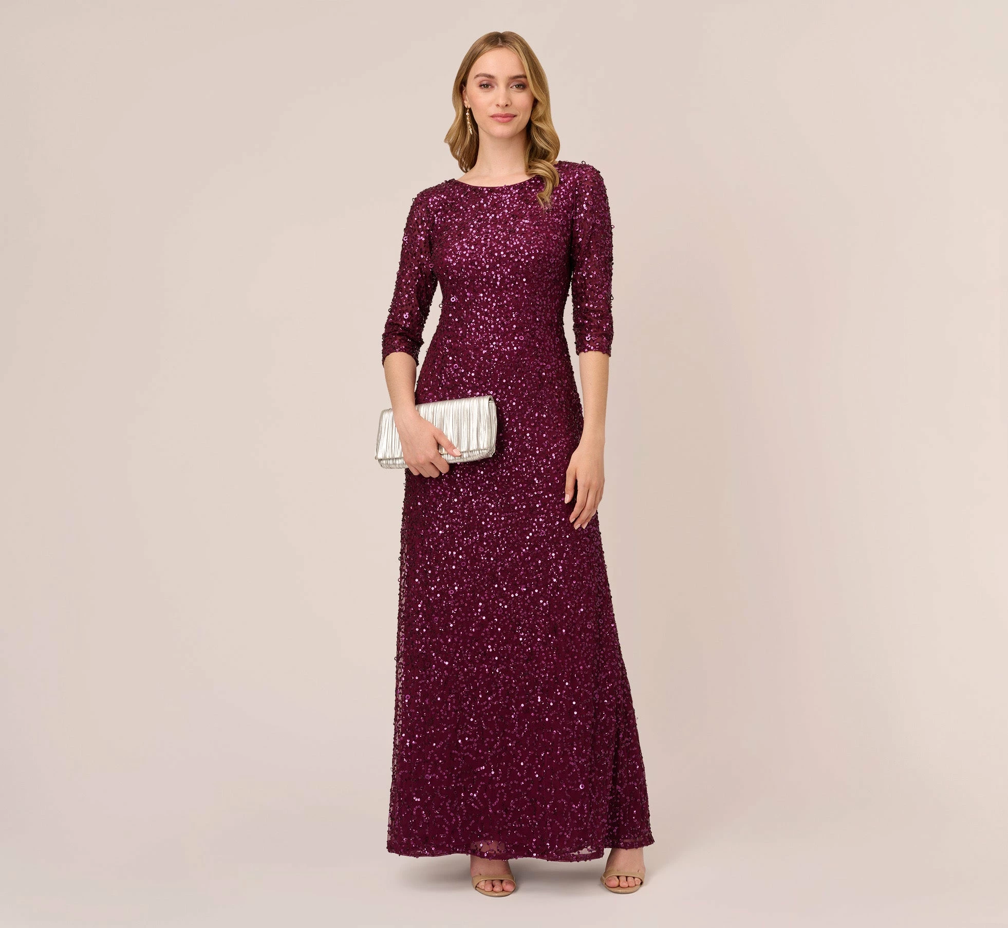 Rows upon rows of glittering sequins adorn this beautiful three-quarter sleeve gown, cast in an elegant silhouette.This Adrianna Papell design has been made from the finest and most luxurious fabrics. All bead work, embroidery and ornamentation has been done completely by hand. Slight irregularities or variations should not be regarded as defective or damaged, rather a testament to the garment’s unique beauty.