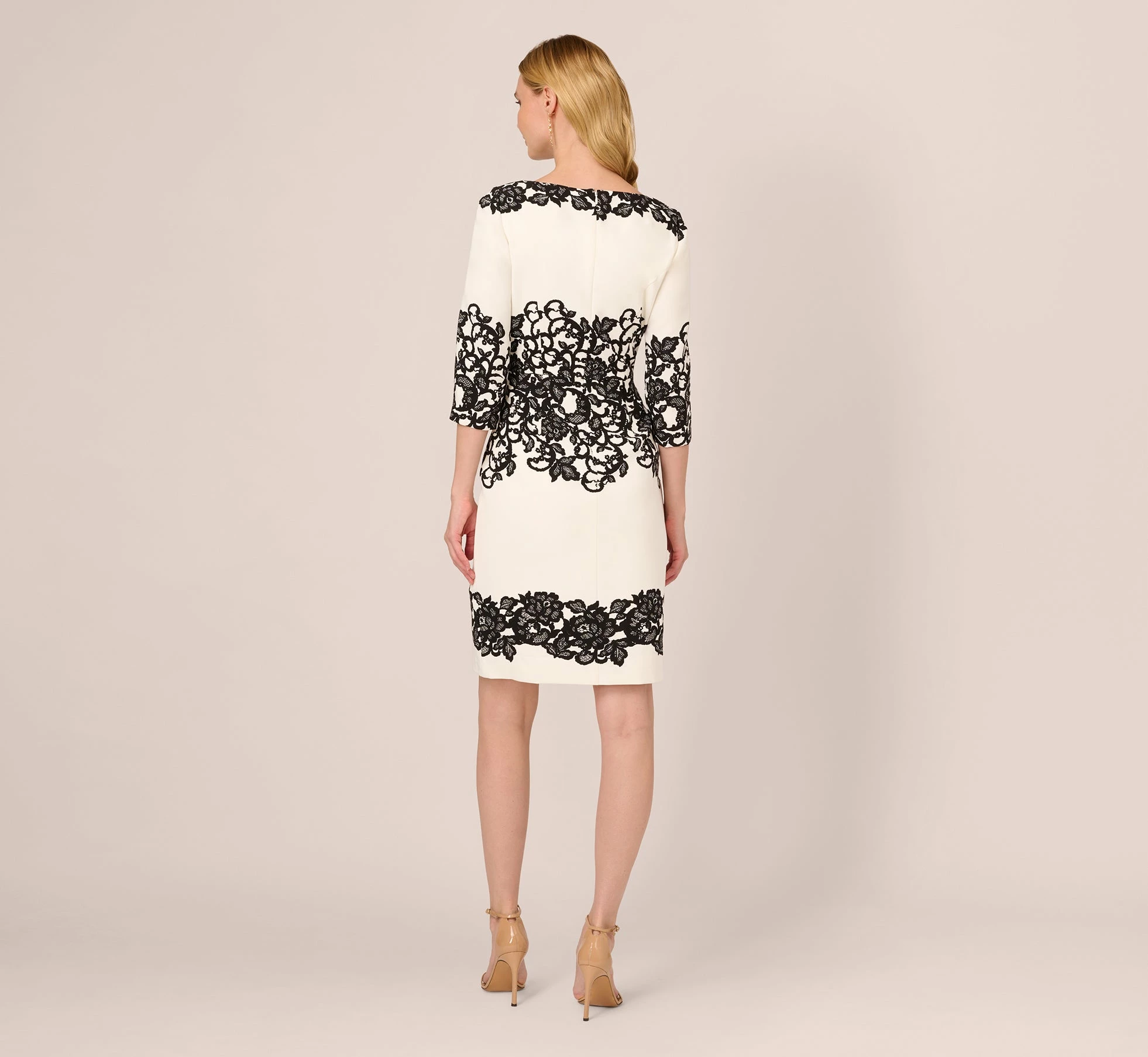 Modern yet timeless, this scroll lace dress is a beautiful look. This sheath dress features a boat neckline, three-quarter sleeves, no waist seam, and a fitted silhouette. Designed with a novelty stretch fabric adorned with scroll lace placed to accentuate the figure, this wear-to-work dress isa classic look. A zipper closure at the center back completes this three-quarter sleeve dress. Paired with neutral heels, this lace-trimmed dress is ideal for baby showers or work conferences.