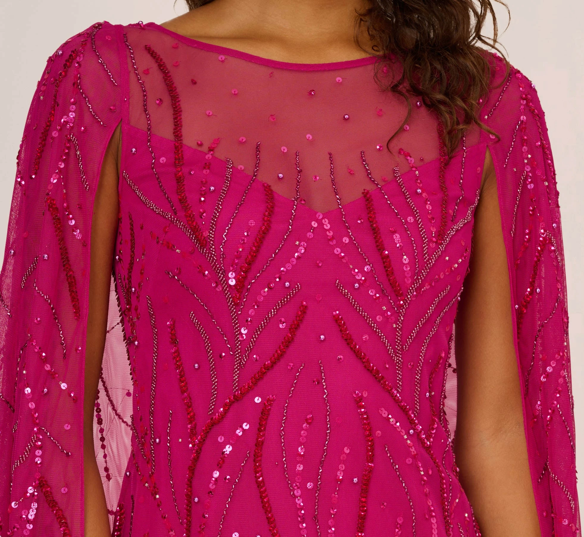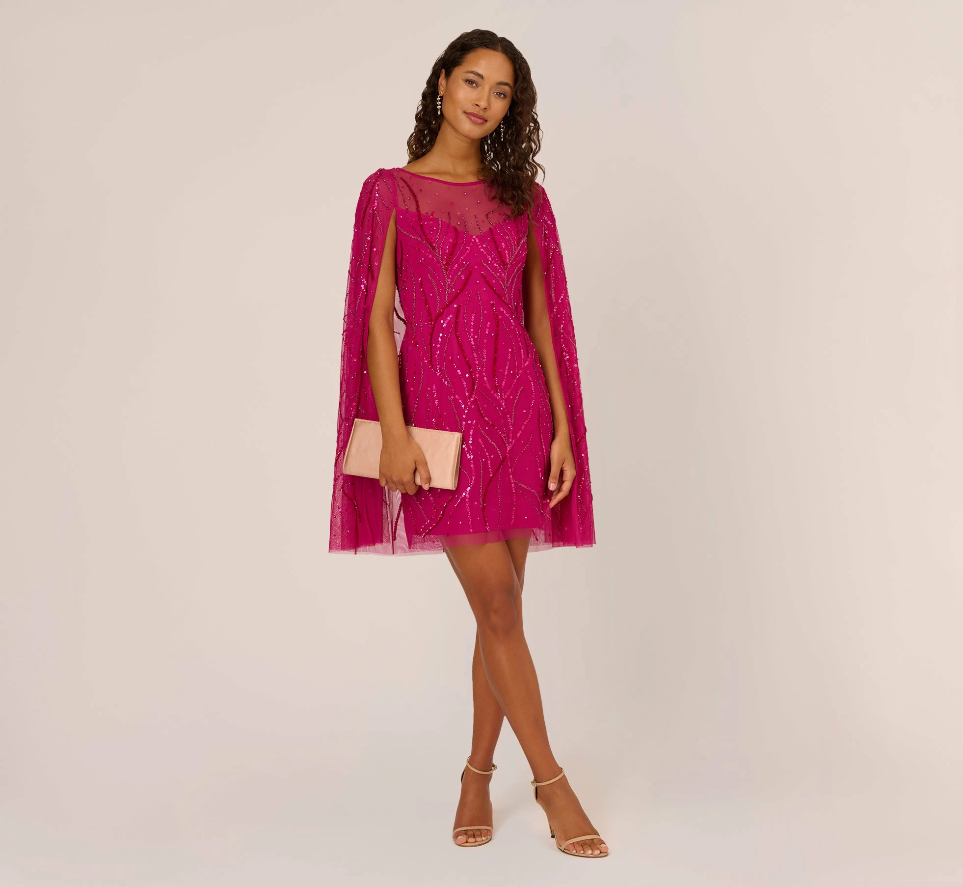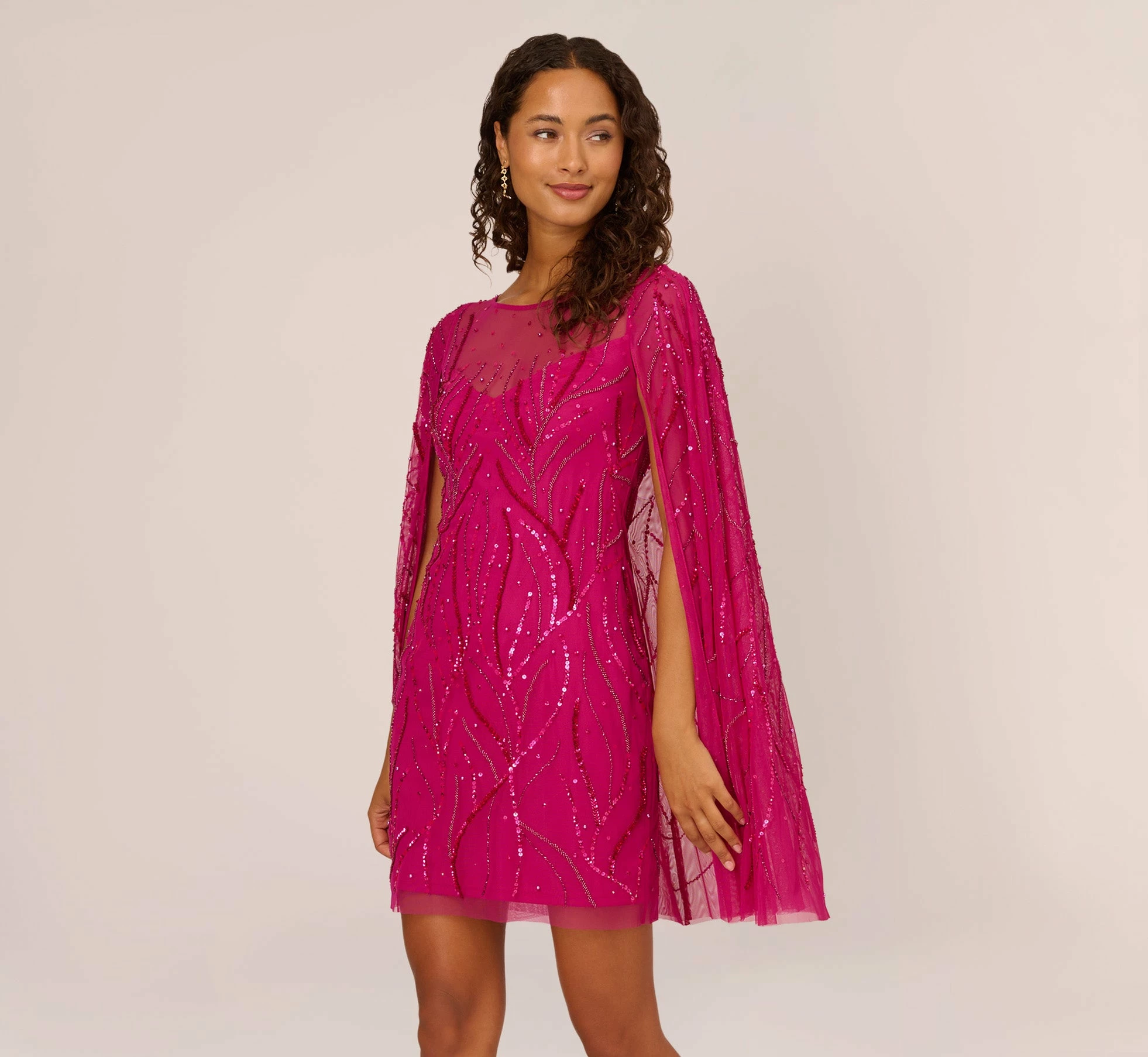 Adrianna Papell Sequin Beaded Cape Dress With Illusion Neckline In Hot Orchid