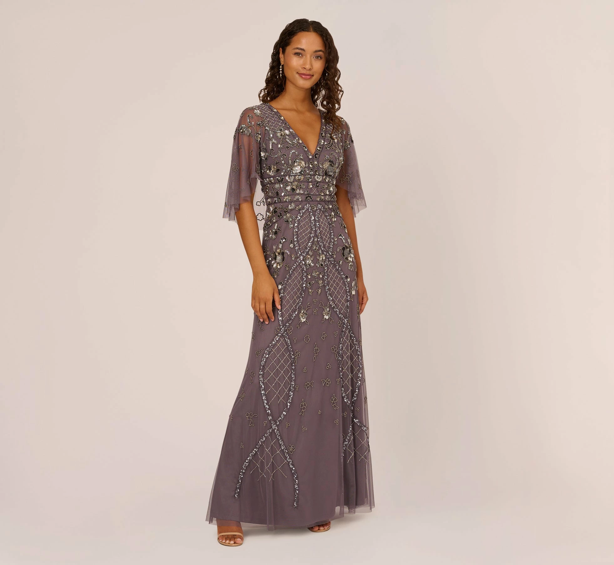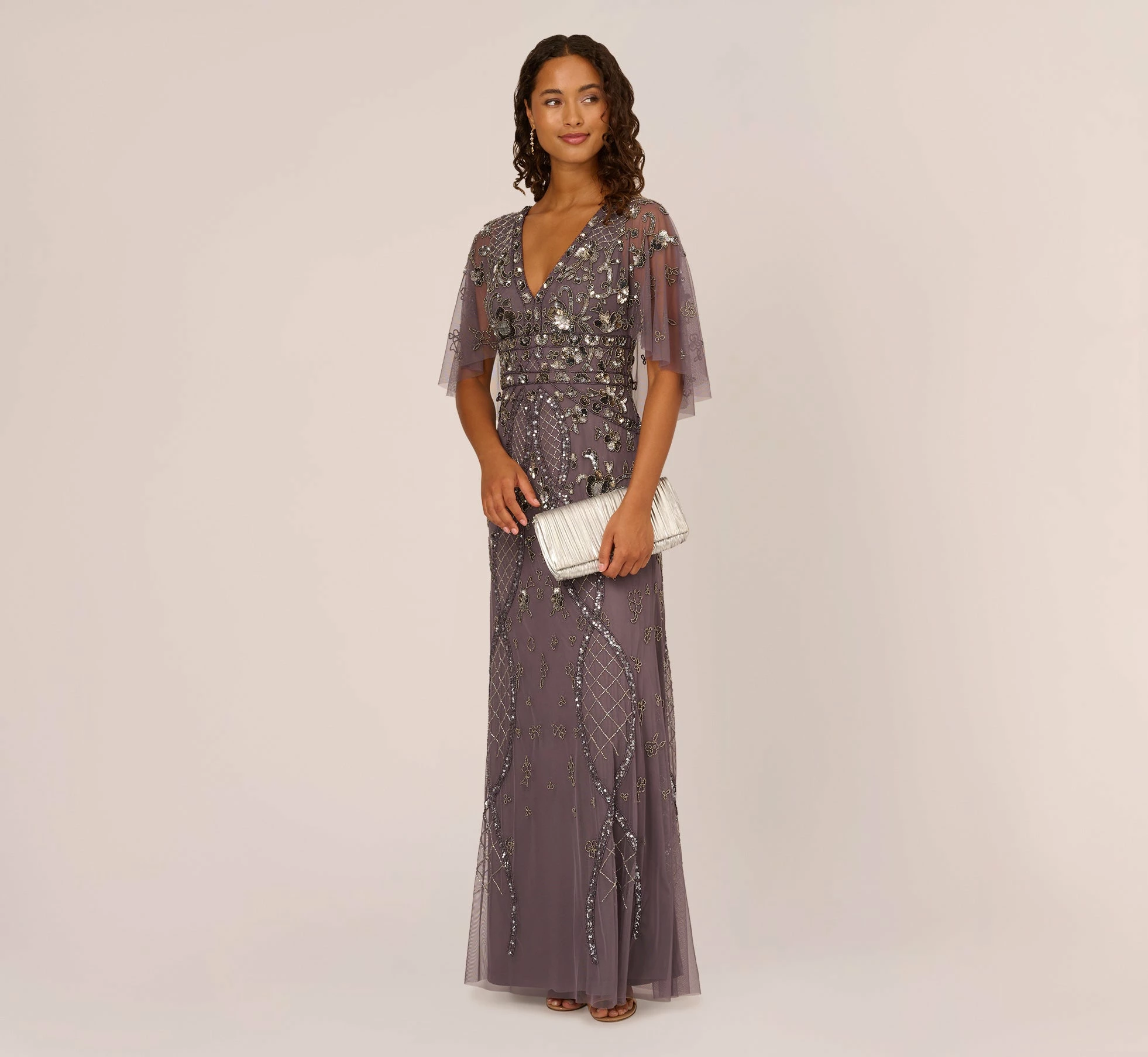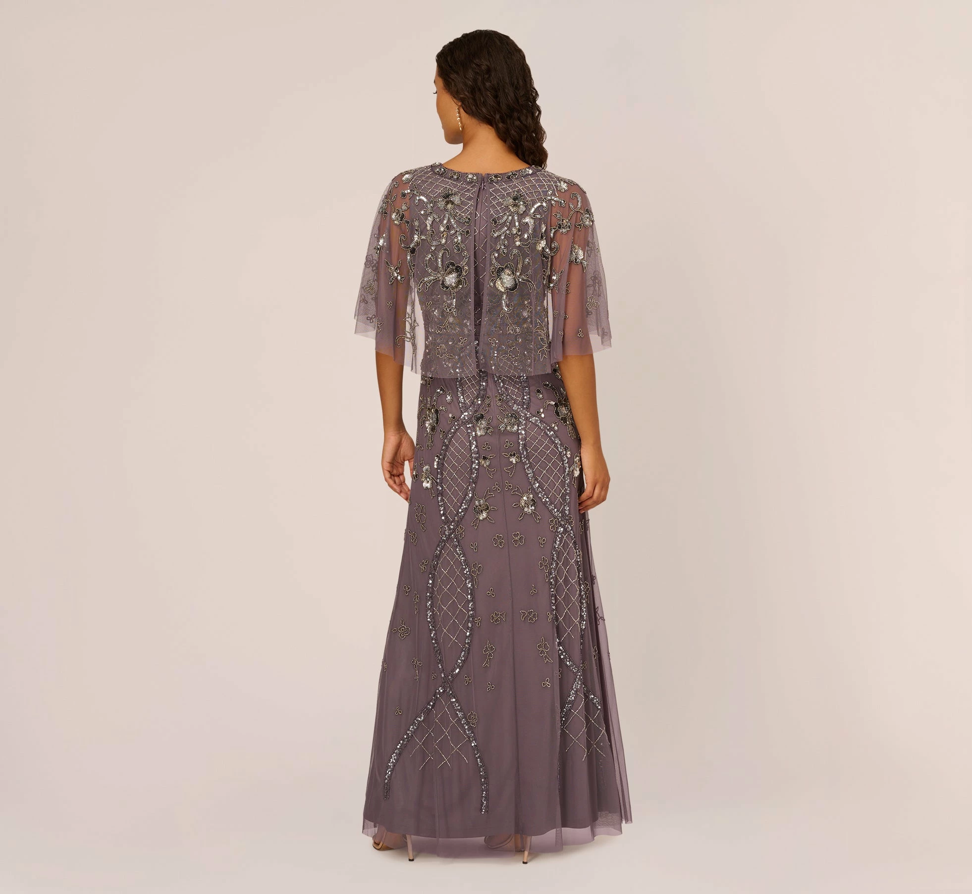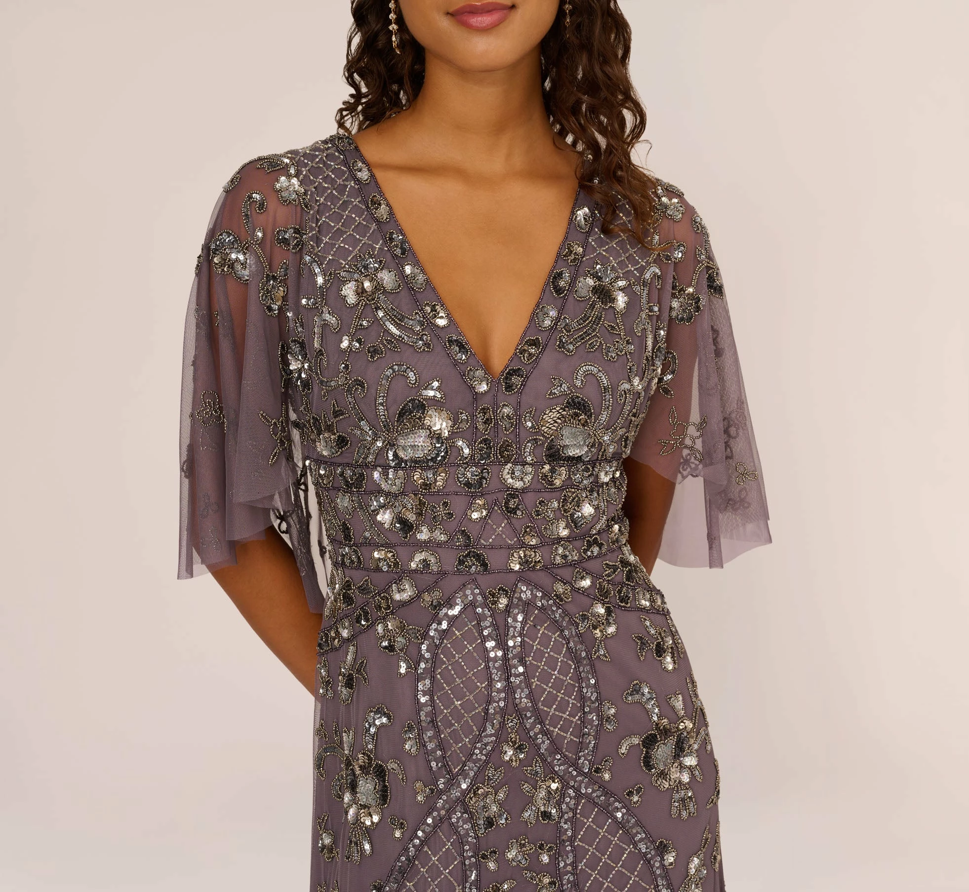 Romantic beading elevates this evening gown. This formal dress features a deep v-neckline, fitted bodice, and sheer cape sleeves. Lined through the body, this dress has a mesh overlay covered in an array of sequin beaded designs, including 3D florals, that accentuate the figureand add drama. A zipper closure at the center back completes this cape dress.