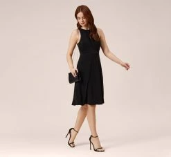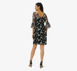 Sweet embroidered details on a timeless silhouette brings this sleeveless dress front and center. This cocktail dress features a crew neckline, extended shoulder sleeves, and a sheer neck and back that gives a strapless illusion. Partially lined, this sheath dress has a knit mesh overlay that has been embroidered with sequins and flowers by hand. A cutaway skirt hem is a unique touch and a zipper back closure completes the design. Styled with your favorite neutral heels and statement earrings, this floral dress is ready for elevated business dinners and cocktail attire events.