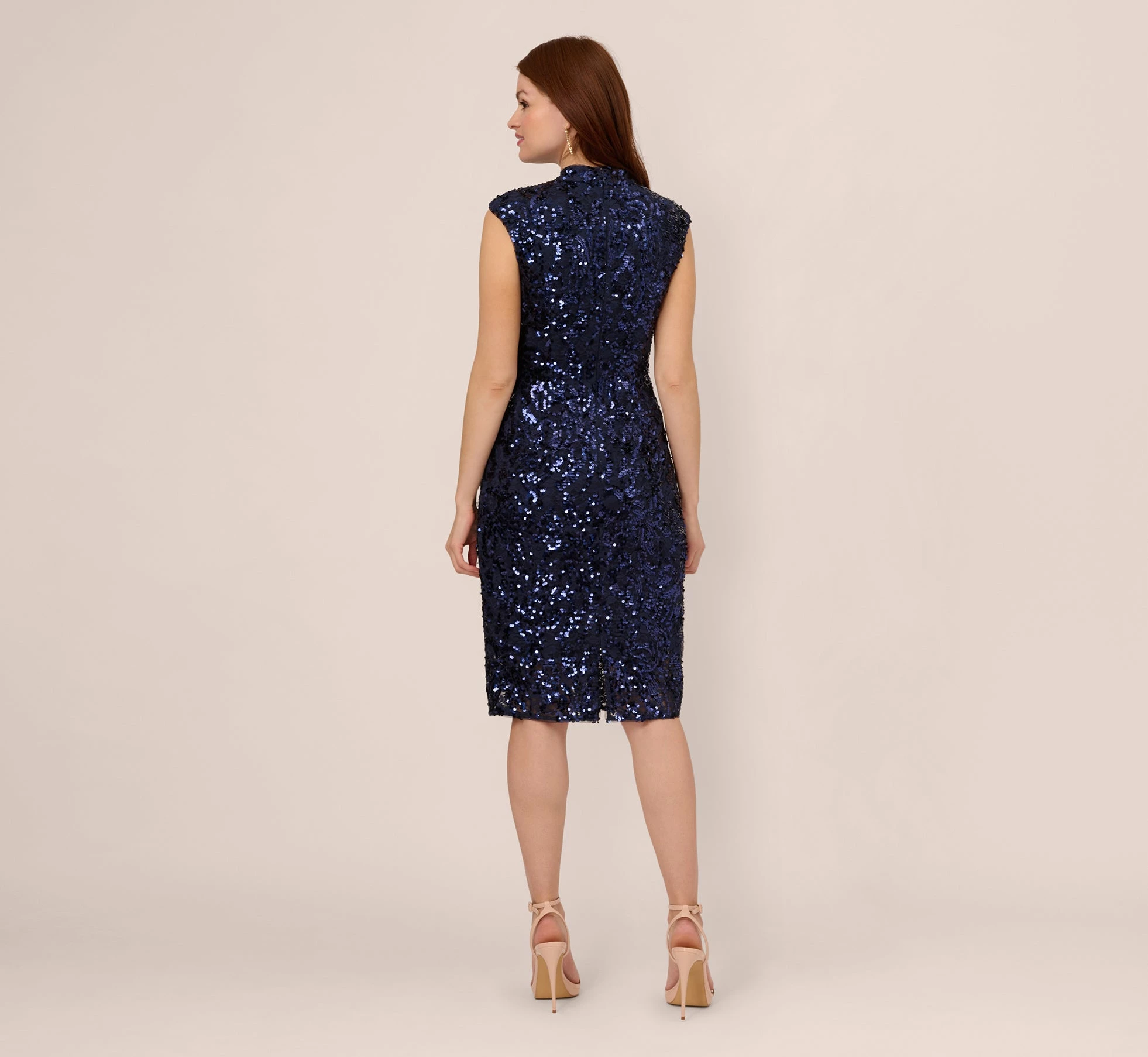 There’s no shortage of beautiful details in this sparkling midi dress. This sheath dress features an extended shoulder sleeve, a mock neckline, and a midi-length skirt. Fully lined and crafted from a novelty lace, this cocktail dress is hand-embellished with sequins and has no waist seam for a comfortable fit. A zipper at the center of the back completes this design. Paired with nude high heels and a satin handbag, this sequin dress is a classy look.