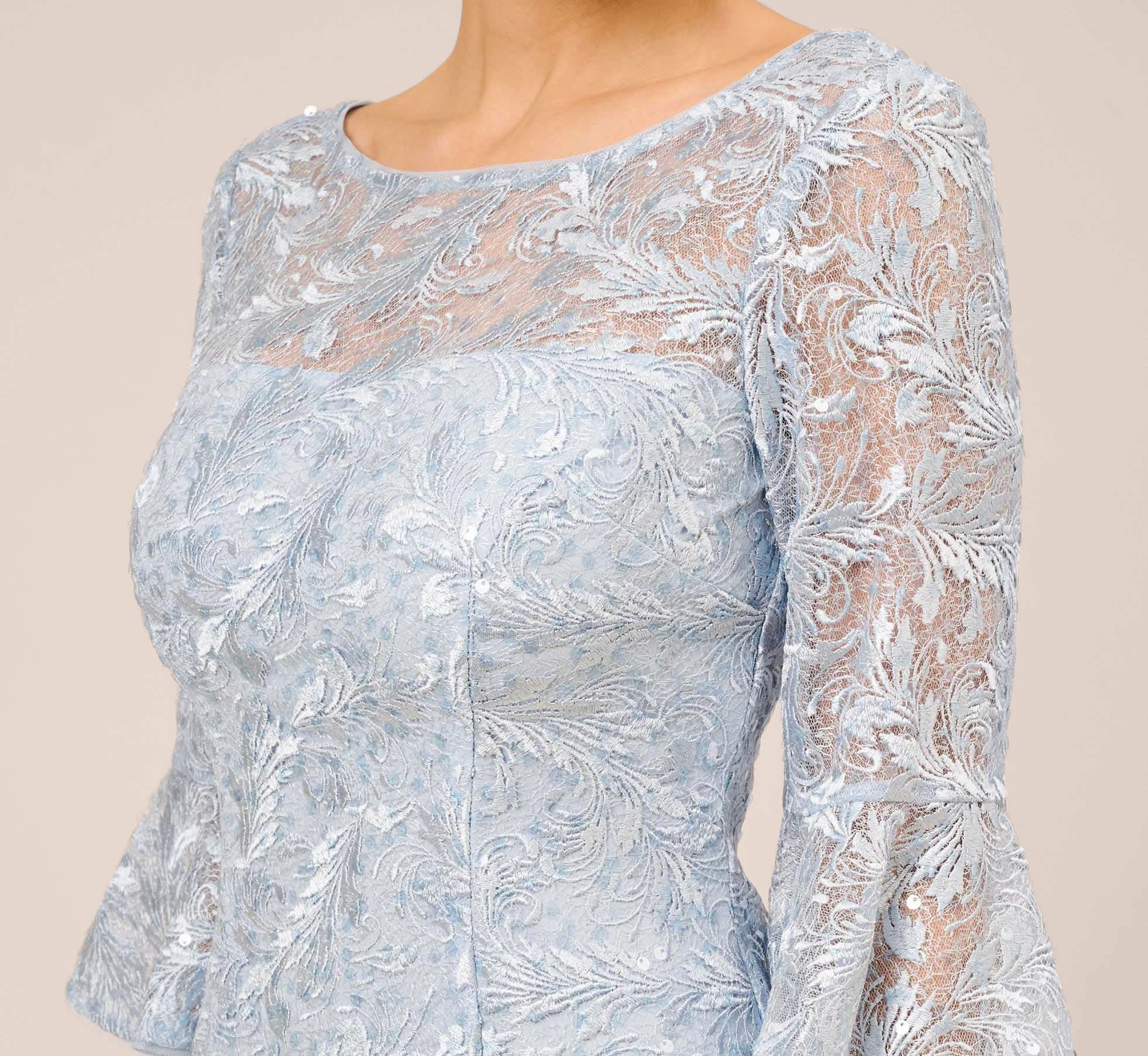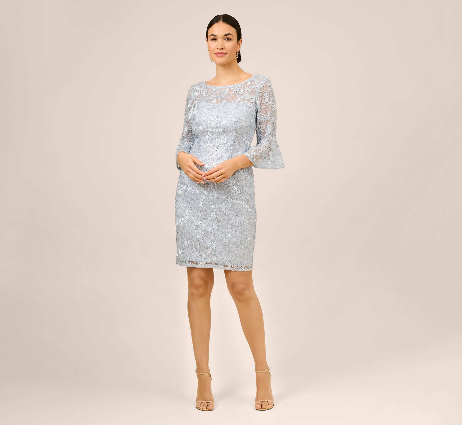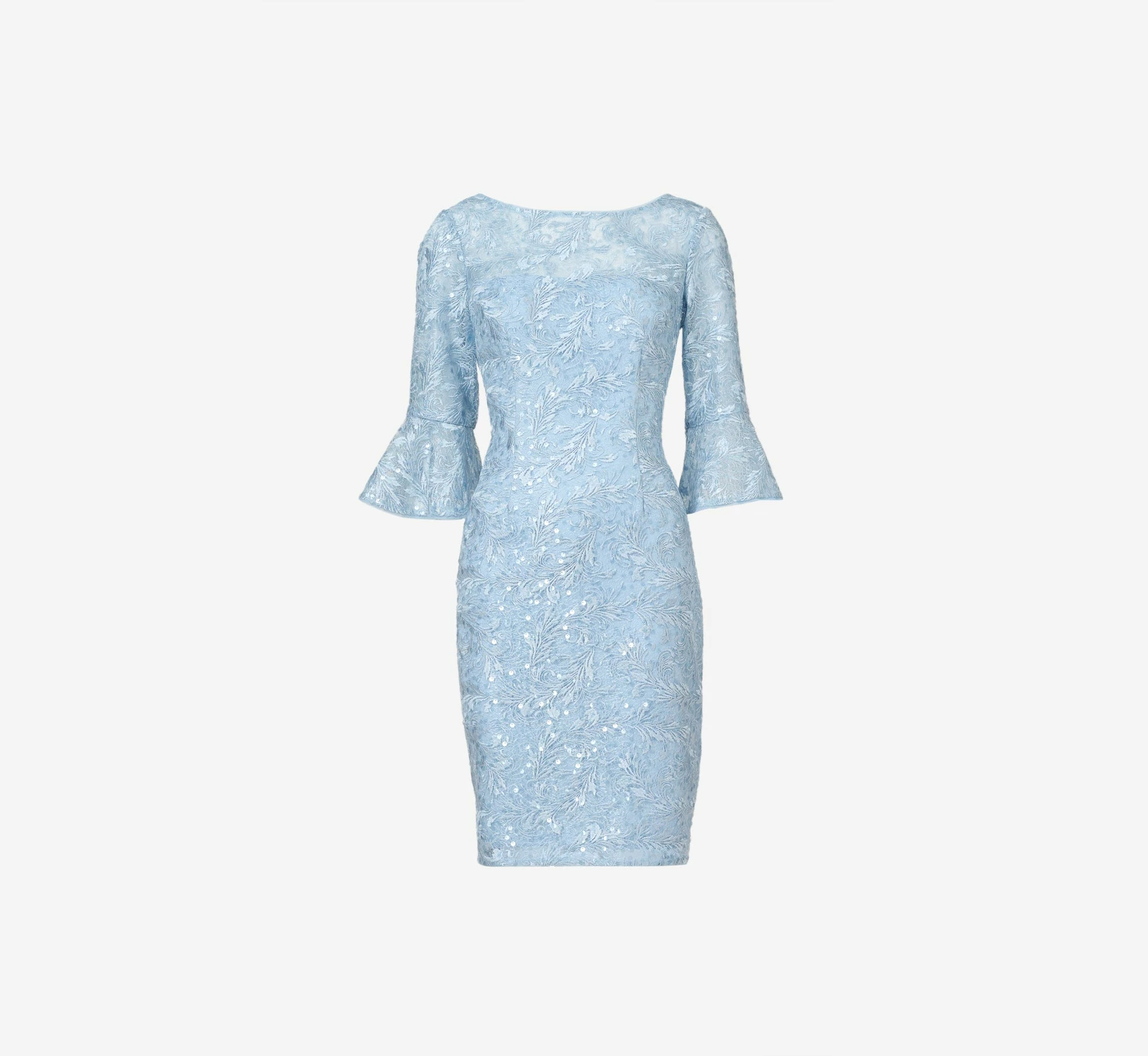 Classic and feminine, our sheath dress is designed in our dainty sequined-embellished guipure lace for undeniable romantic vibes. All the chic details: sheer illusion bateaux neckline with v-back, three-quarter sleeves with bell cuffs and no waist seam (so flattering). Sleek back hook-and-eye/zip closure.